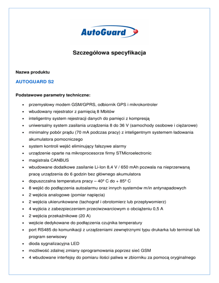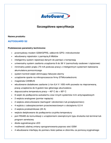 Szczegółowa specyfikacja Nazwa produktu AUTOGUARD S2 Podstawowe parametry techniczne: • przemysłowy modem GSM/GPRS, odbiornik GPS i mikrokontroler • wbudowany rejestrator z pamięcią 8 Mbitów • inteligentny system rejestracji danych do pamięci z kompresją • uniwersalny system zasilania urządzenia 8 do 36 V (samochody osobowe i ciężarowe) • minimalny pobór prądu (70 mA podczas pracy) z inteligentnym systemem ładowania akumulatora pomocniczego • system kontroli wejść eliminujący fałszywe alarmy • urządzenie oparte na mikroprocesorze firmy STMicroelectronic • magistrala CANBUS • wbudowane dodatkowe zasilanie Li-Ion 8,4 V / 650 mAh pozwala na nieprzerwaną pracę urządzenia do 6 godzin bez głównego akumulatora • dopuszczalna temperatura pracy – 40º C do + 85º C • 8 wejść do podłączenia autoalarmu oraz innych systemów m/in antynapadowych • 2 wejścia analogowe (pomiar napięcia) • 2 wejścia ukierunkowane (tachograf i obrotomierz lub przepływomierz) • 4 wyjścia z zabezpieczeniem przeciwzwarciowym o obciążeniu 0,5 A • 2 wejścia przekaźnikowe (20 A) • wejście dedykowane do podłączenia czujnika temperatury • port RS485 do komunikacji z urządzeniami zewnętrznymi typu drukarka lub terminal lub program serwisowy • dioda sygnalizacyjna LED • możliwość zdalnej zmiany oprogramowania poprzez sieć GSM • 4 wbudowane interfejsy do pomiaru ilości paliwa w zbiorniku za pomocą oryginalnego pływaka • wbudowany interfejs EDW do fabrycznego alarmu Mercedesa • wbudowana magistrala do obsługi pastylek „Dallas” (autoryzacja kierowcy) • wbudowany zegar czasu rzeczywistego Funkcjonalność układu nadawczego: • podanie pozycji pojazdu w dowolnym miejscu na terenie Polski i Europy po wysłaniu zapytania ze stacji bazowej lub innego miejsca, • czy też z telefonu komórkowego posiadającego uprawnienia w zależności od wykorzystania potrzeb, • czy urządzenie ma służyć jako zabezpieczenie pojazdu, czy też jako wspomaganie logistyczne firm transportowych, • okresowa transmisja pozycji, kierunku jazdy oraz statusu (rejestracja pozycji), • cykliczne wysyłanie pozycji geograficznej z definiowaną przez operatora częstotliwością, • okresowa transmisja prędkości (rejestracja prędkości) uzyskanie informacji o przekroczeniu określonej przez użytkownika prędkości • informacje o zużyciu paliwa, obrotach silnika (rejestracja parametrów eksploatacyjnych pojazdu) • transmisja dyspozycji ze stacji bazowej do monitorowanych pojazdów, kodowana i szybka transmisja danych do bazy, • definicja dozwolonych obszarów poruszania się – informacje o opuszczeniu wyznaczonego terenu poruszania się, zaprogramowanej trasy, postojów itp. (rejestracja tych danych) • możliwość współpracy z medium teletransmisyjnym GPRS (transmisja danych w sieciach GSM) • uzyskanie informacji o aktualnym napięciu w instalacji elektrycznej pojazdu • uzyskiwanie wszelkich informacji z odbiorników podłączonych do urządzenia (rejestracja tych informacji) • o zaniku sygnału GPS • o zaniku sygnału GSM