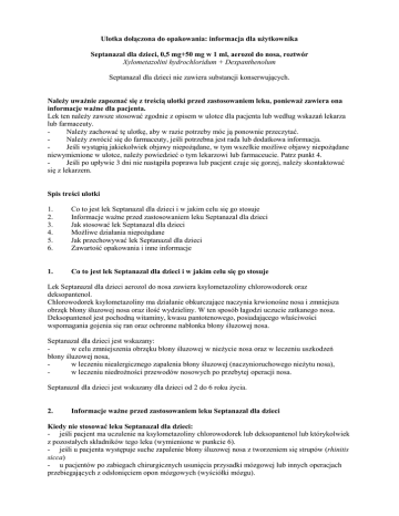 Ulotka dołączona do opakowania: informacja dla użytkownika Septanazal dla dzieci, 0,5 mg+50 mg w 1 ml, aerozol do nosa, roztwór Xylometazolini hydrochloridum + Dexpanthenolum Septanazal dla dzieci nie zawiera substancji konserwujących. Należy uważnie zapoznać się z treścią ulotki przed zastosowaniem leku, ponieważ zawiera ona informacje ważne dla pacjenta. Lek ten należy zawsze stosować zgodnie z opisem w ulotce dla pacjenta lub według wskazań lekarza lub farmaceuty. Należy zachować tę ulotkę, aby w razie potrzeby móc ją ponownie przeczytać. Należy zwrócić się do farmaceuty, jeśli potrzebna jest rada lub dodatkowa informacja. Jeśli wystąpią jakiekolwiek objawy niepożądane, w tym wszelkie możliwe objawy niepożądane niewymienione w ulotce, należy powiedzieć o tym lekarzowi lub farmaceucie. Patrz punkt 4. Jeśli po upływie 3 dni nie nastąpiła poprawa lub pacjent czuje się gorzej, należy skontaktować się z lekarzem. Spis treści ulotki 1. 2. 3. 4. 5. 6. Co to jest lek Septanazal dla dzieci i w jakim celu się go stosuje Informacje ważne przed zastosowaniem leku Septanazal dla dzieci Jak stosować lek Septanazal dla dzieci Możliwe działania niepożądane Jak przechowywać lek Septanazal dla dzieci Zawartość opakowania i inne informacje 1. Co to jest lek Septanazal dla dzieci i w jakim celu się go stosuje Lek Septanazal dla dzieci aerozol do nosa zawiera ksylometazoliny chlorowodorek oraz deksopantenol. Chlorowodorek ksylometazoliny ma działanie obkurczające naczynia krwionośne nosa i zmniejsza obrzęk błony śluzowej nosa oraz ilość wydzieliny. W ten sposób łagodzi uczucie zatkanego nosa. Deksopantenol jest pochodną witaminy, kwasu pantotenowego, posiadającego właściwości wspomagania gojenia się ran oraz ochronne nabłonka błony śluzowej nosa. Septanazal dla dzieci jest wskazany: w celu zmniejszenia obrzęku błony śluzowej w nieżycie nosa oraz w leczeniu uszkodzeń błony śluzowej nosa, w leczeniu niealergicznego zapalenia błony śluzowej (naczynioruchowego nieżytu nosa), w leczeniu niedrożności przewodów nosowych po przebytej operacji nosa. Septanazal dla dzieci jest wskazany dla dzieci od 2 do 6 roku życia. 2. Informacje ważne przed zastosowaniem leku Septanazal dla dzieci Kiedy nie stosować leku Septanazal dla dzieci: - jeśli pacjent ma uczulenie na ksylometazoliny chlorowodorek lub deksopantenol lub którykolwiek z pozostałych składników tego leku (wymienione w punkcie 6). - jeśli u pacjenta występuje suche zapalenie błony śluzowej nosa z tworzeniem się strupów (rhinitis sicca) - u pacjentów po zabiegach chirurgicznych usunięcia przysadki mózgowej lub innych operacjach przebiegających z odsłonięciem opon mózgowych (wyściółki mózgu). Septanazal dla dzieci jest przeciwwskazany u dzieci poniżej 2 roku życia. Ostrzeżenia i środki ostrożności Przed rozpoczęciem stosowania leku Septanazal dla dzieci należy to omówić z lekarzem lub farmaceutą. Zachować szczególną ostrożność stosując Septanazal dla dzieci w przypadku: pacjentów przyjmujących inhibitory monoaminooksydazy (MAO) i inne leki, które mogą zwiększać ciśnienie tętnicze krwi, zwiększonego ciśnienia wewnątrzgałkowego (jaskra), szczególnie w przypadku jaskry z wąskim kątem przesączania, chorób układu krążenia (choroby niedokrwiennej serca, nadciśnienia tętniczego), guza chromochłonnego nadnerczy, chorób metabolicznych (nadczynności tarczycy objawiająca się jako zwiększona potliwość, wzrost temperatury ciała, przyspieszenie czynności serca, cukrzyca), porfirii, rozrostu prostaty. Ze względu na niebezpieczeństwo zaniku błony śluzowej nosa lek można stosować w okresie przewlekłego nieżytu nosa tylko pod nadzorem lekarza. W przypadku niewłaściwego stosowania lub zastosowania nadmiernej ilości aerozolu, lek może powodować ogólnoustrojowe działania niepożądane, szczególnie u dzieci (parz punkt Możliwe działania niepożądane). Nie należy stosować leku Septanazal dla dzieci podczas stosowania innych leków: leków stosowanych w leczeniu grypy, leków na kaszel i przeziębienie zawierających sympatykomimetyki (leków stosowanych w leczeniu nieżytu nosa, takich jak pseudoefedryna, efedryna, fenylefryna, oksymetazolina, ksylometazolina, tramazolina, nafazolina, tuaminoheptan). Równoczesne stosowanie tych leków z Septanazal dla dzieci może prowadzić do działań niepożądanych ze strony układu krążenia i ośrodkowego układu nerwowego. Należy unikać bezpośredniego kontaktu leku z oczami. Dzieci Nie należy stosować dawek większych niż zalecona przez lekarza. Należy skonsultować się z lekarzem w zakresie czasu trwania leczenia i częstości stosowania leku u dzieci. Septanazal dla dzieci, zalecany jest do stosowania u dzieci od 2 do 6 roku życia. Dla dzieci powyżej 6 roku życia, dostępny jest Septanazal dla dorosłych, aerozol do nosa zawierający większą dawkę substancji czynnych. U dzieci lek należy stosować pod nadzorem osoby dorosłej. Jeżeli u dziecka objawy nasilą się lub nie ustąpią po 3 dniach leczenia, należy skonsultować się z lekarzem. Inne leki i lek Septanazal dla dzieci Należy powiedzieć lekarzowi lub farmaceucie o wszystkich lekach stosowanych obecnie lub ostatnio, a także o lekach, które pacjent planuje stosować. Jednoczesne stosowanie leku Septanazal dla dzieci z niektórymi lekami do leczenia depresji (inhibitorami monoaminooksydazy typu tranylcypraminy lub trójpierścieniowymi lekami przeciwdepresyjnymi) i lekami zwiększającymi ciśnienie tętnicze krwi, może powodować podwyższenie ciśnienia tętniczego krwi z powodu działania substancji czynnej na układ krążenia. Jednoczesne stosowanie z lekami stosowanymi w leczeniu grypy oraz sympatykomimetykami zawartymi w lekach na kaszel i przeziębienie (np. pseudoefedryna, efedryna, fenylefryna, oksymetazolina, ksylometazolina, tramazolina, nafazolina, tuaminoheptan) moż