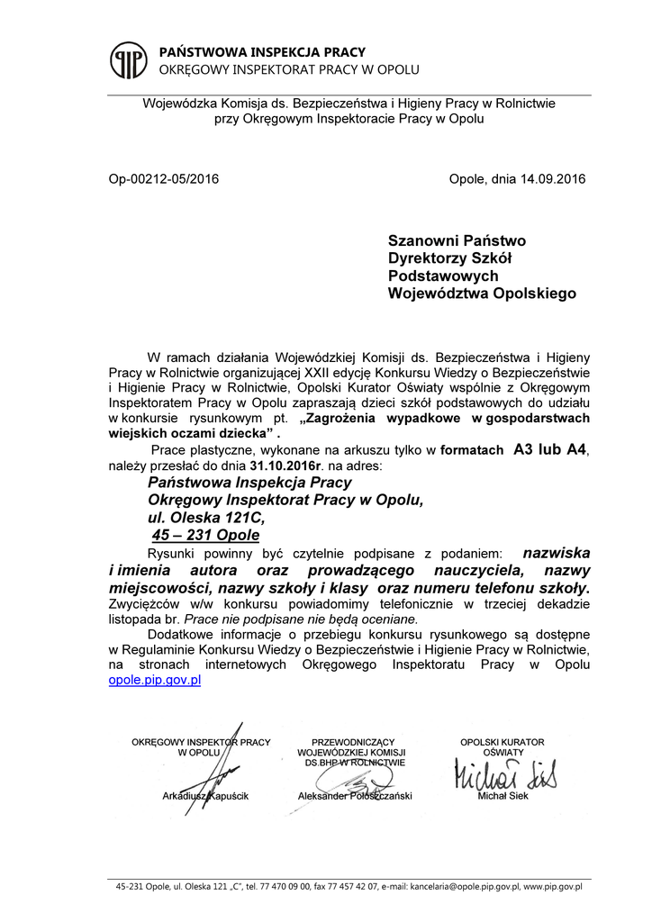 PAŃSTWOWA INSPEKCJA PRACY OKRĘGOWY INSPEKTORAT PRACY W OPOLU Wojewódzka Komisja ds. Bezpieczeństwa i Higieny Pracy w Rolnictwie przy Okręgowym Inspektoracie Pracy w Opolu Op-00212-05/2016 Opole, dnia 14.09.2016 Szanowni Państwo Dyrektorzy Szkół Podstawowych Województwa Opolskiego W ramach działania Wojewódzkiej Komisji ds. Bezpieczeństwa i Higieny Pracy w Rolnictwie organizującej XXII edycję Konkursu Wiedzy o Bezpieczeństwie i Higienie Pracy w Rolnictwie, Opolski Kurator Oświaty wspólnie z Okręgowym Inspektoratem Pracy w Opolu zapraszają dzieci szkół podstawowych do udziału w konkursie rysunkowym pt. „Zagrożenia wypadkowe w gospodarstwach wiejskich oczami dziecka” . Prace plastyczne, wykonane na arkuszu tylko w formatach A3 lub A4, należy przesłać do dnia 31.10.2016r. na adres: Państwowa Inspekcja Pracy Okręgowy Inspektorat Pracy w Opolu, ul. Oleska 121C, 45 – 231 Opole nazwiska i imienia autora oraz prowadzącego nauczyciela, nazwy miejscowości, nazwy szkoły i klasy oraz numeru telefonu szkoły. Rysunki powinny być czytelnie podpisane z podaniem: Zwyciężców w/w konkursu powiadomimy telefonicznie w trzeciej dekadzie listopada br. Prace nie podpisane nie będą oceniane. Dodatkowe informacje o przebiegu konkursu rysunkowego są dostępne w Regulaminie Konkursu Wiedzy o Bezpieczeństwie i Higienie Pracy w Rolnictwie, na stronach internetowych Okręgowego Inspektoratu Pracy w Opolu opole.pip.gov.pl 45-231 Opole, ul. Oleska 121 „C”, tel. 77 470 09 00, fax 77 457 42 07, e-mail: [email protected], www.pip.gov.pl Opole, wrzesień, 2016 rok R E G U L AM I N Konkursu Wiedzy o Bezpieczeństwie i Higienie Pracy w Rolnictwie Wojewódzka Komisja ds. Bezpieczeństwa i Higieny Pracy w Rolnictwie § 1. CEL KONKURSU Konkurs Wiedzy o Bezpieczeństwie i Higienie Pracy w Rolnictwie nazywany dalej Konkursem organizowany jest w dwóch różnych kategoriach uczniów: szkół podstawowych (konkurs plastyczny) szkół gimnazjalnych i ponadgimnazjalnych. (konkurs wiedzy) Konkurs ma na celu popularyzowanie wśród dzieci i młodzieży szkolnej znajomość przepisów i zasad bezpieczeństwa i higieny pracy w zakresie realizacji zadań profilaktyki wypadkowej. § 2. ORGANIZATORZY KONKURSU 1. Organizatorem konkursu jest Państwowa Inspekcja Pracy - Okręgowy Inspektorat Pracy w Opolu w ramach działającej Wojewódzkiej Komisji ds. Bezpieczeństwa i Higieny Pracy w Rolnictwie przy współpracy: Kasy Rolniczego Ubezpieczenia Społecznego Oddział Regionalny w Opolu, Kuratorium Oświaty w Opolu Opolskiego Ośrodka Doradztwa Rolniczego w Łosiowie Komendy Wojewódzkiej Państwowej Państwowej Straży Pożarnej Komendy Wojewódzkiej Policji. 2. Konkurs na poszczególnych etapach organizują komisje powołane przez: a. Państwową Inspekcję Pracy - Okręgowy Inspektorat Pracy w Opolu - komisja wojewódzka, b. Kuratorium Oświaty w Opolu, c. Dyrekcje szkół – komisje szkolne. § 3. UCZESTNICY 1. W konkursie biorą udział uczniowie: a. szkół podstawowych (konkurs plastyczny o tematyce bhp w rolnictwie), b. szkół gimnazjalnych i ponadgimnazjalnych (konkurs wiedzy). 2 2. Uczestników konkursu obowiązuje następujący zakres programowy: wiedza dotycząca zasad i przepisów bhp w zakresie wynikającym ze szkolnego programu nauczania bhp w przedmiotach zawodowych, bezpieczeństwo pracy w rolnictwie (różne dostępne opracowania) wiedza z zakresu bezpieczeństwa pożarowego i ruchu drogowego zasady ochrony zdrowia i życia w gospodarstwie rolnym. Wyd. KRUS (świadczenia rentowe i emerytalne, zasiłki chorobowe). Ponadto wiadomości z powyższego zakresu można uzupełnić korzystając ze strony PIP: www.pip.gov.pl (wybrać na mapce okręg opolski) oraz KRUS: www.krus.pl 3. Konkurs ma charakter indywidualny. Uczestnicy konkursu są reprezentantami szkół (zespołów) w etapie wojewódzkim. § 4. TERMINY 1. Ustala się następujące terminy poszczególnych eliminacji i finału: dla szkół podstawowych, przesyłanie prac plastycznych: do 31 października, dla gimnazjów- eliminacje powiatowe: do 09 listopada, dla szkół ponadgimnazjalnych – zgłaszanie wyłonionych kandydatów: do 31października, finał wojewódzki do 15 grudnia Dokładne terminy eliminacji będą ustalane przez poszczególne komisje i podane na stronie internetowej Okręgowego Inspektoratu Pracy w Opolu oraz w stosownych pismache- mailach kierowanych do szkół ponadgimnazjalnych oraz instytucji nadzorujących szkoły podstawowe i gimnazjalne (UG i UMG). § 5. ORGANIZACJA KONKURSU Uczniowie szkół podstawowych a. dla tej grupy uczniów przeprowadzony zostanie konkurs rysunkowy pod hasłem „Zagrożenia wypadkowe w gospodarstwach wiejskich”, b. szkoły przeprowadzają eliminacje w dwóch poziomach edukacyjnych klas I – III i IV - VI wg własnych ustalonych kryteriów oraz zasad oceniania pod nadzorem powołanych własnych komisji szkolnych, c. rysunki powinny być trwale opisane (nazwisko i imię ucznia i nauczyciela, klasa, adres szkoły, telefon, gmina), d. komisja wojewódzka wyłoni po 5 najlepszych i najciekawszych rysunków w każdym z poziomów edukacyjnych. 2. Uczniowie gimnazjów a. Dla uczniów tych szkół zostaną przeprowadzone eliminacje powiatowe b. Gimnazja typują bądź wyłaniają drogą własnych eliminacji 2 reprezentantów szkoły i zgłaszają ich do końca października, do gimnazjum wyznaczonego w starostwie jako organizatora eliminacji powiatowych. c. W eliminacjach powiatowych (testy pisemne) w każdym starostwie zostaną wyłonieni dwaj najlepsi uczniowie do finału wojewódzkiego. d. w przypadku jednakowej liczby punktów uzyskanych w teście pisemnym przez więcej niż dwie osoby, przewodniczący zespołu (członek Wojewódzkiej Komisji ds. bhp w Rolnictwie) przeprowadzi dogrywkę w formie pytań testowych. 1. 3 2. Uczniowie szkół ponadgimnazjalnych. a. dla młodzieży tych szkół przeprowadzony zostanie konkurs wiedzy, w którym uczniowie odpowiadać będą na pytani