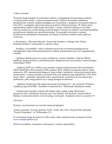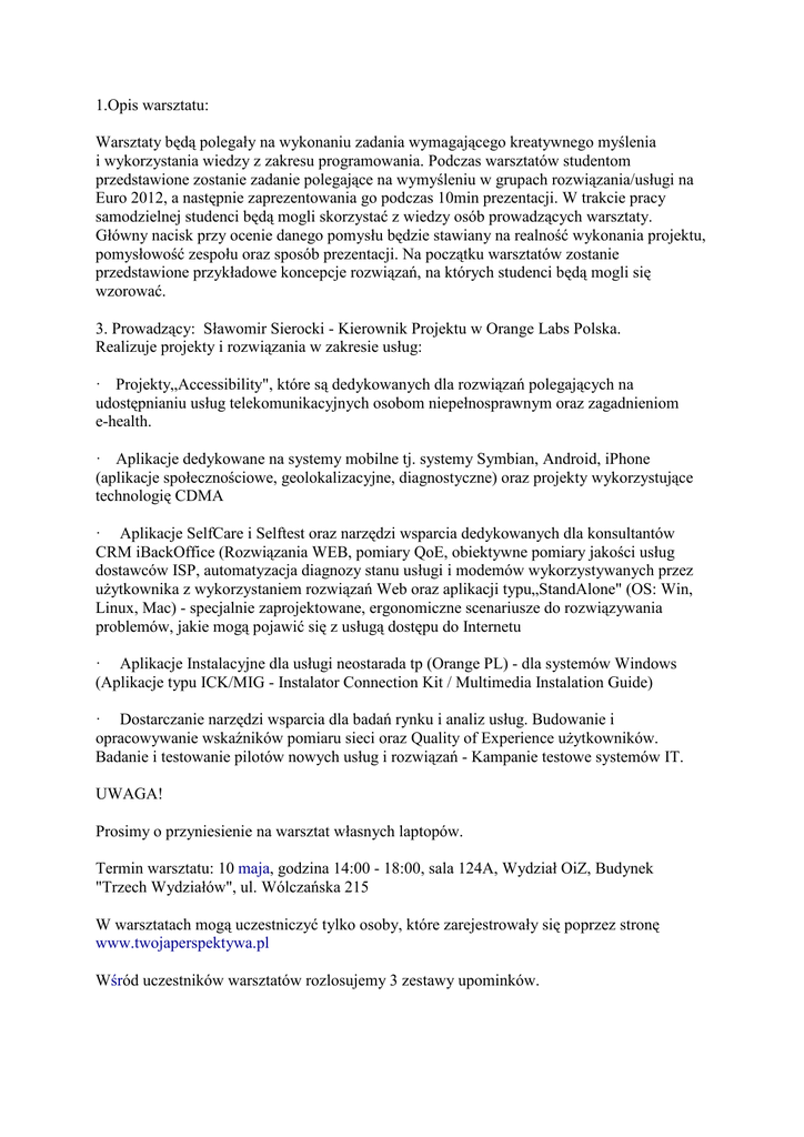 1.Opis warsztatu: Warsztaty będą polegały na wykonaniu zadania wymagającego kreatywnego myślenia i wykorzystania wiedzy z zakresu programowania. Podczas warsztatów studentom przedstawione zostanie zadanie polegające na wymyśleniu w grupach rozwiązania/usługi na Euro 2012, a następnie zaprezentowania go podczas 10min prezentacji. W trakcie pracy samodzielnej studenci będą mogli skorzystać z wiedzy osób prowadzących warsztaty. Główny nacisk przy ocenie danego pomysłu będzie stawiany na realność wykonania projektu, pomysłowość zespołu oraz sposób prezentacji. Na początku warsztatów zostanie przedstawione przykładowe koncepcje rozwiązań, na których studenci będą mogli się wzorować. 3. Prowadzący: Sławomir Sierocki - Kierownik Projektu w Orange Labs Polska. Realizuje projekty i rozwiązania w zakresie usług: · Projekty„Accessibility", które są dedykowanych dla rozwiązań polegających na udostępnianiu usług telekomunikacyjnych osobom niepełnosprawnym oraz zagadnieniom e-health. · Aplikacje dedykowane na systemy mobilne tj. systemy Symbian, Android, iPhone (aplikacje społecznościowe, geolokalizacyjne, diagnostyczne) oraz projekty wykorzystujące technologię CDMA · Aplikacje SelfCare i Selftest oraz narzędzi wsparcia dedykowanych dla konsultantów CRM iBackOffice (Rozwiązania WEB, pomiary QoE, obiektywne pomiary jakości usług dostawców ISP, automatyzacja diagnozy stanu usługi i modemów wykorzystywanych przez uŜytkownika z wykorzystaniem rozwiązań Web oraz aplikacji typu„StandAlone" (OS: Win, Linux, Mac) - specjalnie zaprojektowane, ergonomiczne scenariusze do rozwiązywania problemów, jakie mogą pojawić się z usługą dostępu do Internetu · Aplikacje Instalacyjne dla usługi neostarada tp (Orange PL) - dla systemów Windows (Aplikacje typu ICK/MIG - Instalator Connection Kit / Multimedia Instalation Guide) · Dostarczanie narzędzi wsparcia dla badań rynku i analiz usług. Budowanie i opracowywanie wskaźników pomiaru sieci oraz Quality of Experience uŜytkowników. Badanie i testowanie pilotów nowych usług i rozwiązań - Kampanie testowe systemów IT. UWAGA! Prosimy o przyniesienie na warsztat własnych laptopów. Termin warsztatu: 10 maja, godzina 14:00 - 18:00, sala 124A, Wydział OiZ, Budynek "Trzech Wydziałów", ul. Wólczańska 215 W warsztatach mogą uczestniczyć tylko osoby, które zarejestrowały się poprzez stronę www.twojaperspektywa.pl Wśród uczestników warsztatów rozlosujemy 3 zestawy upominków.