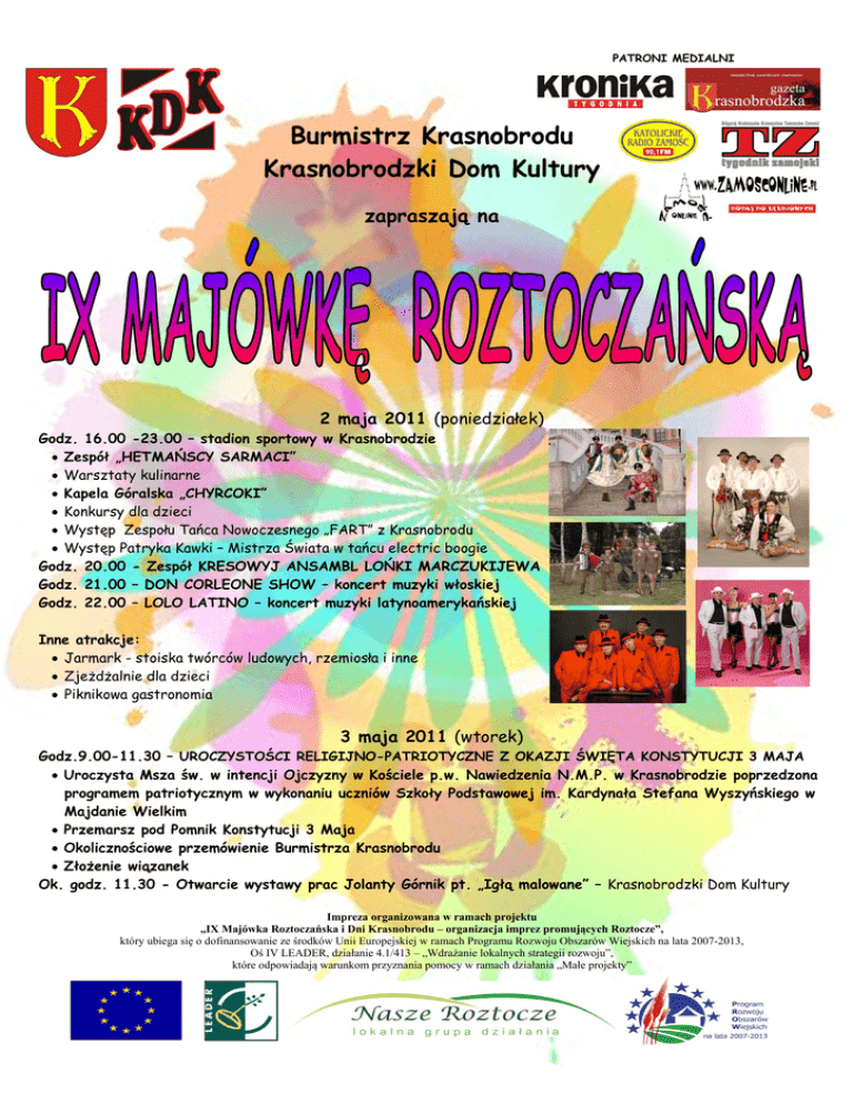 PATRONI MEDIALNI Burmistrz Krasnobrodu Krasnobrodzki Dom Kultury zapraszają na 2 maja 2011 (poniedziałek) Godz. 16.00 -23.00 – stadion sportowy w Krasnobrodzie • Zespół „HETMAŃSCY SARMACI” • Warsztaty kulinarne • Kapela Góralska „CHYRCOKI” • Konkursy dla dzieci • Występ Zespołu Tańca Nowoczesnego „FART” z Krasnobrodu • Występ Patryka Kawki – Mistrza Świata w tańcu electric boogie Godz. 20.00 - Zespół KRESOWYJ ANSAMBL LOŃKI MARCZUKIJEWA Godz. 21.00 – DON CORLEONE SHOW – koncert muzyki włoskiej Godz. 22.00 – LOLO LATINO – koncert muzyki latynoamerykańskiej Inne atrakcje: • Jarmark - stoiska twórców ludowych, rzemiosła i inne • Zjeżdżalnie dla dzieci • Piknikowa gastronomia 3 maja 2011 (wtorek) Godz.9.00-11.30 – UROCZYSTOŚCI RELIGIJNO-PATRIOTYCZNE Z OKAZJI ŚWIĘTA KONSTYTUCJI 3 MAJA • Uroczysta Msza św. w intencji Ojczyzny w Kościele p.w. Nawiedzenia N.M.P. w Krasnobrodzie poprzedzona programem patriotycznym w wykonaniu uczniów Szkoły Podstawowej im. Kardynała Stefana Wyszyńskiego w Majdanie Wielkim • Przemarsz pod Pomnik Konstytucji 3 Maja • Okolicznościowe przemówienie Burmistrza Krasnobrodu • Złożenie wiązanek Ok. godz. 11.30 - Otwarcie wystawy prac Jolanty Górnik pt. „Igłą malowane” – Krasnobrodzki Dom Kultury Impreza organizowana w ramach projektu „IX Majówka Roztoczańska i Dni Krasnobrodu – organizacja imprez promujących Roztocze”, który ubiega się o dofinansowanie ze środków Unii Europejskiej w ramach Programu Rozwoju Obszarów Wiejskich na lata 2007-2013, Oś IV LEADER, działanie 4.1/413 – „Wdrażanie lokalnych strategii rozwoju”, które odpowiadają warunkom przyznania pomocy w ramach działania „Małe projekty”