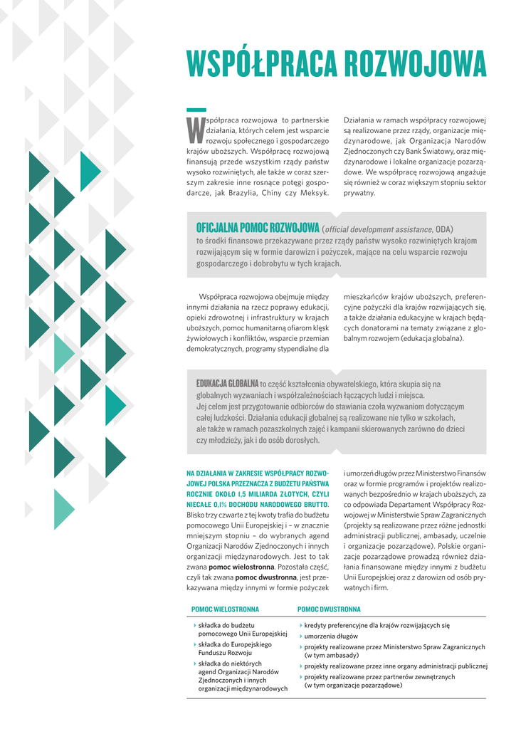Współpraca rozwojowa W spółpraca rozwojowa to partnerskie działania, których celem jest wsparcie rozwoju społecznego i gospodarczego krajów uboższych. Współpracę rozwojową finansują przede wszystkim rządy państw wysoko rozwiniętych, ale także w coraz szerszym zakresie inne rosnące potęgi gospodarcze, jak Brazylia, Chiny czy Meksyk. Działania w ramach współpracy rozwojowej są realizowane przez rządy, organizacje międzynarodowe, jak Organizacja Narodów Zjednoczonych czy Bank Światowy, oraz międzynarodowe i lokalne organizacje pozarządowe. We współpracę rozwojową angażuje się również w coraz większym stopniu sektor prywatny. Oficjalna pomoc rozwojowa (official development assistance, ODA) to środki finansowe przekazywane przez rządy państw wysoko rozwiniętych krajom rozwijającym się w formie darowizn i pożyczek, mające na celu wsparcie rozwoju gospodarczego i dobrobytu w tych krajach. Współpraca rozwojowa obejmuje między innymi działania na rzecz poprawy edukacji, opieki zdrowotnej i infrastruktury w krajach uboższych, pomoc humanitarną ofiarom klęsk żywiołowych i konfliktów, wsparcie przemian demokratycznych, programy stypendialne dla mieszkańców krajów uboższych, preferencyjne pożyczki dla krajów rozwijających się, a także działania edukacyjne w krajach będących donatorami na tematy związane z globalnym rozwojem (edukacja globalna). Edukacja globalna to część kształcenia obywatelskiego, która skupia się na globalnych wyzwaniach i współzależnościach łączących ludzi i miejsca. Jej celem jest przygotowanie odbiorców do stawiania czoła wyzwaniom dotyczącym całej ludzkości. Działania edukacji globalnej są realizowane nie tylko w szkołach, ale także w ramach pozaszkolnych zajęć i kampanii skierowanych zarówno do dzieci czy młodzieży, jak i do osób dorosłych. Na działania w zakresie współpracy rozwojowej Polska przeznacza z budżetu państwa rocznie około 1,5 miliarda złotych, czyli niecałe 0,1% dochodu narodowego brutto. Blisko trzy czwarte z tej kwoty trafia do budżetu pomocowego Unii Europejskiej i – w znacznie mniejszym stopniu – do wybranych agend Organizacji Narodów Zjednoczonych i innych organizacji międzynarodowych. Jest to tak zwana pomoc wielostronna. Pozostała część, czyli tak zwana pomoc dwustronna, jest przekazywana między innymi w formie pożyczek i umorzeń długów przez Ministerstwo Finansów oraz w formie programów i projektów realizowanych bezpośrednio w krajach uboższych, za co odpowiada Departament Współpracy Rozwojowej w Ministerstwie Spraw Zagranicznych (projekty są realizowane przez różne jednostki administracji publicznej, ambasady, uczelnie i organizacje pozarządowe). Polskie organizacje pozarządowe prowadzą również działania finansowane między innymi z budżetu Unii Europejskiej oraz z darowizn od osób prywatnych i firm. Pomoc wielostronna Pomoc dwustronna �składka do budżetu pomocowego Unii Europejskiej �kredyty preferencyjne dla krajów rozwijających się �składka do Europejskiego Funduszu Rozwoju �projekty realizowane przez Ministerstwo Spraw Zagranicznych (w tym ambasady) �składka do niektórych agend Organizacji Narodów Zjednoczonych i innych organizacji międzynarodowych �umorzenia długów �projekty realizowane przez inne organy administracji publicznej �projekty realizowane przez partnerów zewnętrznych (w tym organizacje pozarządowe) Współpraca rozwojowa Polska pomoc koncentruje się na wsparciu krajów Partnerstwa Wschodniego oraz wybranych państw Afryki i Azji. W 2013 roku Polska przystąpiła do prestiżowego Komitetu Pomocy Rozwojowej Organizacji Współpracy Gospodarczej i Rozwoju, zrzeszającego największych dawców pomocy rozwojowej, choć – w porównaniu z innymi państwami Unii Europejskiej i członkami Organizacji Współpracy Gospodarczej i Rozwoju – nie jest szczególnie hojnym donatorem. Bardzo dużo brakuje Polsce zarówno do krajów skandynawskich, które przekazują na ten cel ponad 1% swojego dochodu narodowego brutto, jak i do innych państw w regionie Europy Środkowo-Wschodniej, które przekazują większą pomoc. Poprawy nadal wymaga również jakość pomocy udzielanej przez Polskę. cel Organizacji narodów Zjednoczonych – 0,7% Polska Słowacja Grecja CZechy Słowenia Korea południowa Hiszpania Włochy Portugalia Stany Zjednoczone Japonia Islandia Kanada Austria Australia Nowa Zelandia cały Komitet pomocy rozwojowej Francja Irlandia Niemcy Belgia Szwajcaria Finlandia Holandia Wielka Brytania Dania Norwegia Luksemburg Szwecja Wykres 1. Oficjalna pomoc rozwojowa jako procent dochodu narodowego brutto – wstępne dane Organizacji Współpracy Gospodarczej i Rozwoju za 2014 rok Grupa Zagranica ul. Noakowskiego 10 lok. 6A 00 – 666 Warszawa tel +48 22 299 01 05 [email protected] www.zagranica.org.pl Grupa Zagranica jest federacją 61 organizacji pozarządowych zaangażowanych we współpracę rozwojową i wspieranie demokracji, w pomoc humanitarną i edukację globalną. Więcej o współpracy rozwojowej możesz się dowiedzieć na stronie internetowej Grupy Zagranica: www.zagranica.org.pl/baza-wiedzy Publikacja – wydana dzięki wsparciu finansowemu Komisji Europejskiej – wyraża opinie jedynie jej autorów i Komisja Europejska nie może być pociągnięta do odpowiedzialności w zakresie wykorzystywania informacji w niej zawartych.