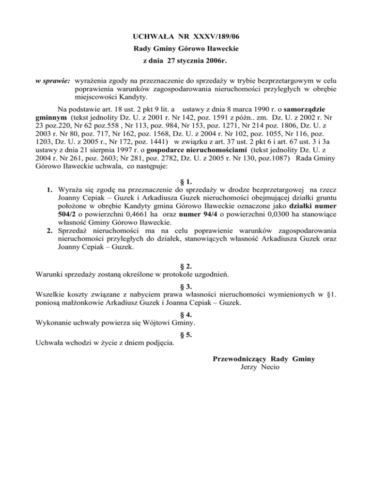 UCHWAŁA NR XXXV/189/06 Rady Gminy Górowo Iławeckie z dnia 27 stycznia 2006r. w sprawie: wyrażenia zgody na przeznaczenie do sprzedaży w trybie bezprzetargowym w celu poprawienia warunków zagospodarowania nieruchomości przyległych w obrębie miejscowości Kandyty. Na podstawie art. 18 ust. 2 pkt 9 lit. a ustawy z dnia 8 marca 1990 r. o samorządzie gminnym (tekst jednolity Dz. U. z 2001 r. Nr 142, poz. 1591 z późn.. zm. Dz. U. z 2002 r. Nr 23 poz.220, Nr 62 poz.558 , Nr 113, poz. 984, Nr 153, poz. 1271, Nr 214 poz. 1806, Dz. U. z 2003 r. Nr 80, poz. 717, Nr 162, poz. 1568, Dz. U. z 2004 r. Nr 102, poz. 1055, Nr 116, poz. 1203, Dz. U. z 2005 r., Nr 172, poz. 1441) w związku z art. 37 ust. 2 pkt 6 i art. 67 ust. 3 i 3a ustawy z dnia 21 sierpnia 1997 r. o gospodarce nieruchomościami (tekst jednolity Dz. U. z 2004 r. Nr 261, poz. 2603; Nr 281, poz. 2782, Dz. U. z 2005 r. Nr 130, poz.1087) Rada Gminy Górowo Iławeckie uchwala, co następuje: § 1. 1. Wyraża się zgodę na przeznaczenie do sprzedaży w drodze bezprzetargowej na rzecz Joanny Cepiak – Guzek i Arkadiusza Guzek nieruchomości obejmującej działki gruntu położone w obrębie Kandyty gmina Górowo Iławeckie oznaczone jako działki numer 504/2 o powierzchni 0,4661 ha oraz numer 94/4 o powierzchni 0,0300 ha stanowiące własność Gminy Górowo Iławeckie. 2. Sprzedaż nieruchomości ma na celu poprawienie warunków zagospodarowania nieruchomości przyległych do działek, stanowiących własność Arkadiusza Guzek oraz Joanny Cepiak – Guzek. § 2. Warunki sprzedaży zostaną określone w protokole uzgodnień. § 3. Wszelkie koszty związane z nabyciem prawa własności nieruchomości wymienionych w §1. poniosą małżonkowie Arkadiusz Guzek i Joanna Cepiak – Guzek. § 4. Wykonanie uchwały powierza się Wójtowi Gminy. Uchwała wchodzi w życie z dniem podjęcia. § 5. Przewodniczący Rady Gminy Jerzy Necio