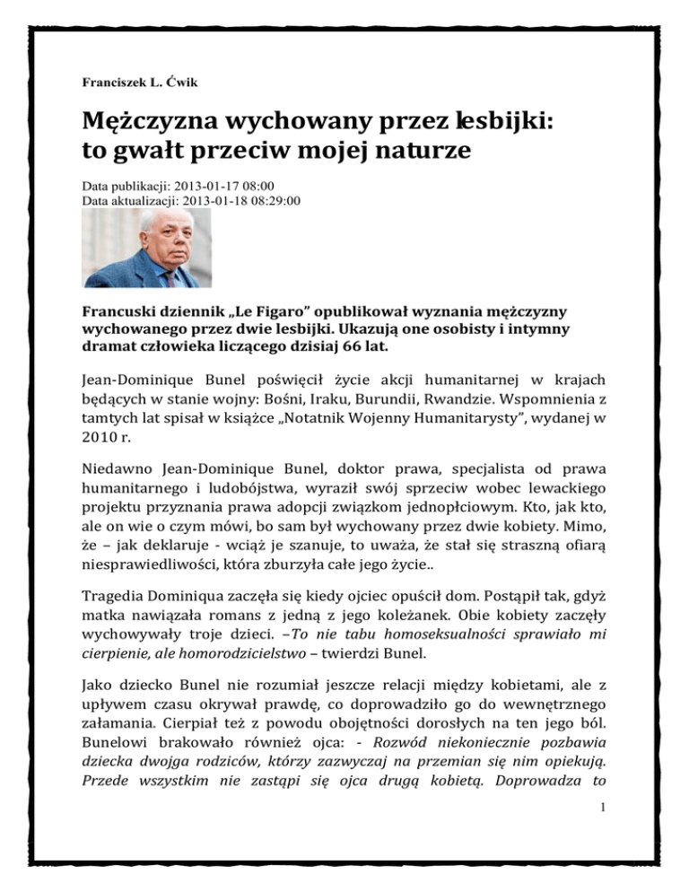 Franciszek L. Ćwik Mężczyzna wychowany przez lesbijki: to gwałt przeciw mojej naturze Data publikacji: 2013-01-17 08:00 Data aktualizacji: 2013-01-18 08:29:00 Francuski dziennik „Le Figaro” opublikował wyznania mężczyzny wychowanego przez dwie lesbijki. Ukazują one osobisty i intymny dramat człowieka liczącego dzisiaj 66 lat. Jean-Dominique Bunel poświęcił życie akcji humanitarnej w krajach będących w stanie wojny: Bośni, Iraku, Burundii, Rwandzie. Wspomnienia z tamtych lat spisał w książce „Notatnik Wojenny Humanitarysty”, wydanej w 2010 r. Niedawno Jean-Dominique Bunel, doktor prawa, specjalista od prawa humanitarnego i ludobójstwa, wyraził swój sprzeciw wobec lewackiego projektu przyznania prawa adopcji związkom jednopłciowym. Kto, jak kto, ale on wie o czym mówi, bo sam był wychowany przez dwie kobiety. Mimo, że – jak deklaruje - wciąż je szanuje, to uważa, że stał się straszną ofiarą niesprawiedliwości, która zburzyła całe jego życie.. Tragedia Dominiqua zaczęła się kiedy ojciec opuścił dom. Postąpił tak, gdyż matka nawiązała romans z jedną z jego koleżanek. Obie kobiety zaczęły wychowywały troje dzieci. –To nie tabu homoseksualności sprawiało mi cierpienie, ale homorodzicielstwo – twierdzi Bunel. Jako dziecko Bunel nie rozumiał jeszcze relacji między kobietami, ale z upływem czasu okrywał prawdę, co doprowadziło go do wewnętrznego załamania. Cierpiał też z powodu obojętności dorosłych na ten jego ból. Bunelowi brakowało również ojca: - Rozwód niekoniecznie pozbawia dziecka dwojga rodziców, którzy zazwyczaj na przemian się nim opiekują. Przede wszystkim nie zastąpi się ojca drugą kobietą. Doprowadza to 1 nieubłaganie do zachwiania równowagi uczuciowej i emocjonalnej dziecka. Wszyscy psychiatrzy powinni potwierdzić, że zarówno ojciec jak i matka w sposób komplementarny powinni kształtować osobowość dziecka – wyznał i zaznaczył, że nigdy nie czuł „obecności ojca” a nierzadko bardzo jej potrzebował. Będąc dzieckiem i nastolatkiem Bunel starał się „jak najsilniej opierać się na mężczyznach z jego otoczenia, którzy zajmowali w jego codzienności przesadne miejsce, czasami nawet niezdrowe”. Mimo, że Jean-Dominique Bunel nie chciał ujawniać konsekwencji wychowania go przez lesbijki, to wyznał, że „całe jego dorosłe życie było naznaczone tym doświadczeniem”. Jego zdaniem, „nie było nigdy poważnych badań nad tym problemem, które przeprowadzono by w niepodważalnych naukowo warunkach i które objęłyby odpowiednią ilość osób”. Obawia się „że wielu mężczyzn i wiele kobiet wychowanych przez homoseksualistów nie otworzy się łatwo i uczciwie przed dziennikarzami na ten tak delikatny temat, bo bolesne jest opowiadania o cierpieniu, które chciano stłumić”. - Gdyby dwie kobiety, które mnie wychowały, były zaślubione po przyjęciu proponowanego prawa przez rząd, to zaangażowałbym się w walkę i wniósł sprawę do Trybunału Europejskiego Praw Człowieka o pogwałcenie mojego prawa do posiadania ojca i matki – konkluduje stanowczo Bunel. 2