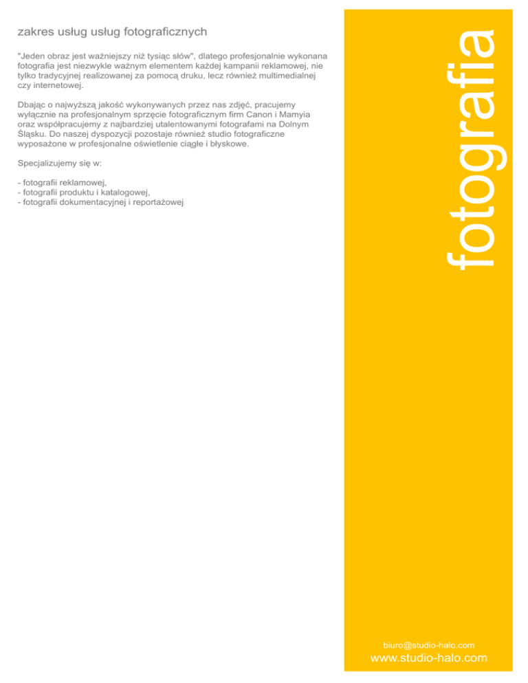 "Jeden obraz jest ważniejszy niż tysiąc słów", dlatego profesjonalnie wykonana fotografia jest niezwykle ważnym elementem każdej kampanii reklamowej, nie tylko tradycyjnej realizowanej za pomocą druku, lecz również multimedialnej czy internetowej. Dbając o najwyższą jakość wykonywanych przez nas zdjęć, pracujemy wyłącznie na profesjonalnym sprzęcie fotograficznym firm Canon i Mamyia oraz współpracujemy z najbardziej utalentowanymi fotografami na Dolnym Śląsku. Do naszej dyspozycji pozostaje również studio fotograficzne wyposażone w profesjonalne oświetlenie ciągłe i błyskowe. Specjalizujemy się w: - fotografii reklamowej, - fotografii produktu i katalogowej, - fotografii dokumentacyjnej i reportażowej fotografia zakres usług usług fotograficznych [email protected] www.studio-halo.com
