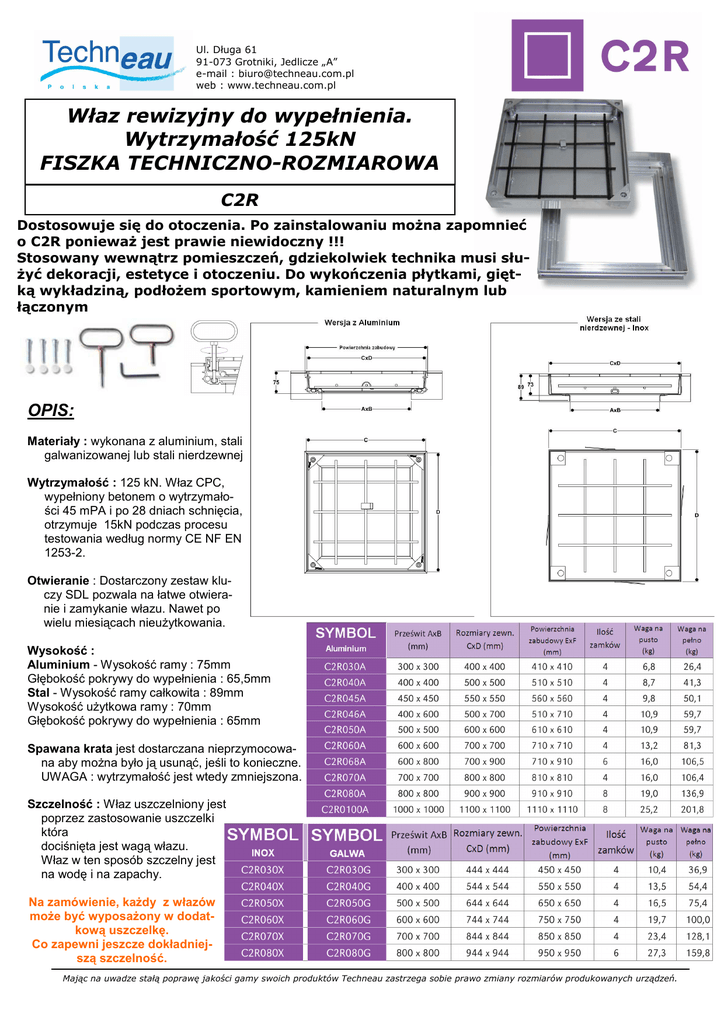 Ul. Długa 61 91-073 Grotniki, Jedlicze „A” e-mail : [email protected] web : www.techneau.com.pl Właz rewizyjny do wypełnienia. Wytrzymałość 125kN FISZKA TECHNICZNO-ROZMIAROWA C2R Dostosowuje się do otoczenia. Po zainstalowaniu można zapomnieć o C2R ponieważ jest prawie niewidoczny !!! Stosowany wewnątrz pomieszczeń, gdziekolwiek technika musi służyć dekoracji, estetyce i otoczeniu. Do wykończenia płytkami, giętką wykładziną, podłożem sportowym, kamieniem naturalnym lub łączonym OPIS: Materiały : wykonana z aluminium, stali galwanizowanej lub stali nierdzewnej Wytrzymałość : 125 kN. Właz CPC, wypełniony betonem o wytrzymałości 45 mPA i po 28 dniach schnięcia, otrzymuje 15kN podczas procesu testowania według normy CE NF EN 1253-2. Otwieranie : Dostarczony zestaw kluczy SDL pozwala na łatwe otwieranie i zamykanie włazu. Nawet po wielu miesiącach nieużytkowania. Wysokość : Aluminium - Wysokość ramy : 75mm Głębokość pokrywy do wypełnienia : 65,5mm Stal - Wysokość ramy całkowita : 89mm Wysokość użytkowa ramy : 70mm Głębokość pokrywy do wypełnienia : 65mm Spawana krata jest dostarczana nieprzymocowana aby można było ją usunąć, jeśli to konieczne. UWAGA : wytrzymałość jest wtedy zmniejszona. Szczelność : Właz uszczelniony jest poprzez zastosowanie uszczelki która dociśnięta jest wagą włazu. Właz w ten sposób szczelny jest na wodę i na zapachy. Na zamówienie, każdy z włazów może być wyposażony w dodatkową uszczelkę. Co zapewni jeszcze dokładniejszą szczelność. Mając na uwadze stałą poprawę jakości gamy swoich produktów Techneau zastrzega sobie prawo zmiany rozmiarów produkowanych urządzeń.