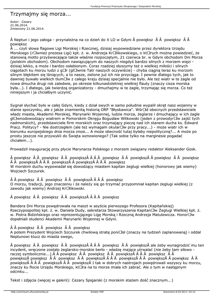 Fundacja Promocji Przemysłu Okrętowego i Gospodarki Morskiej Trzymajmy się morza... Autor: Cezary 21.06.2014. Zmieniony 21.06.2014.  Neptun i jego załoga - przynależna na co dzień do X LO w Gdyni  powiększ   powiększ   powiększ  ... czyli słowa flagowe Ligi Morskiej i Rzecznej, dzisiaj wypowiedziane przez dyrektora Urzędu Morskiego (rÃłwnież prezesa Ligi) kpt. ż. w. Andrzeja KrÃłlikowskiego, o ktÃłrych można powiedzieć, że stanowią motto przyświecające także właśnie rozpoczętym, 21 czerwca br. w Gdyni obchodom Dni Morza (polskim obchodom). Obchodom nawiązującym do naszych niegdyś bardzo silnych z morzem więzi dzisiaj lekko, a może i bardzo osłabionym. Coraz rzadziej słyszymy też o wielkiej miłości i silnych ciągotach ku morzu ludzi z gÃłr (głÃłwnie Tatr naszych oczywiście) - chyba ciągną teraz ku morzom silnym błękitem się lśniących, a to nasze, zielone już ich nie przyciąga. I pewnie dlatego tych, jak to dawniej bywało wielkich tłumÃłw z całego kraju dzisiaj specjalnie nie było. Ale też wiatr w te żagle od nowa dmucha drugi rok zaledwie, po okresie kilkunastoletniej wielkiej flauty (znaczy cisza morska była...). I dlatego, jak twierdzą organizatorzy - dmuchajmy w te żagle, trzymając się morza. Co też niniejszym i ja chciałbym uczynić. Sygnał słychać było w całej Gdyni, kiedy z dział swych w samo południe wypalił okręt nasz wojenny w stanie spoczynku, ale z jakże znamienitą historią ORP "Błyskawica". WśrÃłd obecnych przedstawiciele władz miasta, Akademii Morskiej, Marynarki Wojennej, ludzie morza, żeglarze i dmuchający w ich żagle głÃłwnodowodzący wiatrem w Pomorskim Okręgu Bogusław Witkowski (jeden z prowodyrÃłw zajść tych nadmorskich), przedstawiciele firm morskich oraz trzymający pieczę nad ich stanem ducha ks. Edward Pracz. Politycy? - Nie dostrzegłem (ale też wymagam okularÃłw przy pracy...) - może wiatr ich w kierunku europejskiego dnia morza znosi... A może obecność tutaj byłaby niepolityczną?... A może po prostu jeszcze nie przywykli do Święta wznowionego? (Tak sobie tylko na marginesie pogadać chciałem...). Prowadził inaugurację przy płycie Marynarza Polskiego z morzem związany redaktor Aleksander Gosk.  powiększ   powiększ   powiększ    powiększ   powiększ  powiększ   powiększ   powiększ    powiększ  powiększ    powiększ W morskim duchu wypowiadał się dowodzący miastem kapitan żeglugi wielkiej (honorowy jak wiemy) Wojciech Szczurek.   powiększ   powiększ   powiększ    powiększ O morzu, tradycji, jego znaczeniu i że należy się go trzymać przypomniał kapitan żeglugi wielkiej (z zawodu jak wiemy) Andrzej KrÃłlikowski.  powiększ   powiększ   powiększ    powiększ Bandera Dni Morza powędrowała na maszt w asyście pierwszego Profesora (Kapitańskiej) Rzeczypospolitej kpt. ż. w. Daniela Dudy, sekretarza Stowarzyszenia KapitanÃłw Żeglugi Wielkiej kpt. ż. w. Piotra Bidzińskiego oraz reprezentującego Ligę Morską i Rzeczną Andrzeja Matulewicza. HonorÃłw dopełniali studenci Akademii Marynarki Wojennej w Gdyni.   powiększ   powiększ   powiększ A potem Prezydent Wojciech Szczurek chwilową stratę poniÃłsł (znaczy na tydzień zaplanowaną) i oddał Neptunowi klucz do miasta swego,  powiększ   powiększ   powiększ    powiększ   powiększ ale żeby wynagrodzić mu ten incydent, wręczone zostało żeglarsko-morskie berło - władzę mające utrwalać (nie żeby tam siłowo raczej symbolicznie...).  powiększ   powiększ   powiększ    powiększ   powiększ powiększ   powiększ   powiększ    powiększ   powiększ  powiększ   powiększ    powiększ   powiększ I tak w dobrych nastrojach powędrowali wszyscy ku morzu, znaczy ku flocie Urzędu Morskiego, ktÃłra na to morze miała ich zabrać. Ale o tym w następnym odcinku... Tekst i zdjęcia (więcej w galerii): Cezary Spigarski (z morskim stażem dość znacznym...) http://archiwum.oficynamorska.pl Kreator PDF Utworzono 8-03-2017, 03:12