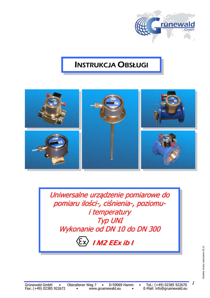 INSTRUKCJA OBSŁUGI Uniwersalne urządzenie pomiarowe do pomiaru ilości-, ciśnienia-, poziomui temperatury Typ UNI Wykonanie od DN 10 do DN 300 Grünewald GmbH • Oberallener Weg 7 • D-59069 Hamm Fax: (+49) 02385 922672 • www.gruenewald.eu • Wszelkie zmiany zastrzeżone 03.12 I M2 EEx ib I • Tel.: (+49) 02385 922670 E-Mail: [email protected] 1 Informacja ogólna Szanowny Kliencie Dostarczony Państwu artykuł jest produktem Firmy GRÜNEWALD GmbH, D-59069 Hamm i skonstruowany jako urządzenie UNI do pomiaru ilości, ciśnienia, temperatury i poziomu, przeznaczone do zastosowania dla ciekłych mediów w zamknietych i pełnych systemach. Prosimy dokładnie przeczytać niniejszą instrukcję obsługi co pozwoli na długie i bezpieczne użytkowanie urządzenia pomiarowego. Celem uzyskania dalszych informacji proszę kierować zapytania do naszego personelu technicznego w Firmie GRÜNEWALD GmbH, Oberallener Weg 7, D-59069 Hamm Tel.: +49 (0)2385 922670, Fax: +49 (0)2385 922672. Internet: www.gruenewald.eu E-Mail: [email protected] Spis treści 3. 4. 5. 6. 7. 8. 9. 10. 11. 12. 13. 14. 15. 16. 17. 18. 19. 20. 21. 22. 23. WSTĘP .........................................................................................................................3 OGÓLNE ZALECENIA ......................................................................................................... 3 2.1 OGÓLNE ZALECENIA DO INSTRUKCJI OBSŁUGI....................................................................... 3 2.2 OGÓLNE ZALECENIA BEZPIECZEŃSTWA............................................................................... 3 OBOWIĄZKI UŻYTKOWNIKA ................................................................................................ 4 OBOWIĄZKI PERSONELU UŻYTKOWNIKA ................................................................................ 5 4.1 KWALIFIKACJE PERSONELU UŻYTKOWNIKA .......................................................................... 5 GWARANCJA I ODPOWIEDZIALNOŚĆ ..................................................................................... 5 ZNAKI BEZPIECZEŃSTWA ................................................................................................... 6 PRZEPISY OCHRONY ŚRODOWISKA ....................................................................................... 6 ZASTOSOWANIE ZGODNIE Z PRZEZNACZENIEM ........................................................................ 7 8.1 ZAKRES ZASTOSOWANIA .............................................................................................. 7 INSTALOWANIE / URUCHAMIANIE / MONTAŻ ........................................................................... 7 USTAWIENIA, WARTOŚCI GRANICZNE I PRZYŁĄCZA .................................................................. 8 10.1 WYKONANIE Z OBROTOWYM WYŁĄCZNIKIEM ........................................................................ 8 10.2 WYKONANIE Z WYŁĄCZNIKIEM DIP .................................................................................. 8 10.3 PODŁĄCZENIE ELEKTRYCZNE .......................................................................................... 9 EKSPLOATACJA, KONSERWACJA I NAPRAWY ............................................................................ 9 TRANSPORT, MAGAZYNOWANIE ......................................................................................... 10 OPIS URZĄDZENIA ......................................................................................................... 11 CHARAKTERYSTYKA PRACY URZĄDZEŃ UNI ........................................................................... 11 INNE ZAGROŻENIA ......................................................................................................... 12 POMOC PRZY ZAKŁÓCENIACH ............................................................................................ 12 ZAKRES DOSTAWY ......................................................................................................... 12 DANE TECHNICZNE / KLUCZ ZNAMIONOWY URZĄDZEŃ UNI........................................................ 13 OCHRONA ŚRODOWISKA ................................................................................................. 14 EG – ORZECZENIE DOPUSZCZENIOWE Z PRÓBY TYPU ............................................................. 14 EG – ORZECZENIE DOPUSZCZENIOWE Z PRÓBY TYPU DLA BEZPIECZNEGO FUNKCJONOWANIA ........... 19 EG-DEKLARACJA ZGODNOŚCI WYROBU ............................................................................... 20 EG-DEKLARACJA ZGODNOŚCI WYROBU DLA BEZPIECZNEGO FUNKCJONOWANIA ............................. 21 Grünewald GmbH • Oberallener Weg 7 • D-59069 Hamm Fax: (+49) 02385 922672 • www.gruenewald.eu • • Tel.: (+49) 02385 922670 E-Mail: [email protected] Wszelkie zmiany zastrzeżone 03.12 1. 2. 2 1. Wstęp Niniejsza instrukcja obsługi urządzenia UNI do pomiaru ilości, ciśnienia, temperatury i poziomu pomoże Państwu bezpiecznie, fachowo i ekonomicznie je użytkować. Przestrzeganie postanowień niniejszej instrukcji pozwoli na: podniesienie poprawności oraz trwałości działania układu pomiarowego, uniknięcia zagrożeń uniknięcia zakłóceń i remontów Niniejsza instrukcja musi być: dostępna w czasie montażu i remontach przeczytana i stosowana przez każdą osobę pracującą z urządzeniem UNI do pomiaru ilości, ciśnienia, temperatury i poziomu. Urządzenia pomiarowe firmy GRÜNEWALD pracują na zasadzie elektromechanicznej. Instrukcje montażu poszczególnych typów czujników jak i grup czujników oraz katalogi produkcji, zawierają dane techniczne mechaniczne i elektryczne. Urządzenie UNI do pomiaru ilości, ciśnienia, temperatury i poziomu zostało skonstruowane zgodnie z obecnym stanem techniki i powszechnie stosowanymi przepisami bezpieczeństwa. Przy nie właściwym użytkowaniu lub zastosowaniu, może wystąpić zagrożenie życia lub okaleczenie zatrudnionego personelu