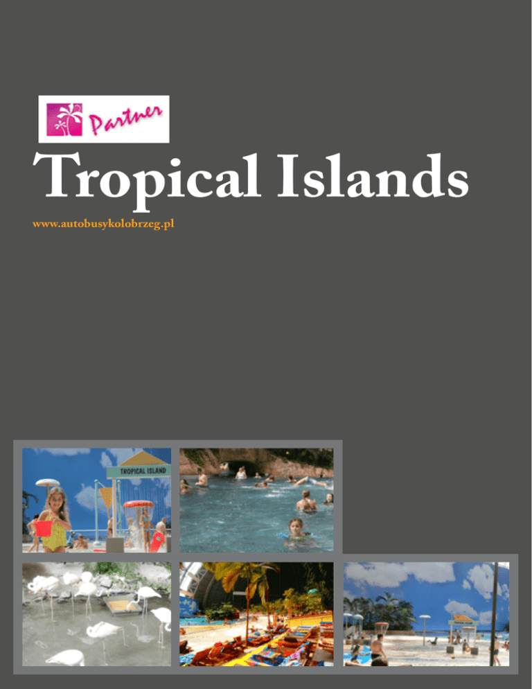 Tropical Islands www.autobusykolobrzeg.pl Tropical Islands wycieczka 1-dniowa W Tropical Islands czeka na Was kraina pełna egzotyki. Zapraszamy na spacery po plaży Morza Południowego, na ekspedycję po Lesie Tropikalnym oraz na relaks w Strefie Saun. Znajdziecie u nas również doskonałą gastronomię oraz ciekawy program rozrywkowy. Zostańcie poszukiwaczami przygód i odkrywcami największej w Europie egzotycznej krainy. Zanurzcie się w innym świecie. Poczujcie atmosferę dalekich lądów i niepowtarzalną magię tropikalnej wyspy. PROGRAM WYCIECZKI Wyjazd z Kołobrzegu o godz 06.00; Przejazd do miejscowości Krausnick pod Berlinem. Zabawa w aquaparku „Tropical Islands”. brodzik dla dzieci, zjeżdżalnie, Morze Południowe z plażą, Laguna Bali z plażą, Island Ballooning, Fitness Club, mini golf, Klub Tropino, Bumper Boats, mini cars, African Jungle Lift, Las Tropikalny – żółwie, ostroszowce, flamingi, ary, pawie, bażanty; Wioska Tropikalna Obiad na terenie parku (fakultatywnie). Powrót do Kołobrzegu o godz. 18.00. ŚWIADCZENIA autokar klasy lux; ubezpieczenie KL i NNW; opieka pilota-przewodnika; obiad w Tropical Islands fakultatywnie 12 euro, wstęp do Tropical Islands 13 euro (dodatkowa opłata). TERMIN - do uzgodnienia KONTAKT Biuro Turystyki i Przewozów PARTNER Sławomir Albiński tel.94 351 74 85 Fax94 351 74 85 Mobile +48 602 339 956 +48 602 664 524 e-mail [email protected] www.autobusykolobrzeg.pl Nr konta SWIFT / BIC /: PKOPPLPW IBAN: PL 05 1240 6508 1111 0000 5407 4996