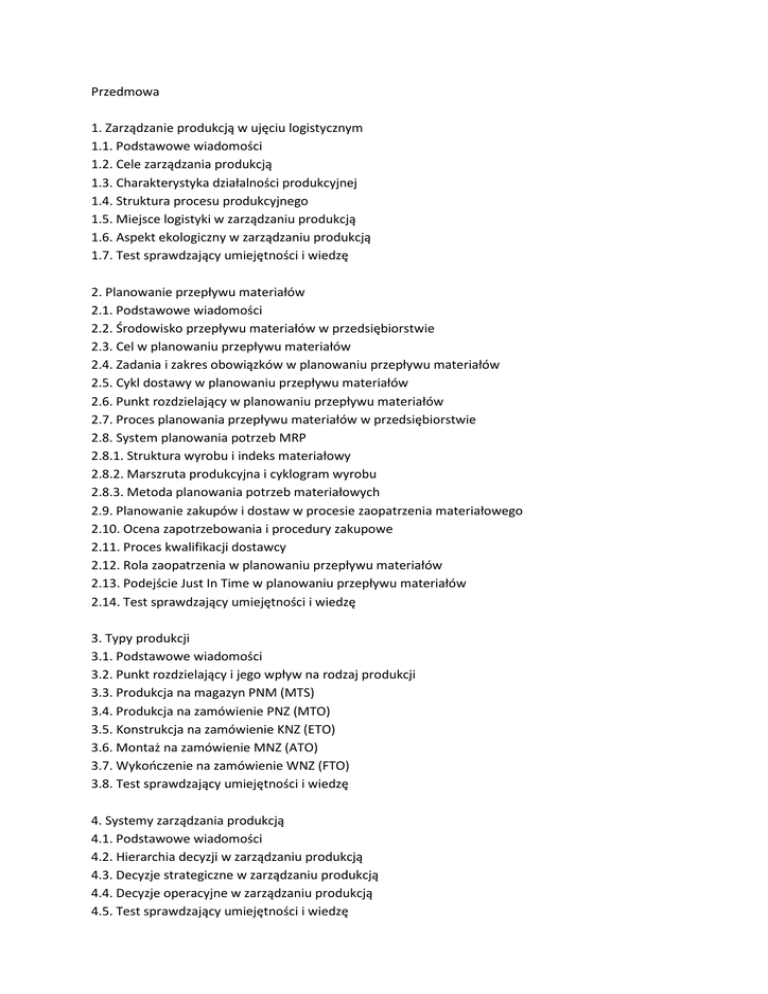 Przedmowa 1. Zarządzanie produkcją w ujęciu logistycznym 1.1. Podstawowe wiadomości 1.2. Cele zarządzania produkcją 1.3. Charakterystyka działalności produkcyjnej 1.4. Struktura procesu produkcyjnego 1.5. Miejsce logistyki w zarządzaniu produkcją 1.6. Aspekt ekologiczny w zarządzaniu produkcją 1.7. Test sprawdzający umiejętności i wiedzę 2. Planowanie przepływu materiałów 2.1. Podstawowe wiadomości 2.2. Środowisko przepływu materiałów w przedsiębiorstwie 2.3. Cel w planowaniu przepływu materiałów 2.4. Zadania i zakres obowiązków w planowaniu przepływu materiałów 2.5. Cykl dostawy w planowaniu przepływu materiałów 2.6. Punkt rozdzielający w planowaniu przepływu materiałów 2.7. Proces planowania przepływu materiałów w przedsiębiorstwie 2.8. System planowania potrzeb MRP 2.8.1. Struktura wyrobu i indeks materiałowy 2.8.2. Marszruta produkcyjna i cyklogram wyrobu 2.8.3. Metoda planowania potrzeb materiałowych 2.9. Planowanie zakupów i dostaw w procesie zaopatrzenia materiałowego 2.10. Ocena zapotrzebowania i procedury zakupowe 2.11. Proces kwalifikacji dostawcy 2.12. Rola zaopatrzenia w planowaniu przepływu materiałów 2.13. Podejście Just In Time w planowaniu przepływu materiałów 2.14. Test sprawdzający umiejętności i wiedzę 3. Typy produkcji 3.1. Podstawowe wiadomości 3.2. Punkt rozdzielający i jego wpływ na rodzaj produkcji 3.3. Produkcja na magazyn PNM (MTS) 3.4. Produkcja na zamówienie PNZ (MTO) 3.5. Konstrukcja na zamówienie KNZ (ETO) 3.6. Montaż na zamówienie MNZ (ATO) 3.7. Wykończenie na zamówienie WNZ (FTO) 3.8. Test sprawdzający umiejętności i wiedzę 4. Systemy zarządzania produkcją 4.1. Podstawowe wiadomości 4.2. Hierarchia decyzji w zarządzaniu produkcją 4.3. Decyzje strategiczne w zarządzaniu produkcją 4.4. Decyzje operacyjne w zarządzaniu produkcją 4.5. Test sprawdzający umiejętności i wiedzę 5. Planowanie produkcji 5.1. Podstawowe wiadomości 5.2. Uwarunkowania planowania produkcji w przedsiębiorstwie 5.3. Planowanie sprzedaży i produkcji 5.4. Planowanie produkcji. Plan główny 5.5. Planowanie zapotrzebowania na zasoby przedsiębiorstw 5.6. Zarządzanie popytem 5.7. Główny harmonogram produkcji 5.8. Normatywy planowania produkcji 5.9. Wielkość partii produkcyjnej 5.10. Wstępne planowanie wykorzystania potencjału produkcyjnego 5.11. Planowanie zadań i obciążeń produkcyjnych. Harmonogram produkcji 5.12. Bilansowanie zadań produkcyjnych ze zdolnością produkcyjną 5.13. Sterowanie produkcją 5.14. Test sprawdzający umiejętności i wiedzę 6. Dokumentacja przepływów produkcyjnych 6.1. Podstawowe wiadomości 6.2. Przykłady dokumentów produkcyjnych 6.3. System informacyjny planowania przepływów produkcyjnych 6.4. Systemy informatyczne wspomagające zarządzanie produkcją 6.5. Test sprawdzający umiejętności i wiedzę 7. Infrastruktura procesów produkcyjnych 7.1. Podstawowe wiadomości 7.2. Środki transportu wewnętrznego wykorzystywane w procesie produkcji 7.3. Wyznaczanie parametrów środków transportu wewnętrznego niezbędnych do wykonania przepływu produkcyjnego 7.4. Rozwiązania techniczne usprawniające przepływy produkcyjne 7.5. Test sprawdzający umiejętności i wiedzę Słowniczek podstawowych pojęć w językach: polskim, angielskim i niemieckim Wykaz anglojęzycznych skrótów i akronimów Bibliografia