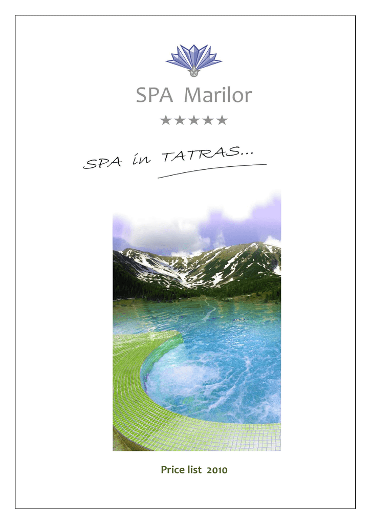 Price list 2010 In search of relaxation, we offer stylish Marilor SPA Centre, and the gold swimming pool with hydro massages, steam sauna with aromatherapy, IR sauna witch walls are covers the Scandinavian spruce, jacuzzi chamber and salt cave made of salt blocks from Bochnia Salt Mine which is the oldest mine in Poland. Each of these places will provide many ways to relax and rest. Above all, our well-qualified team of masseurs and beauticians will help you enjoy the free time, explore the secrets of mind relaxation and body care. OPEN DAILY: SPA Centre- 8 a.m. – 22 p.m. SPA Treatments- 12 a.m. – 22 p.m. Villa Marilor Hotel & SPA Ul. Kościuszki 18, 34-500 ZAKOPANE Tel: +48 18 2000 670, +48 18 2000 680 [email protected] DIBI is an Italian line of cosmetics based on the most-advanced biotechnology and clinical research supported by cosmetology. The whole range of products for face and body is supported by technologically advanced equipment, which enhances the condition of the skin and helps to deal with silhouette imperfections. DIBI FACIAL TREATMENTS Skin Renew (1 day) 140 pln MANUAL MICRODERMABRASION – EXFOLIATING OXYGEN SKIN TREATMENT Skin Renew (2 days) 200 pln FIRST DAY- MANUAL MICRODERMABRASION – EXFOLIATING OXYGEN SKIN TREATMENT, SECOND DAY- COMBINED WITH DETOX AND LYMPHATIC DRAINAGE. Sensitive Skin Face 260 pln NURTURING TREATMENT FOR DELICATE AND SENSITIVE SKIN, PROTECTING FROM POLLUTION Sensitive Skin Eyes 190 pln SOOTHING EYE AREA TREATMENT Sensitive Skin Face & Eyes 370 pln SOOTHING TREATMENT FOR FACE AND EYES AREA, PROTECTING THE SKIN FROM POLLUTION Time Return 290 pln INTENSIVE ANTI-WRINKLE TREATMENT Time Return Eyes 190 pln INTENSIVE ANTI-WRINKLE TREATMENT FOR EYE AREA Age Repair 370 pln FIRMING TREATMENT FOR MATURE SKIN Lifting 320 pln CONTOUR SHAPING FACIAL TREATMENT Hydra System 190 pln INTENSIVELY MOISTURIZING TREATMENT Hydra System Collagen 370 pln INTENSIVELY MOISTURIZING TREATMENT WITH THE USE OF COLLAGEN PAD Hi-White 370 pln ILLUMINATING TREATMENT ELIMINATING SKIN DISCOLOURATIONS Impure Skin MATTIFYING TREATMENT FOR OILY AND POLLUTED SKIN 290 pln DIBI BODY TREATMENTS Body Starter 170 pln EXFOLIATING AND REGENERATING TREATMENT Body Lift 310 pln TREATMENT IMPROVING THE SUPPLENESS OF SKIN Meso System 200 pln INTENSIVE ANTICELLULITE TREATMENT Specyfic Zone Arms 150 pln ARMS SHAPING TREATMENT Specyfic Zone Bust 150 pln BREAST CONTOURING TREATMENT Specyfic Zone Weist 150 pln WAIST SHAPING TREATMENT Professional Hands 60 pln ILLUMINATING TREATMENT WITH STRONG ANTI-AGING INFLUENCE FOR HANDS SKIN TREATMENTS WITH SPA COSMETIC DEVICES Exfoliating Ultrasound Facial Treatment 50 pln PEELING WITH THE USE OF ULTRASOUND TECHNOLOGY Dibi Body Tonic 350 pln TREATMENT OF THE IMPERFECTIONS CAUSED BY FATTY DEPOSITS, „ORANGE PEEL” AND LOSS OF MUSCULAR TONE Dibi Body Dren 350 pln TREATMENT WHICH FIGHTS THE IMPERFECTIONS CAUSED BY CELLULITE, HELPING DRAINAGE OF EXCESS LIQUIDS AND REDUCING THE PRESENCE OF MICRO AND MACRO NODULES OLOS holistic concept of cosmetics care is drawing its energy from natural sources. It is bliss for the body and senses. Treatments are based on natural products like pumpkin, marine plancton, sea algae, wild fruits and rice. During every La Culla treatment the traditional techniques of facial and body massage work together with music therapy, aromatherapy and colourteraphy. OLOS FACIAL TREATMENTS Nutrymenti Frutti di Bosco 200 pln SOOTHING TREATMENT BASED ON FOREST FRUIT, FOR DELICATE AND SENSITIVE SKIN Nutrymenti Nettare di Zucca 220 pln NORMALISING AND MATTING TREATMENT BASED ON PUMPKIN, FOR COMBINATION SKIN Herbarium 200 pln ANTI-AGING AND MOISTURISING TREATMENT FOR NORMAL AND DEHYDRATED SKIN Fitomarina 200 pln MOISTURISING TREATMENT BASED ON SEA ALGAE, FOR DRY AND NORMAL SKIN Fitomarina with Algae Mask 250 pln MOISTURISING TREATMENT BASED ON SEA ALGAE, FOR DEHYDRATED SKIN Fitomarina Eyes 120 pln MOISTURISING TREATMENT FOR EYE AREA Algae Mask 40 pln SOOTING MASK AFTER CAVITATION PEELING OR MANUAL CLEANSING Puriderm 170 pln NORMALISING AND CLEANSING TREATMENT FOR OILY AND PROBLEM SKIN Glyco Program 250 pln DEEPLY REGENERATING, ANTI-OXIDANT TREATMENT BASED ON GLYCOLIC ACID AND VITAMINS A,E AND LYCOPENE EXTRACT Biostaminalia 250 pln REJUWENATING AND RESTORATIVE TREATMENT BASED ON APPLE STEAM CELLS OLOS BODY TREATMENTS Energia Bianca Feet SPA 140 pln NOURISHING FEET TREATMENT BASED ON YOGHURT, MUESLI AND HONEY Energia Bianca Body and Feet 300 pln TONING AND FIRMING TREATMENT BASED ON YOGHURT, MUESLI AND HONEY Nutrimenti Delizia di Riso 300 pln BODY SHAPING AND SLIMMING TREATMENT BASED ON RICE Phytodren INTENSE DRAINAGE TREATMENT 250 pln THALMER beauty and well-being rituals inspired by thalassotherapy and thermal spas. Cosmetics based on natural marine substances like crystal clear thermal spring water, clay and mud packs with excellent beneficial properities. Variety of SPA programmes for face and body brings you endless regenerating experience perfect to regain energy and relax the mind. THALMER FACIAL TREATMENTS Anti-Age Treatment 300 pln ANTI-WRINKLE TREATMENT Ozone Protection 250 pln MOISTURISING AND VITALISING TREATMENT, ENERGY FROM THE SEA THALMER BODY TREATMENTS Exfoliate 170 pln INTENSE EXFOLIATING TREATMENT, BASED ON SEA SALT AND SEAWEED Oxygenate 280 pln OXYGENATING TREATMENT TO STIMULATE MICROCIRCULATION, GIVING THE EFFECT OF BETTER NUTRITION OF THE SKIN Hydrate 300 pln HIGHLY MOISTURISING TREATMENT ON THE BASIS OF MARINE PLANKTON AND ALGAE CHLORELLA VULGARIS Reduce 300 pln FAT REDUCING TREATMENT BY WARM MARINE ALGAE MOUSSE SPIRIT OF THE VOLCANO- ONLY FOR MEN Facial treatment – Territoria Anima di Vulcano 220 pln MINERALISING TREATMENT WITH THE USE OF VOLCANIC STONES FOR STRESSED SKIN Body treatment – THALMER thalasso spa REMINERALISING TREATMENT FOR TIRED AND DRY SKIN, DERIVING ITS ENERGY FROM THE DEPTHS OF THE SEA 250 pln La culla is a place beyond time, where body, mind and soul become one in a new holistic dimension. The treatment in 