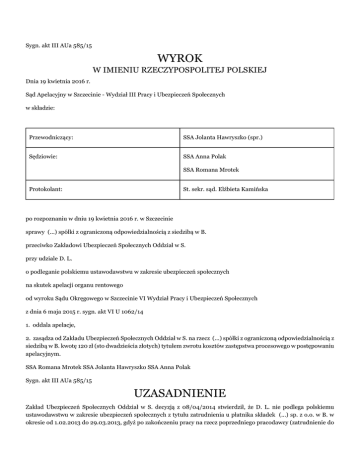 Sygn. akt III AUa 585/15 WYROK W IMIENIU RZECZYPOSPOLITEJ POLSKIEJ Dnia 19 kwietnia 2016 r. Sąd Apelacyjny w Szczecinie - Wydział III Pracy i Ubezpieczeń Społecznych w składzie: Przewodniczący: SSA Jolanta Hawryszko (spr.) Sędziowie: SSA Anna Polak SSA Romana Mrotek Protokolant: St. sekr. sąd. Elżbieta Kamińska po rozpoznaniu w dniu 19 kwietnia 2016 r. w Szczecinie sprawy (...) spółki z ograniczoną odpowiedzialnością z siedzibą w B. przeciwko Zakładowi Ubezpieczeń Społecznych Oddział w S. przy udziale D. L. o podleganie polskiemu ustawodawstwu w zakresie ubezpieczeń społecznych na skutek apelacji organu rentowego od wyroku Sądu Okręgowego w Szczecinie VI Wydział Pracy i Ubezpieczeń Społecznych z dnia 6 maja 2015 r. sygn. akt VI U 1062/14 1. oddala apelacje, 2. zasądza od Zakładu Ubezpieczeń Społecznych Oddział w S. na rzecz (...) spółki z ograniczoną odpowiedzialnością z siedzibą w B. kwotę 120 zł (sto dwadzieścia złotych) tytułem zwrotu kosztów zastępstwa procesowego w postępowaniu apelacyjnym. SSA Romana Mrotek SSA Jolanta Hawryszko SSA Anna Polak Sygn. akt III AUa 585/15 UZASADNIENIE Zakład Ubezpieczeń Społecznych Oddział w S. decyzją z 08/04/2014 stwierdził, że D. L. nie podlega polskiemu ustawodawstwu w zakresie ubezpieczeń społecznych z tytułu zatrudnienia u płatnika składek (...) sp. z o.o. w B. w okresie od 1.02.2013 do 29.03.2013, gdyż po zakończeniu pracy na rzecz poprzedniego pracodawcy (zatrudnienie do 31/01/2013 w Agencji (...) sp. z o.o.), a przed kolejnym zatrudnieniem u innego pracodawcy (od 01/02/2013 w (...) sp. z o.o.) nie powrócił na terytorium Polski, a tym samym nie spełnił warunku delegowania do Belgii, gdzie podjął pracę. W odwołaniu od decyzji płatnik składek - spółka (...) wniósł o jej zmianę poprzez stwierdzenie, że zainteresowany D. L. podlega polskiemu ustawodawstwu w zakresie ubezpieczeń społecznych z tytułu zatrudnienia u płatnika w okresie od 1/02/2013 r. do 29/03/2013 r., a nadto o zasądzenie od organu rentowego zwrotu kosztów zastępstwa procesowego według norm przepisanych. W odpowiedzi na odwołanie organ rentowy wniósł o jego oddalenie i zasądzenie zwrotu kosztów zastępstwa procesowego według norm przepisanych. Sąd Okręgowy w Szczecinie VI Wydział Pracy i Ubezpieczeń Społecznych wyrokiem z 6 maja 2015 r. zmienił zaskarżoną decyzję w ten sposób, że stwierdził iż D. L. podlega polskiemu ustawodawstwu w zakresie ubezpieczeń społecznych z tytułu zatrudnienia w (...) spółce z ograniczoną odpowiedzialnością z siedzibą w B. w okresie od 1/02/2013 do 29/03/2013r. (pkt I wyroku) i zasądził od Zakładu Ubezpieczeń Społecznych Oddziału w S. na rzecz (...) spółki z ograniczoną odpowiedzialnością z siedzibą w B. kwotę 60 złotych tytułem zwrotu kosztów procesu (pkt II). Sąd okręgowy ustalił, że w okresie od 1.12.2012 do 21.12.2012, a następnie w okresie od 7.01.2013 do 31.01.2013 D. L. był zatrudniony na podstawie umów o pracę na czas określony (umowy z 27.11.2012 r. oraz z 2.01.2013 r.) w Agencji (...) na stanowisku pracownika pomocniczego w fabryce prefabrykatów betonowych w pełnym wymiarze czasu pracy. Na podstawie tych umów świadczył pracę na rzecz pracodawcy - użytkownika (...) z siedzibą w Belgii. Miejscem świadczenia pracy była Belgia. Zakład Ubezpieczeń Społecznych Oddział w S., działając na wniosek płatnika składek – Agencji (...) sp. z o.o. - wystawił zaświadczenia o ustawodawstwie właściwym, stwierdzające że w okresie od 1.12.2012 do 21.12.2012 oraz od 7.01.2013 do 31.01.2013 tj. w czasie wykonywania pracy na rzecz Agencji (...) sp. z o.o. na terenie Belgii, D. L. podlegał w zakresie ubezpieczeń społecznych polskiemu ustawodawstwu. W dniu 28.01.2013 r. D. L. zawarł umowę o pracę na czas określony od 1.02.2013 do 29.03.2013 z innym podmiotem - (...) spółką z ograniczoną odpowiedzialnością. W ramach umowy wykonywał pracę pracownika pomocniczego w fabryce prefabrykatów betonowych w pełnym wymiarze czasu pracy na rzecz pracodawcy - użytkownika (...) z siedzibą w Belgii. Miejscem świadczenia pracy była Belgia. Umowę strony faktycznie podpisały w Polsce. D. L. został 28 i 31.01.2013 zwolniony z obowiązku świadczenia pracy na rzecz Agencji (...) sp. z o.o., z którą łączyła go jeszcze wówczas umowa o pracę na czas określony. Zwolnienie to uzyskał po to, by móc przyjechać do Polski i podpisać umowę o pracę ze spółką (...) sp. z o.o. W dniu 11.02.2013 wpłynął do ZUS wniosek (...) sp. z o.o. o wydanie zaświadczenia na formularzu A1 w trybie art. 12 ust. 1 rozporządzenia Parlamentu Europejskiego i Rady (WE) nr (...), potwierdzającego właściwość polskiego ustawodawstwa w zakresie ubezpieczeń społecznych dla D. L. w związku z jego oddelegowaniem na terytorium Belgii w kolejnym okresie, tj. od 1.02.2013 do 29.03.2013. Zakład Ubezpieczeń Społecznych 18.02.2013 r. wystawił zaświadczenia o ustawodawstwie właściwym dla D. L. jako pracownika spółki (...) za okres od 1.02.2013 r. do 29.03.2013 r., potwierdzając tym samym podleganie przez niego w tym czasie polskim ubezpieczeniom społecznym. Po przeprowadzeniu postępowania wyjaśniającego organ rentowy cofnął wydane zaświadczenie A1 dotyczące okresu zatrudnienia D. L. w spółce (...) w okresie od 1.02.2013 do 29.03.2013, informując o tym belgijską instytucję ubezpieczeniową oraz spółkę (...). Sąd okręgowy ustalił, że D. L. był zatrudniony w spółce (...) na podstawie umów o pracę tymczasową także w okresie od 2.07.2012 do 20.07.2012, od 13.08.2012 do 30.11.2012, w ramach których był delegowany do pracy w Belgii na stanowisku pracownika pomocniczego w fabryce prefabrykatów betonowych. Zakład Ubezpieczeń Społecznych Oddział w S. wystawił zaświadczenia o ustawodawstwie właściwym, dotyczące D. L. stwierdzające, że we wskazanym czasie pracy na rzecz spółki (...) na te