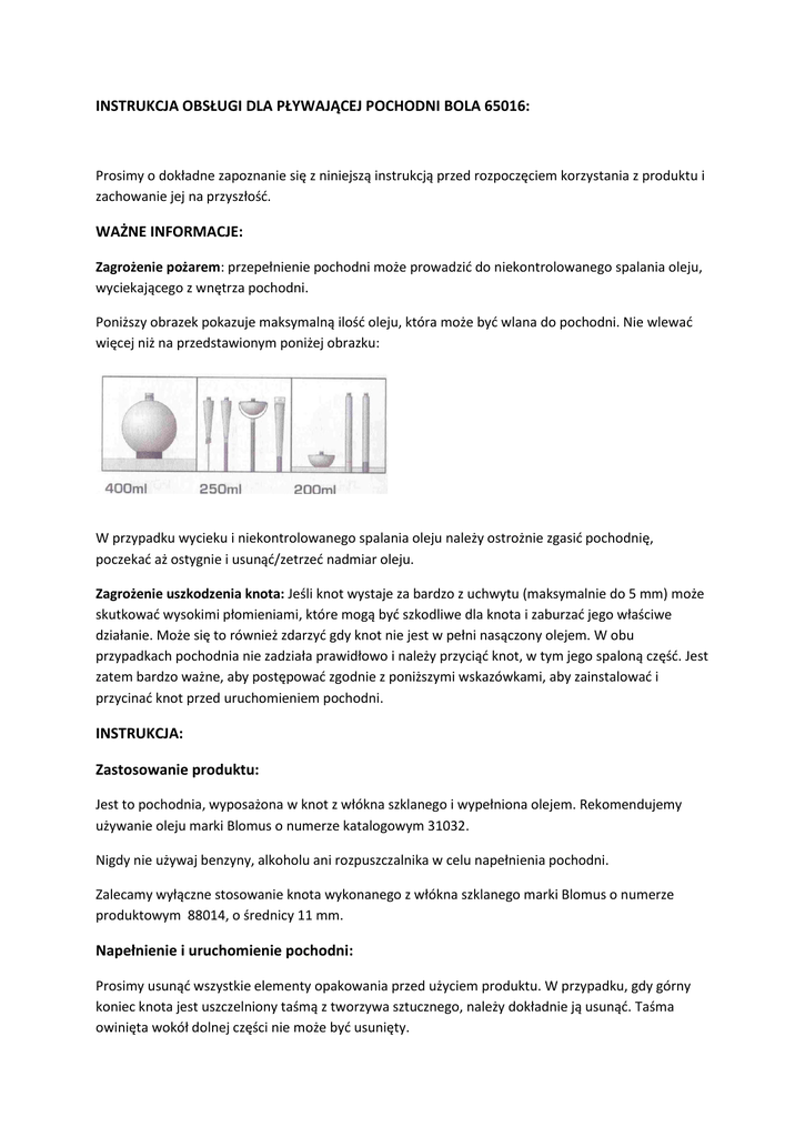 INSTRUKCJA OBSŁUGI DLA PŁYWAJĄCEJ POCHODNI BOLA 65016: Prosimy o dokładne zapoznanie się z niniejszą instrukcją przed rozpoczęciem korzystania z produktu i zachowanie jej na przyszłośd. WAŻNE INFORMACJE: Zagrożenie pożarem: przepełnienie pochodni może prowadzid do niekontrolowanego spalania oleju, wyciekającego z wnętrza pochodni. Poniższy obrazek pokazuje maksymalną ilośd oleju, która może byd wlana do pochodni. Nie wlewad więcej niż na przedstawionym poniżej obrazku: W przypadku wycieku i niekontrolowanego spalania oleju należy ostrożnie zgasid pochodnię, poczekad aż ostygnie i usunąd/zetrzed nadmiar oleju. Zagrożenie uszkodzenia knota: Jeśli knot wystaje za bardzo z uchwytu (maksymalnie do 5 mm) może skutkowad wysokimi płomieniami, które mogą byd szkodliwe dla knota i zaburzad jego właściwe działanie. Może się to również zdarzyd gdy knot nie jest w pełni nasączony olejem. W obu przypadkach pochodnia nie zadziała prawidłowo i należy przyciąd knot, w tym jego spaloną częśd. Jest zatem bardzo ważne, aby postępowad zgodnie z poniższymi wskazówkami, aby zainstalowad i przycinad knot przed uruchomieniem pochodni. INSTRUKCJA: Zastosowanie produktu: Jest to pochodnia, wyposażona w knot z włókna szklanego i wypełniona olejem. Rekomendujemy używanie oleju marki Blomus o numerze katalogowym 31032. Nigdy nie używaj benzyny, alkoholu ani rozpuszczalnika w celu napełnienia pochodni. Zalecamy wyłączne stosowanie knota wykonanego z włókna szklanego marki Blomus o numerze produktowym 88014, o średnicy 11 mm. Napełnienie i uruchomienie pochodni: Prosimy usunąd wszystkie elementy opakowania przed użyciem produktu. W przypadku, gdy górny koniec knota jest uszczelniony taśmą z tworzywa sztucznego, należy dokładnie ją usunąd. Taśma owinięta wokół dolnej części nie może byd usunięty. W zakupionej pochodni knot jest już umieszczony wewnątrz uchwytu na knot. Knot musi byd przycięty tak, aby nie wystawał z uchwytu na więcej niż 5 mm ( jak na obrazku obok). W celu napełnienia pochodni olejem usuo uchwyt na knot wraz z knotem. Pochodnia posiada zabezpieczenie zamknięcia i zabezpieczenie dla knota. Naciśnij delikatnie zabezpieczenie uchwytu knota, jednocześnie skręcając go w kierunku przeciwnym do ruchu wskazówek zegara. Zabezpieczenie zablokuje uchwyt knota. Proszę odkręcid uchwyt w kierunku przeciwnym do ruchu wskazówek zegara (obrazek poniżej). Napełnid pochodnia przez otwór za pomocą lejka (jak na obrazku poniżej). W przypadku rozlania oleju na zewnętrzną częśd pochodni, należy je całkowicie usunąd przed podpaleniem knota. W celu zamknięcia pochodni należy dopasowad uchwyt na knot wraz z knotem z powrotem do otworu. Wkręcisz go, naciskając w dół i skręcając w kierunku ruchu wskazówek zegara, aż do zabezpieczenia zamknięcia. Następnie dokręd poprzez skręcenie w kierunku ruchu wskazówek zegara (jak na obrazku poniżej). Regulacja knota: Proszę sprawdzid ustawienie konta przed użyciem pochodni. Knot nie może wystawad z uchwytu knota więcej niż 5 mm (jak na obrazku obok). Gdy zajdzie taka koniecznośd należy ustawid knot ręcznie. Zapalanie pochodni: Po napełnieniu pochodni należy odczekad co najmniej 5 minut, aż knot nasączy się olejem . Jeżeli po upływie tego czasu olej nie jest widoczny na górze knota , należy odczekad jeszcze 5 minut, aż olej będzie widoczny. Gaszenie pochodni: Nigdy nie zdmuchuj płomienia, zawsze używaj gaśnicy. UWAGA: dmuchanie w płomieo może spowodowad niekontrolowany ruch płomienia. Ważne zasady dotyczące bezpieczeostwa: UWAGA: Zawsze trzymaj olej do lampy poza zasięgiem dzieci. Jeden łyk oleju – nawet ssanie knota – może spowodowad ciężkie obrażenia płuc. UWAGA: W razie połknięcia nie wywoływad wymiotów: należy niezwłocznie zasięgnąd porady lekarza i pokazad tę instrukcję lub etykietę z pojemnika na olej. UWAGA: Zawsze trzymaj tę pochodnię poza zasięgiem dzieci, kiedy pochodnia jest używana bądź przechowywana. UWAGA: Nigdy nie zostawiaj płonącej pochodni bez nadzoru. UWAGA: Pochodnia jest bardzo gorąca kiedy płonie. Nigdy nie dotykaj płonącej pochodni. Produktu należy używad tylko na zewnątrz, nigdy w budynku. Należy przenosid i przechowywad pochodnie tylko kiedy jest zimna i nie zawiera oleju.