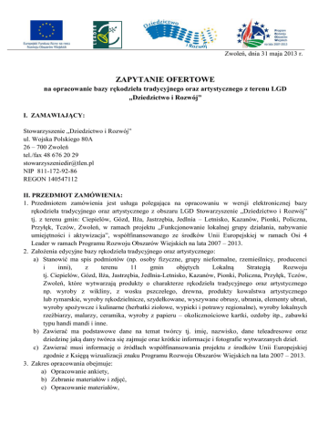 Zwoleń, dnia 31 maja 2013 r. ZAPYTANIE OFERTOWE na opracowanie bazy rękodzieła tradycyjnego oraz artystycznego z terenu LGD „Dziedzictwo i Rozwój” I. ZAMAWIAJĄCY: Stowarzyszenie „Dziedzictwo i Rozwój” ul. Wojska Polskiego 80A 26 – 700 Zwoleń tel./fax 48 676 20 29 [email protected] NIP 811-172-92-86 REGON 140547112 II. PRZEDMIOT ZAMÓWIENIA: 1. Przedmiotem zamówienia jest usługa polegająca na opracowaniu w wersji elektronicznej bazy rękodzieła tradycyjnego oraz artystycznego z obszaru LGD Stowarzyszenie „Dziedzictwo i Rozwój” tj. z terenu gmin: Ciepielów, Gózd, Iłża, Jastrzębia, Jedlnia – Letnisko, Kazanów, Pionki, Policzna, Przyłęk, Tczów, Zwoleń, w ramach projektu „Funkcjonowanie lokalnej grupy działania, nabywanie umiejętności i aktywizacja”, współfinansowanego ze środków Unii Europejskiej w ramach Osi 4 Leader w ramach Programu Rozwoju Obszarów Wiejskich na lata 2007 – 2013. 2. Założenia edycyjne bazy rękodzieła tradycyjnego oraz artystycznego: a) Stanowić ma spis podmiotów (np. osoby fizyczne, grupy nieformalne, rzemieślnicy, producenci i inni), z terenu 11 gmin objętych Lokalną Strategią Rozwoju tj. Ciepielów, Gózd, Iłża, Jastrzębia, Jedlnia-Letnisko, Kazanów, Pionki, Policzna, Przyłęk, Tczów, Zwoleń, które wytwarzają produkty o charakterze rękodzieła tradycyjnego oraz artystycznego np. wyroby z wikliny, z wosku pszczelego, drewna, produkty kowalstwa artystycznego lub rymarskie, wyroby rękodzielnicze, szydełkowane, wyszywane obrusy, ubrania, elementy ubrań, wyroby spożywcze i kulinarne (herbatki ziołowe, wypieki i potrawy regionalne), wyroby lokalnych rzeźbiarzy, malarzy, ceramika, wyroby z papieru – okolicznościowe kartki, ozdoby itp., zabawki typu handi mandi i inne. b) Zawierać ma podstawowe dane na temat twórcy tj. imię, nazwisko, dane teleadresowe oraz dziedzinę jaką dany twórca się zajmuje oraz krótkie informacje i fotografie wytwarzanych dzieł. c) Zawierać musi informację o źródłach współfinansowania projektu z środków Unii Europejskiej zgodnie z Księgą wizualizacji znaku Programu Rozwoju Obszarów Wiejskich na lata 2007 – 2013. 3. Zakres opracowania obejmuje: a) Opracowanie ankiety, b) Zebranie materiałów i zdjęć, c) Opracowanie materiałów, d) Zamieszczenie na stronie internetowej LGD i utworzenie połączeń ze stronami www. wszystkich gmin. 4. Zamawiający wymaga konsultacji na wszystkich etapach pracy, III. PRAWA AUTORSKIE W ramach wykonania zamówienia Wykonawca zobowiązany jest do zakupienia i przekazania Zamawiającemu praw do wykorzystania na wszelkich polach eksploatacji wszystkich wykorzystanych przez Wykonawcę w opracowaniu zdjęć i materiałów. IV. WARUNKI UDZIAŁU W ZAPYTANIU OFERTOWYM Ofertę może złożyć wykonawca, który: 1. Dysponuje niezbędną wiedzą i doświadczeniem, do wykonania zamówienia. 2. Dysponuje niezbędnym sprzętem do realizacji zadania. 3. Wykona przedmiot zamówienia w terminie. 4. Rozliczy się z Zamawiającym na podstawie faktury VAT/ rachunku po protokolarnym przekazania przedmiotu zamówienia. 5. Przyjmie zlecenie przedmiotowego zadania w formie pisemnej umowy między Zamawiającym a Wykonawcą. V. OPIS SPOSOBU PRZYGOTOWANIA OFERTY Oferent powinien stworzyć ofertę na formularzu załączonym do niniejszego zapytania (załącznik nr 1). Oferta powinna być: a) opatrzona pieczątką firmową, b) posiadać datę sporządzenia, c) zawierać adres oferenta, numer telefonu, numer NIP, d) być sporządzona w formie pisemnej w języku polskim, e) podpisana czytelnie przez wykonawcę, f) zawierać wszystkie wymagane załączniki Do oferty obowiązkowo należy dołączyć : 1. Oświadczenie Wnioskodawcy o spełnieniu warunków udziału w postępowaniu (załącznik nr 2), 2. Wykaz zrealizowanych usług o podobnym charakterze (załącznik nr 3), 3. Własny harmonogram realizacji zadania. VI. MIEJSCE ORAZ TERMIN SKŁADANIA OFERT Oferta powinna być przesłana za pośrednictwem: poczty elektronicznej na adres e-mail : [email protected], poczty, kuriera lub też dostarczona osobiście pod adres: Stowarzyszenie „Dziedzictwo i Rozwój” ul. Wojska Polskiego 80A, 26 -700 Zwoleń do dnia 14 czerwca 2013 r. do godz. 15.00. (decyduje data wpływu oferty do biura). Oferty złożone po terminie lub bez obowiązujących załączników lub podpisane przez osoby, które nie są do tego upoważnione nie będą rozpatrywane. Oferent może przed upływem terminu składania ofert zmienić lub wycofać swoją ofertę. W toku badania i oceny ofert Zamawiający może żądać od oferentów wyjaśnień dotyczących treści złożonych ofert. Niniejsze zapytanie zostało opublikowane na stronie internetowej www.dir.zwolen.com Wykonawca pokrywa wszystkie koszty związane z przygotowaniem i dostarczeniem oferty. VII. TERMINY WYKONANIA ZAMÓWIENIA a) listopad 2013 r. VIII. OCENA OFERTY Zamawiający dokona oceny ważnych ofert na podstawie następujących kryteriów: Cena – 100 % IX. INFORMACJE DOTYCZĄCE WYBORU NAJKORZYSTNIEJSZEJ OFERTY O wyborze najkorzystniejszej oferty Zamawiający zawiadomi oferentów za pośrednictwem strony internetowej znajdującej się pod adresem www.dir.zwolen.com X. DODATKOWE INFORMACJE Dodatkowych informacji udzielają pracownicy biura pod numerem telefonu 48 676 20 29 oraz adresem email: [email protected] Zapytanie ofertowe służy rozeznaniu rynku i nie zobowiązuje Stowarzyszenia „Dziedzictwo i Rozwój” do złożenia zamówienia. Zbigniew Buczma Prezes Stowarzyszenia Załączniki: 1. Formularz Oferty. 2. Formularz oświadczenia Wnioskodawcy w postępowaniu. 3. Wykaz zrealizowanych usług o podobnym charakterze. o spełnieniu warunków udziału Załącznik Nr 1 do zapytania ofertowego z dnia 31 maja 2013 r. ........................................................ (pieczęć Wykonawcy) Stowarzyszenie „Dziedzictwo i Rozwój” ul. Wojska Polskiego 80A 26 – 700 Zwoleń FORMULARZ OFERTY odpowiadając na zapytanie d