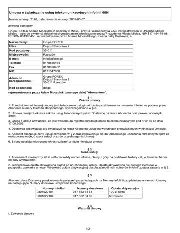 Umowa o świadczenie usług telekomunikacyjnych infolinii 0801 Numer umowy: 2140, data zawarcia umowy: 2009-05-07 zawarta pomiędzy: Grupa FOREX Adama Moczulski z siedzibą w Mielcu, przy ul. Warneńczyka 7/53, zarejestrowana w Urzędzie Miasta Mielec - wpis do ewidencji działalności gospodarczej prowadzonej przez Prezydenta Miasta Mielca, NIP 817-154-76-08, REGON 831308453, reprezentowana przez Adama Moczulskiego, zwana dalej Dostawcą, a Nazwa firmy: Ulica: Kod pocztowy: Miejscowość: E-mail: Telefon: Fax: NIP: Grupa FOREX Dojazd Staroniwa 2 35-011 Rzeszów [email protected] 0178536464 0178620482 8171547608 Adres do korespondencji: Grupa FOREX Dojazd Staroniwa 2 35-011 Rzeszów Kod abonencki: dt8gx reprezentowaną przez Adam Moczulski zwanego dalej "Abonentem". §1 Zakres umowy 1. Przedmiotem niniejszej umowy jest świadczenie usługi nałożenia-przekierowania numerów infolinii na podane przez Abonenta numery telefonu stacjonarnego, wyszczególnione w § 3. 2. Umowa niniejsza określa zakres usług świadczonych przez Dostawcę na rzecz Abonenta oraz prawa i obowiązki Stron. 3. Grupa FOREX oświadcza, że jest wpisana do rejestru przedsiębiorców telekomunikacyjnych pod nr 5165 od dnia 17.08.2005. 4. Dostawca zobowiązuje się świadczyć na rzecz Abonenta usługi na warunkach przewidzianych w niniejszej Umowie. 5. Abonent akceptuje ceny usługi określone w § 2 oraz zobowiązuje się do terminowego uiszczania określonych opłat za realizowane na jego rzecz usługi oraz do przestrzegania Umowy. 6. Strony ustalają miesięczny okres rozliczeń z tytułu niniejszej umowy. §2 Cena usługi 1. Abonament miesięczny 70 zł netto za każdy numer infolinii, płatny z góry na podstawie faktury vat, w terminie 14 dni od daty wystawienia. 2. Jednorazowa opłata aktywacyjna płatna po uruchomieniu usługi. Opłata aktywacyjna nie podlega zwrotowi w przypadku zerwania umowy. Wysokość opłaty aktywacyjnej dla poszczególnych numerów infolinii została zawarta w § 3. §3 Abonent zleca Dostawcy przekierowanie połączeń przychodzących na Numery infolinii przydzielone w ramach Umowy na następujące Numery docelowe urządzenia końcowego: Numery infolinii 0801022101 0801022104 Numery docelowe 017 853 64 64 017 862 04 82 §4 Warunki Umowy I. Zawarcie Umowy 1/2 Opłata aktywacyjna 100 zł netto 50 zł netto 1. Umowa niniejsza zostaje zawarta na czas określony. Od dnia: 2009-05-07, do : 2010-05-07. Aktywacja usługi nastąpi do 30 dni roboczych liczonych od otrzymania przez Dostawcę listu z dwoma egzemplarzami podpisanej umowy. 2. W przypadku zawarcia umowy na czas określony ulega ona przedłużeniu na czas nieokreślony, chyba że Abonent co najmniej 30 dni przed datą upływu okresu obowiązywania umowy złoży Dostawcy pisemne oświadczenie o braku chęci przedłużenia umowy. 3. Wszelkie zmiany niniejszej umowy dla swej ważności wymagają podpisania przez Strony aneksu. 4. Abonent oświadcza, że jest właścicielem numeru na który następuje nałożenie numeru infolinii. II Rozwiązanie Umowy 1. Umowa jest zawarta na czas określony, od dnia dokonania aktywacji. Abonent żądający wcześniejszego rozwiązania umowy zawartej na czas określony dokona jednorazowej zapłaty odszkodowania na rzecz Dostawcy w wysokości łącznej opłaty abonamentów jakie pozostałyby do zapłaty do końca trwania umowy zawartej na czas określony. 2. Umowa może zostać rozwiązana przez Dostawce w trybie natychmiastowym bez zachowania okresu wypowiedzenia w przypadku nie opłacenia 2 okresów rozliczeniowych. W takim przypadku Dostawcy przysługuje odszkodowanie w wysokości łącznej opłaty abonamentów jakie pozostałyby do zapłaty do końca trwania umowy zawartej na czas określony doliczając zaległości w płatnościach. §5 Tryb reklamacyjny W przypadku niewykonania lub nienależytego wykonania umowy Abonent ma prawo złożyć reklamacje na adres korespondencyjny Dostawcy lub na adres e-mail [email protected] Adres korespondencyjny Dostawcy: Grupa FOREX, ul. Dojazd Staroniwa 2, 35-011 Rzeszów §6 Wysokość kar umownych w przypadku niewykonania lub nienależytego wykonania usługi telekomunikacyjnej 1. Dostawca ponosi odpowiedzialność za przerwę w świadczeniu usług. Zapłaci karę umowną gdy przerwa trwa przez co najmniej 24 godziny. Wysokość kary umownej wynosi 1/30 (jedna trzydziesta) miesięcznej opłaty abonamentowej za niedostępną usługę za każdy rozpoczęty dzień przerwy. 2. Dostawca nie ponosi odpowiedzialności za wadliwe funkcjonowanie lini stacjonarnej abonenta na którą sa przekierowywane rozmowy. §7 Postanowienia końcowe 1. Spory powstałe na tle realizacji niniejszej umowy mogą zostać zakończone polubownie w drodze postępowania mediacyjnego lub w wyniku poddania ich pod rozstrzygnięcie sądów powszechnych właściwych dla siedziby Dostawcy. 2. Umowa niniejsza została sporządzona w dwóch jednobrzmiących egzemplarzach po jednym dla każdej ze Stron. Podpisy osób upoważnionych: PODPIS I PIECZĘĆ FIRMOWA DOSTAWCY: PODPIS I PIECZĘĆ FIRMOWA ABONENTA: 2/2