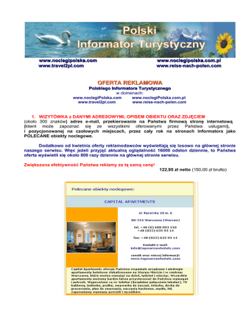 www.noclegipolska.com www.travel2pl.com www.noclegipolska.com.pl www.reise-nach-polen.com OFERTA REKLAMOWA Polskiego Informatora Turystycznego w domenach: www.noclegiPolska.com www.travel2pl.com www.noclegiPolska.com.pl www.reise-nach-polen.com 1. WIZYTÓWKA z DANYMI ADRESOWYMI, OPISEM OBIEKTU ORAZ ZDJĘCIEM (około 300 znaków) adres e-mail, przekierowanie na Państwa firmową stronę internetową (klient może zapoznać się ze wszystkimi oferowanymi przez Państwa usługami), i pozycjonowanej na czołowych miejscach, przez cały rok na stronach Informatora jako POLECANE obiekty noclegowe. Dodatkowo od kwietnia oferty reklamodawców wyświetlają się losowo na głównej stronie naszego serwisu. Więc jeżeli przyjąć aktualną oglądalność 16000 odsłon dziennie, to Państwa oferta wyświetli się około 800 razy dziennie na głównej stronie serwisu. Zwiększona efektywność Państwa reklamy za tą samą cenę! 122,95 zł netto (150,00 zł brutto) 2. ARTYKUŁ SPONSOROWANY – CENA 550 PLN netto (671 brutto) / miesiąc Prezentacja oferty specjalnej lub samego obiektu na głównej stronie informatora w dziale Aktualności / Imprezy / Wydarzenia w postaci krótkiego artykułu wraz z linkiem przekierowującym na Państwa stronę internetową. 3. BANER REKLAMOWY - 742 X 92 px – CENA 1600 PLN netto (1952 brutto) / 1 miesiąc Cena nie zawiera kosztu przygotowania banera reklamowego. Baner wyświetla się w 3 wersjach językowych portalu rotacyjnie co 5 wyświetlenie każdej strony serwisu. 4. BANER REKLAMOWY 170 X 309 px – CENA 700 PLN netto (854 brutto) / 1 miesiąc Cena nie zawiera kosztu przygotowania banera reklamowego. Baner wyświetla się w 3 wersjach językowych portalu rotacyjnie co 5 wyświetlenie każdej strony serwisu. LINK POZYCJONUJĄCY 120 PLN netto (146,40 brutto) / miesiąc Link tekstowy wyświetlany jest na każdej podstronie serwisu w 3 domenach o PR = 5 PROFESJONALNE TŁUMACZENIE TEKSTU (cena za tłumaczenie do 1500 znaków ze spacjami tekstu wynikowego) strony lub reklamy na: ● język angielski, niemiecki, rosyjski - 50,oo zł netto (61,00 brutto) Chcesz swój obiekt jeszcze bardziej wyróżnić spośród innych ofert? 1. gwarantowana pierwsza pozycja w katalogu w danej miejscowości – 100 zł netto / rok 2. gwarantowana druga pozycja w katalogu w danej miejscowości – 80 zł netto /rok 3. gwarantowana trzecia pozycja w katalogu w danej miejscowości – 50 zł netto / rok Cennik obowiązuje od dnia 14.04.2007 Serdecznie zapraszamy! Noclegi Polska 84-100 Puck, ul. Żeromskiego 37, tel. 609-319-172, +48 (58) 673-45-34, e-mail: [email protected], www.dands.pl
