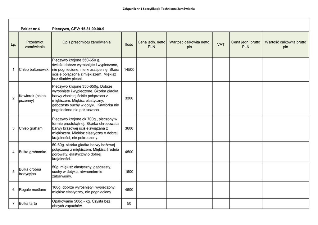 Załącznik nr 1 Specyfikacja Techniczna Zamówienia Pakiet nr 4 Lp. Przedmiot zamówienia Pieczywo, CPV: 15.81.00.00-9 Opis przedmiotu zamówienia Ilość 1 Pieczywo krojone 550-650 g. świeże,dobrze wyrośnięte i wypieczone, Chleb baltonowski nie pogniecione, nie kruszące się. Skóra ściśle połączona z miękiszem. Miękisz bez śladów pleśni. 14500 2 Kawiorek (chleb pszenny) Pieczywo krojone 350-650g. Dobrze wyrośnięte i wypieczone. Skórka gładka barwy złocistej ściśle połączona z miękiszem. Miękisz elastyczny, gąbczasty suchy w dotyku. Kawiorka nie pognieciona nie pokruszona. 3300 Chleb graham Pieczywo krojone ok.700g., pieczony w formie prostokątnej. Skórka chropowata barwy brązowej ściśle związana z miękiszem. Miękisz elastyczny o dobrej krajalności, nie pokruszony. 3600 4 Bułka grahamka 50-60g. skórka gładka barwy beżowej połączona z miękiszem. Miękisz średnio porowaty, elastyczny o dobrej krajalności. 4500 5 Bułka drobna tradycyjna 50g. miękisz elastyczny, gąbczasty, suchy w dotyku, równomiernie zabarwiony. 1500 6 Rogale maślane 100g. dobrze wyrośnięty i wypieczony, miękisz elastyczny, nie pognieciony. 4500 7 Bułka tarta Opakowanie 500g.- kg. Czysta bez obcych zapachów. 3 50 Cena jedn. netto PLN Wartość całkowita netto pln VAT Cena jedn. brutto PLN Wartość całkowita brutto pln Załącznik nr 1 Specyfikacja Techniczna Zamówienia RAZEM: