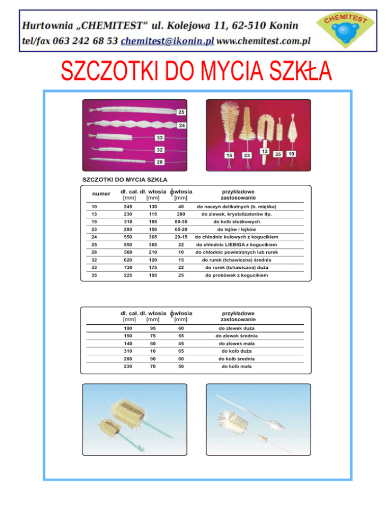 SZCZOTKI DO MYCIA SZKLA SZCZOTKI DO MYCIA SZKŁA numer dł. cał. dł. włosia Owłosia [mm] [mm] [mm] przykładowe zastosowanie 10 245 130 40 do naczyń delikatnych (b. miękka) 13 230 115 280 do zlewek, krystalizatorów itp. 15 310 185 80-35 do kolb stożkowych 23 280 150 65-20 do lejów i lejków 24 550 365 29-15 do chłodnic kulowych z kogucikiem 25 550 365 22 do chłodnic LIEBIGA z kogucikiem 28 560 210 10 do chłodnic powietrznych lub rurek 32 620 120 15 do rurek (tchawiczna) średnia 33 730 175 22 do rurek (tchawiczna) duża 35 225 105 25 do probówek z kogucikiem dł. cał. dł. włosia Owłosia [mm] [mm] [mm] przykładowe zastosowanie 190 95 60 do zlewek duża 150 75 55 do zlewek średnia 140 60 45 do zlewek mała 310 10 65 do kolb duża 280 90 60 do kolb średnia 230 70 50 do kolb mała