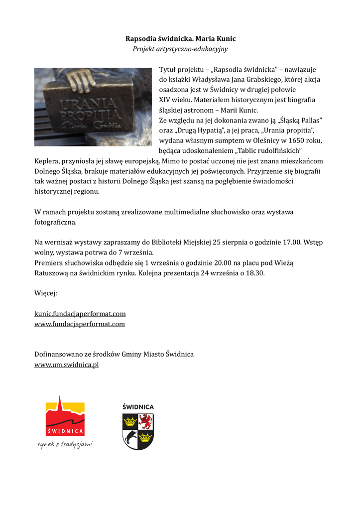 Rapsodiaświdnicka.MariaKunic Projektartystyczno-edukacyjny Tytułprojektu–„Rapsodiaświdnicka”–nawiązuje doksiążkiWładysławaJanaGrabskiego,którejakcja osadzonajestwŚwidnicywdrugiejpołowie XIVwieku.MateriałemhistorycznymjestbiograKia śląskiejastronom–MariiKunic. Zewzględunajejdokonaniazwanoją„ŚląskąPallas” oraz„DrugąHypatią”,ajejpraca,„Uraniapropitia”, wydanawłasnymsumptemwOleśnicyw1650roku, będącaudoskonaleniem„TablicrudolKińskich” Keplera,przyniosłajejsławęeuropejską.Mimotopostaćuczonejniejestznanamieszkańcom DolnegoŚląska,brakujemateriałówedukacyjnychjejpoświęconych.PrzyjrzeniesiębiograKii takważnejpostacizhistoriiDolnegoŚląskajestszansąnapogłębienieświadomości historycznejregionu. Wramachprojektuzostanązrealizowanemultimedialnesłuchowiskoorazwystawa fotograKiczna. NawernisażwystawyzapraszamydoBibliotekiMiejskiej25sierpniaogodzinie17.00.Wstęp wolny,wystawapotrwado7września. Premierasłuchowiskaodbędziesię1wrześniaogodzinie20.00naplacupodWieżą Ratuszowąnaświdnickimrynku.Kolejnaprezentacja24wrześniao18.30. Więcej: kunic.fundacjaperformat.com www.fundacjaperformat.com DoKinansowanoześrodkówGminyMiastoŚwidnica www.um.swidnica.pl Performatwyrósłzinternetowejplatformyoteatrze.Pisaliśmyopremierach,festiwalach, wydarzeniachkulturalnych.PotemprzekształciliśmysięwFundację.Zajęliśmysięprodukcją wydarzeńiedukacjąartystyczną. Terazpołączyliśmynaszezainteresowania–wydajemyczasopismointernetowe,atakże organizujemyprojektyartystyczne.Działamynawielupłaszczyznach–teatritaniec współczesny,fotograKia,sztukiwizualne. Wyzwanie,jakiesobiepostawiliśmy,towcielaniedziałańartystycznychwżycie.Wierzymy wperformatywnycharakternaszejpracy–tylkodziękiwspółudzialeinnychosób,nabiera onasensu.Performansrozumiemyjakodziałanie,którezmieniaotaczającąnasrzeczywistość. Angażujemysięwprojekty,któremajątakicel. ARTYŚCI/REALIZATORZY: BartoszKliszczyk(fotograKia)–kulturoznawca,fotograf,specjalistads.komunikacji. PropagatorDolnegoŚląskaiproduktówregionalnych.Jakofotografrealizujeprojekty związanezmodąiportretami. KarolinaWycisk(idea)–doktorantkanaUniwersytecieJagiellońskim,kuratorkaprojektów taneczno-teatralnych.WramachstypendiumtwórczegoMKiDNzrealizowałaprojekt„Kapsuła teraźniejszości”opamięcimiejscnaDolnymŚląsku. Slime/Slajm(muzyka)–świdnickiproducentmuzycznyznanyzewspółpracyztakimi wykonawcamijak:Printempo,TrzeciWymiarczyNoizeFromDust.Jesttakżeautoremoprawy dźwiękowejdospektakli„BlogText”JuliuszaChrząstowskiegoorazdo„ZuziaGwiazdny Paproch”MateuszaWitkowskiego. MateuszWitkowski(dramaturgia)–dziennikarz,poeta,dramatopisarz,związany zUniwersytetemJagiellońskim.Dotejporypublikowałm.in.w„Dwutygodniku”,„Czasie Kultury”,„Opcjach”,„Xięgarni”.WywodzisięzeŚwidnicy. MariaZięba(koordynacja)–animatorkaprojektówkulturalnychwŚwidnicy,fundraiser idoradcaorganizacjipozarządowych.Posiadawiedzęikompetencjezzakresumetodyki projektowej,rozliczaniaśrodkóworazsponsoringukultury.