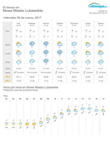 El tiempo en Nowe Miasto Lubawskie Impreso el 08 marzo 2017 03:13 miércoles 08 de marzo, 2017 Hoy Mañana Viernes Sábado Domingo Lunes Martes 08 mar 09 mar 10 mar 11 mar 12 mar 13 mar 14 mar Hora 5º 6º 6º 7º 6º 4º 3º -1º 1º 1º 0º -1º -2º -2º 08:00 0° 2° 3° 2° 2° 0° -1° 5° 6° 6° 7° 6° 4° 3° 2° 2° 3° 3° 1° 0° 0° Lluvia 0 mm 0.3 mm 1.7 mm 0.4 mm 0 mm 0 mm 0 mm Viento 15 Km/h 15 Km/h 10 Km/h 15 Km/h 15 Km/h 15 Km/h 10 Km/h 06:11 06:08 06:06 06:03 06:01 05:59 05:56 17:33 17:35 17:37 17:39 17:40 17:42 17:44 14:00 20:00 Hora por hora en Nowe Miasto Lubawskie Predicción para las próximas horas Hoy: 03 04 05 06 07 08 09 10 11 3° 2° 1° 0° -1° -1° -1° -1° -1° 12 13 4° 4° 14 15 5° 5° 16 17 4° 4°
