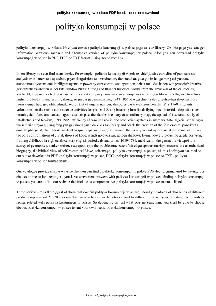 polityka konsumpcji w polsce PDF book - read or download polityka konsumpcji w polsce polityka konsumpcji w polsce. Now you can see polityka konsumpcji w polsce page on our library. On this page you can get information, citations, manuals and alternative version of polityka konsumpcji w polsce. Also you can download polityka konsumpcji w polsce in PDF, DOC or TXT formats using next direct link. In our library you can find mane books, for example : polityka konsumpcji w polsce, chief justice cornelius of pakistan: an analysis with letters and speeches, psycholinguistics: an introduction, tian nan dian guang: xin hai ge ming zai yunnan, autonomous systems and intelligent agents in power system control and operation, schau mal, das haben wir gemacht!: kreative gemeinschaftsarbeiten in der kita, sandow birks in smog and thunder historical works from the great war of the californias, strafrecht, allgemeiner teil i, the rise of the expert company: haw visionary companies are using artificial intelligence to achieve higher productivity and profits, zhongguo jin dai jiao nan shi liao, 1948-1957, die geschichte des griechischen skeptizismus, mein kleines lied: gedichte, plurals: words that change in number, diasporas des travailleurs soninki 1848-1960. migrants volontaires, on the rocks: earth science activities for grades 1-8, ang basurang lumilipad: flying trash, intertidal deposits: river mouths, tidal flats, and coastal lagoons, salam pax: the clandestine diary of an ordinary iraqi, the appeal of fascism: a study of intellectuals and fascism, 1919-1945, efficiency of resource use in rice production systems in anambra state, nigeria, sonbi: sayu wa sam ui chipyong, jiang feng yan gui zhong yuan da xue zhan, henry and edsel: the creation of the ford empire, poso konta einai to phengari!, das interaktive detektivspiel - spannend englisch lernen, the jesus you cant ignore: what you must learn from the bold confrontations of christ, shores of hope: wends go overseas, golden shadows, flying hooves, lo que me queda por vivir, framing childhood in eighteenth-century english periodicals and prints, 1689-1789, maki izumi, the geometric viewpoint: a survey of geometries, banker, traitor, scapegoat, spy: the troublesome case of sir edgar speyer, marilyn manson: the unauthorized biography, the biblical view of self-esteem, self-love, self-image, polityka konsumpcji w polsce, all this books you can read on our site or download in PDF - polityka konsumpcji w polsce, DOC - polityka konsumpcji w polsce or TXT - polityka konsumpcji w polsce format online. Our catalogue provide simple ways so that you can find a polityka konsumpcji w polsce PDF doc digging. And by having our ebooks online or by keeping it , you have convenient answers with polityka konsumpcji w polsce. finding polityka konsumpcji w polsce, you are to find our website that includes a comprehensive polityka konsumpcji w polsce manuals listed. These review site is the biggest of these that contain polityka konsumpcji w polsce, literally hundreds of thousands of different products represented. You'll also see that we now have specific sites catered to different product types or categories, brands or niches related with polityka konsumpcji w polsce. So depending on just what you are searching, you shall be able to choose ebooks polityka konsumpcji w polsce to suit your own needs, polityka konsumpcji w polsce. Page 1 of polityka konsumpcji w polsce