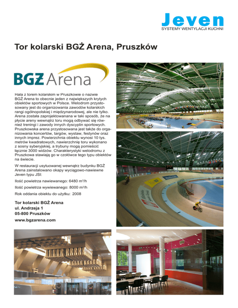 SYSTEMY WENTYLACJI KUCHNI Tor kolarski BGŻ Arena, Pruszków Hala z torem kolarskim w Pruszkowie o nazwie BGŻ Arena to obecnie jeden z największych krytych obiektów sportowych w Polsce. Welodrom przystosowany jest do organizowania zawodów kolarskich rangi ogólnopolskiej i międzynarodowej, ale nie tylko. Arena została zaprojektowanana w taki sposób, że na płycie areny wewnątrz toru mogą odbywać się również treningi i zawody innych dyscyplin sportowych. Pruszkowska arena przystosowana jest także do organizowania koncertów, targów, wystaw, festynów oraz innych imprez. Powierzchnia obiektu wynosi 10 tys. metrów kwadratowych, nawierzchnię toru wykonano z sosny syberyjskiej, a trybuny mogą pomieścić łącznie 3000 widzów. Charakterystyki welodromu z Pruszkowa stawiają go w czołówce tego typu obiektów na świecie. W restauracji usytuowanej wewnątrz budynku BGŻ Arena zainstalowano okapy wyciągowo-nawiewne Jeven typu JSI: Ilość powietrza nawiewanego: 6480 m3/h Ilość powietrza wywiewanego: 8000 m3/h Rok oddania obiektu do użytku: 2008 Tor kolarski BGŻ Arena ul. Andrzeja 1 05-800 Pruszków www.bgzarena.com