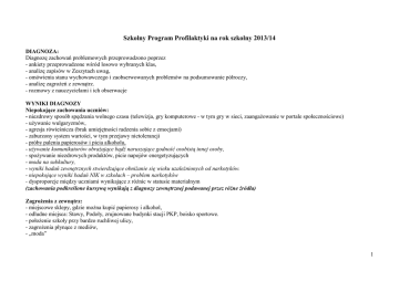 Szkolny Program Profilaktyki na rok szkolny 2013/14 DIAGNOZA: Diagnozę zachowań problemowych przeprowadzono poprzez - ankiety przeprowadzone wśród losowo wybranych klas, - analizę zapisów w Zeszytach uwag, - omówienia stanu wychowawczego i zaobserwowanych problemów na podsumowanie półroczy, - analizę zagrożeń z zewnątrz. - rozmowy z nauczycielami i ich obserwacje WYNIKI DIAGNOZY Niepokojące zachowania uczniów: - niezdrowy sposób spędzania wolnego czasu (telewizja, gry komputerowe - w tym gry w sieci, zaangażowanie w portale społecznościowe) - używanie wulgaryzmów, - agresja rówieśnicza (brak umiejętności radzenia sobie z emocjami) - zaburzony system wartości, w tym przejawy nietolerancji - próby palenia papierosów i picia alkoholu, - używanie komunikatorów obrażające bądź naruszające godność osobistą innej osoby, - spożywanie niezdrowych produktów, picie napojów energetyzujących - moda na subkultury, - wyniki badań zewnętrznych stwierdzające obniżanie się wieku uzależnionych od narkotyków. - niepokojące wyniki badań NIK w szkołach – problem narkotyków - dysproporcje między uczniami wynikające z różnic w statusie materialnym (zachowania podkreślone kursywą wynikają z diagnozy zewnętrznej podawanej przez różne źródła) Zagrożenia z zewnątrz: - miejscowe sklepy, gdzie można kupić papierosy i alkohol, - odludne miejsca: Stawy, Podoły, zrujnowane budynki stacji PKP, boisko sportowe. - położenie szkoły przy bardzo ruchliwej ulicy, - zagrożenia płynące z mediów, - „moda” 1 CELE PROGRAMU 1. Bezpieczeństwo uczniów 2. Ochrona uczniów przed zagrożeniami 3. Rozwijanie umiejętności radzenia sobie z emocjami. 4. Kształtowanie postaw szacunku wobec siebie i innych 5. Wspieranie uczniów będących w trudnej sytuacji rodzinnej i materialnej 6. Uczenie właściwych postaw oraz konieczności dbania o zdrowie 7. Kształtowanie postaw sprzyjających dalszemu rozwojowi indywidualnemu i społecznemu. PARTNERZY Z ZEWNĄTRZ - Poradnie psychologiczno-pedagogiczne - Policja - Rejonowa Przychodnia Zdrowia w Podłężu - Organizacje i stowarzyszenia przeciwdziałające uzależnieniom. - Parafia 2 Obszary i zadania Bezpieczeństwo uczniów: Cele Szczegółowe Formy i metody realizacji Realizator Opieka nad uczniami w czasie przerw międzylekcyjnych Nauczyciele dyżurni Kształtowanie postaw asertywnych oraz tolerancyjnych Bezpieczeństwo fizyczne i psychiczne uczniów Integracja zespołów klasowych Przedstawienie rodzicom problemu agresji, współpraca w w wychowywaniu. Prawidłowe reagowanie na przejawy agresji Bezpieczna droga do szkoły Organizacja wycieczek i wyjść pozaszkolnych Przypominanie zasad prawidłowego uczestnictwa w ruchu drogowym. Egzekwowanie noszenia przez uczniów kamizelek odblaskowych Szkolenie uczniów kl. I Przestrzeganie procedur w organizacji wycieczek i wyjść pozaszkolnych Wychowawcy Oczekiwane efekty Uczeń: -wie jak zachowywać się w czasie przerw, - zna negatywne skutki zachowań agresywnych, -stara się życzliwie traktować innych, - wie, do kogo może zwrócić się o pomoc -szkoła jest partnerem w wychowywaniu Wszyscy pracownicy szkoły. Wychowawcy Nauczyciel techniki, Pani „Stop” Uczeń jest bezpiecznym użytkownikiem drogi Dyrektor Wychowawcy Wychowawcy, kierownicy wycieczek, nauczyciele Uczeń jest bezpiecznym uczestnikiem wycieczek 3 Znajomość zasad zachowania w kontakcie ze zwierzętami. Zachowanie uczniów w sytuacji zagrożenia Bezpieczne zachowanie w pracowniach Kształtowanie nawyków kulturalnego zachowania Umiejętne zachowanie w kontakcie z osobami nieznajomymi. Przeprowadzanie ćwiczeń ewakuacyjnych. Nauka udzielania pomocy w nagłych wypadkach Znajomość numerów telefonów ratujących życie i umiejętność zawiadamiania. Zapoznanie uczniów z regulaminami pracowni: - pracownia komputerowa, -sala gimnastyczna -sala Cyfrowej szkoły -plac zabaw przy szkole - regulamin świetlicy Przestrzeganie stosowania form grzecznościowych Kultura słowa, przeciwdziałanie wulgaryzmom Udział w gminnym konkursie Savoir vivre – wiem, stosuję Wychowawcy prelegent Dyrektor Wychowawcy Nauczyciel techniki Opiekun PCK Nauczyciel techniki Nauczyciele przedmiotów, wychowawcy Wszyscy pracownicy szkoły Koordynator konkursu Uczeń: - zachowuje zasady w kontakcie ze zwierzętami Uczeń: - potrafi odmówić, poprosić o pomoc Uczniowie: - znają zasady ewakuacji, Uczniowie: - znają numery telef. związanych z ratownictwem, - potrafią się zachować w sytuacji zagrożenia Uczniowie: - stosują się do zapisów regulaminów, Uczniowie: - stosują zwroty grzecznościowe, - potrafią prawidłowo zachować się w różnych sytuacjach, -starają się pokojowo rozwiązywać konflikty, 4 Sposoby mierzenia efektywności: - Analiza zapisów w Zeszytach uwag – sprawozdania półroczne - Zapisy tematów w dziennikach lekcyjnych - Ankieta, - Przestrzeganie obowiązku noszenia kamizelek odblaskowych, rozliczanie w ocenach miesięcznych zachowania) - Analiza protokołów zespołów wychowawców klas - Wyniki konkursu Savoir-vivre, wiem, stosuję. UWAGI PO REALIZACJI: 5 Kształtowanie Zachowań Prozdrowotnych Cele szczegółowe Kształtowanie dbałości o zdrowie, tworzenie środowiska sprzyjającego zdrowiu Przeciwdziałanie uzależnieniom Formy i metody realizacji Przestrzeganie higieny osobistej Właściwe odżywianie Eliminacja ze sklepiku szkolnego napojów gazowanych i chipsów Udział w programach „Owoce w szkole” i „Szklanka mleka” Zwiększenie działań związanych z koniecznością jedzenia owoców i warzyw – antyoksydanty jako czynniki chroniące przed rakiem. Działania ograniczające hałas na przerwach Troska o Ziemię - Sprzątanie Ziemi, Święto Ziemi Wdrażanie zasad segregacji odpadów Pogadanki na temat wpływu na rozwój ucznia: - palenia papierosów, - picia alkoholu, a) przedstawienie rodzicom wyników ankiet prowadzonych w szkole, wspólne działania zapobiegawcz