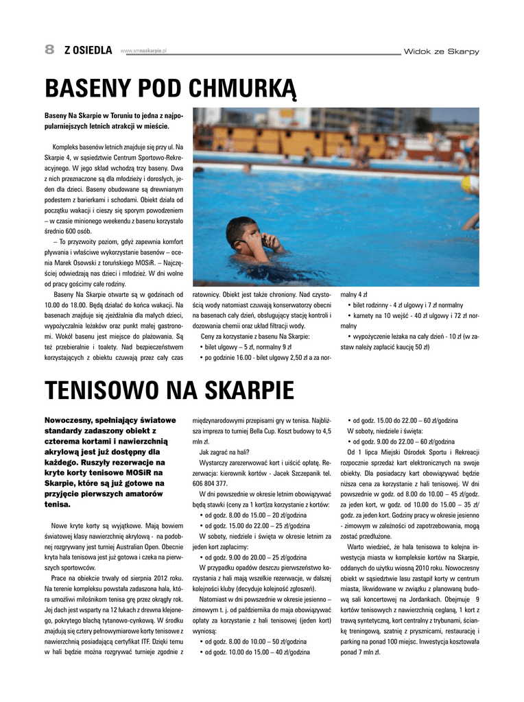 8 z osiedla www.smnaskarpie.pl Widok ze Skarpy Baseny pod chmurką Baseny Na Skarpie w Toruniu to jedna z najpopularniejszych letnich atrakcji w mieście. Kompleks basenów letnich znajduje się przy ul. Na Skarpie 4, w sąsiedztwie Centrum Sportowo-Rekreacyjnego. W jego skład wchodzą trzy baseny. Dwa z nich przeznaczone są dla młodzieży i dorosłych, jeden dla dzieci. Baseny obudowane są drewnianym podestem z barierkami i schodami. Obiekt działa od początku wakacji i cieszy się sporym powodzeniem – w czasie minionego weekendu z basenu korzystało średnio 600 osób. – To przyzwoity poziom, gdyż zapewnia komfort pływania i właściwe wykorzystanie basenów – ocenia Marek Osowski z toruńskiego MOSiR. – Najczęściej odwiedzają nas dzieci i młodzież. W dni wolne od pracy gościmy całe rodziny. Baseny Na Skarpie otwarte są w godzinach od 10.00 do 18.00. Będą działać do końca wakacji. Na basenach znajduje się zjeżdżalnia dla małych dzieci, wypożyczalnia leżaków oraz punkt małej gastronomi. Wokół basenu jest miejsce do plażowania. Są też przebieralnie i toalety. Nad bezpieczeństwem korzystających z obiektu czuwają przez cały czas ratownicy. Obiekt jest także chroniony. Nad czystością wody natomiast czuwają konserwatorzy obecni na basenach cały dzień, obsługujący stację kontroli i dozowania chemii oraz układ filtracji wody. Ceny za korzystanie z basenu Na Skarpie: • bilet ulgowy – 5 zł, normalny 9 zł • po godzinie 16.00 - bilet ulgowy 2,50 zł a za nor- malny 4 zł • bilet rodzinny - 4 zł ulgowy i 7 zł normalny • karnety na 10 wejść - 40 zł ulgowy i 72 zł normalny • wypożyczenie leżaka na cały dzień - 10 zł (w zastaw należy zapłacić kaucję 50 zł) Tenisowo na Skarpie Nowoczesny, spełniający światowe standardy zadaszony obiekt z czterema kortami i nawierzchnią akrylową jest już dostępny dla każdego. Ruszyły rezerwacje na kryte korty tenisowe MOSiR na Skarpie, które są już gotowe na przyjęcie pierwszych amatorów tenisa. Nowe kryte korty są wyjątkowe. Mają bowiem światowej klasy nawierzchnię akrylową - na podobnej rozgrywany jest turniej Australian Open. Obecnie kryta hala tenisowa jest już gotowa i czeka na pierwszych sportowców. Prace na obiekcie trwały od sierpnia 2012 roku. Na terenie kompleksu powstała zadaszona hala, która umożliwi miłośnikom tenisa grę przez okrągły rok. Jej dach jest wsparty na 12 łukach z drewna klejonego, pokrytego blachą tytanowo-cynkową. W środku znajdują się cztery pełnowymiarowe korty tenisowe z nawierzchnią posiadającą certyfikat ITF. Dzięki temu w hali będzie można rozgrywać turnieje zgodnie z międzynarodowymi przepisami gry w tenisa. Najbliższa impreza to turniej Bella Cup. Koszt budowy to 4,5 mln zł. Jak zagrać na hali? Wystarczy zarezerwować kort i uiścić opłatę. Rezerwacja: kierownik kortów - Jacek Szczepanik tel. 606 804 377. W dni powszednie w okresie letnim obowiązywać będą stawki (ceny za 1 kort)za korzystanie z kortów: • od godz. 8.00 do 15.00 – 20 zł/godzina • od godz. 15.00 do 22.00 – 25 zł/godzina W soboty, niedziele i święta w okresie letnim za jeden kort zapłacimy: • od godz. 9.00 do 20.00 – 25 zł/godzina W przypadku opadów deszczu pierwszeństwo korzystania z hali mają wszelkie rezerwacje, w dalszej kolejności kluby (decyduje kolejność zgłoszeń). Natomiast w dni powszednie w okresie jesienno – zimowym t. j. od października do maja obowiązywać opłaty za korzystanie z hali tenisowej (jeden kort) wyniosą: • od godz. 8.00 do 10.00 – 50 zł/godzina • od godz. 10.00 do 15.00 – 40 zł/godzina • od godz. 15.00 do 22.00 – 60 zł/godzina W soboty, niedziele i święta: • od godz. 9.00 do 22.00 – 60 zł/godzina Od 1 lipca Miejski Ośrodek Sportu i Rekreacji rozpocznie sprzedaż kart elektronicznych na swoje obiekty. Dla posiadaczy kart obowiązywać będzie niższa cena za korzystanie z hali tenisowej. W dni powszednie w godz. od 8.00 do 10.00 – 45 zł/godz. za jeden kort, w godz. od 10.00 do 15.00 – 35 zł/ godz. za jeden kort. Godziny pracy w okresie jesienno - zimowym w zależności od zapotrzebowania, mogą zostać przedłużone. Warto wiedzieć, że hala tenisowa to kolejna inwestycja miasta w kompleksie kortów na Skarpie, oddanych do użytku wiosną 2010 roku. Nowoczesny obiekt w sąsiedztwie lasu zastąpił korty w centrum miasta, likwidowane w związku z planowaną budową sali koncertowej na Jordankach. Obejmuje 9 kortów tenisowych z nawierzchnią ceglaną, 1 kort z trawą syntetyczną, kort centralny z trybunami, ściankę treningową, szatnię z prysznicami, restaurację i parking na ponad 100 miejsc. Inwestycja kosztowała ponad 7 mln zł.