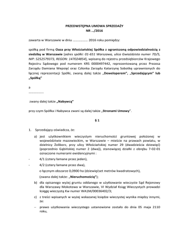 PRZEDWSTĘPNA UMOWA SPRZEDAŻY NR …/2016 zawarta w Warszawie w dniu ……………… 2016 roku pomiędzy: spółką pod firmą Oaza przy Włościańskiej Spółka z ograniczoną odpowiedzialnością z siedzibą w Warszawie [adres spółki: 01-651 Warszawa, ulica Gwiaździsta numer 7D/5, NIP: 5252579373, REGON: 147024854], wpisaną do rejestru przedsiębiorców Krajowego Rejestru Sądowego pod numerem KRS 0000497442, reprezentowaną przez Prezesa Zarządu Damiana Wepsięć oraz Członka Zarządu Katarzynę Sobotkę uprawnionych do łącznej reprezentacji Spółki, zwaną dalej także „Deweloperem”, „Sprzedającym” lub „Spółką” a ……………… zwany dalej także „Nabywcą” przy czym Spółka i Nabywca zwani są dalej także „Stronami Umowy”. §1 1. Sprzedający oświadcza, że: a) jest użytkownikiem wieczystym nieruchomości gruntowej położonej w województwie mazowieckim, w Warszawie – mieście na prawach powiatu, w dzielnicy Żoliborz, przy ulicy Włościańskiej numer 29 (dwadzieścia dziewięć) (poprzednio Gąbińskiej numer 2 (dwa)), stanowiącej działki z obrębu 7-02-01 oznaczone numerami ewidencyjnymi : - 4/1 (cztery łamane przez jeden), - 4/2 (cztery łamane przez dwa), o łącznym obszarze 0,0900 ha (dziewięćset metrów kwadratowych), (zwana dalej także: „Nieruchomością”); b) dla opisanego wyżej gruntu oddanego w użytkowanie wieczyste Sąd Rejonowy dla Warszawy Mokotowa w Warszawie, VI Wydział Ksiąg Wieczystych prowadzi księgę wieczystą Kw numer WA1M/00036402/3; c) z treści wpisanych w wyżej wskazanej księdze wieczystej wynika między innymi, że: prawo użytkowania wieczystego ustanowione zostało do dnia 05 maja 2110 roku, 2 w dziale I-Sp powołanej wyżej księgi wieczystej wpisów nie ma, w dziale II tej księgi wieczystej jako właściciel gruntu wpisane jest Miasto Stołeczne Warszawa, zaś jako użytkownik wieczysty gruntu wpisana jest spółka pod firmą Oaza przy Włościańskiej Spółka z ograniczoną odpowiedzialnością z siedzibą w Warszawie, na podstawie Przeniesienia zorganizowanej części przedsiębiorstwa oraz udziału w użytkowaniu wieczystym, objętej aktem notarialnym sporządzonym w dniu 30 grudnia 2013 roku przez Fabiana Wawrzyniaka – notariusza w Warszawie, za Repertorium A numer 14377/2013, w dziale III powołanej wyżej księgi wieczystej wpisane są: [i] nieodpłatna i ustanowiona na czas nieoznaczony służebność przesyłu na rzecz RWE STOEN OPERATOR Sp. z o.o. z siedzibą w Warszawie, na podstawie Oświadczenia o ustanowieniu służebności przesyłu, sporządzonego w dniu 24 lutego 2014 roku przez Katarzynę Chmielewską – notariusza w Warszawie, za Repertorium A numer 537/2014, [ii] nieodpłatna i ustanowiona na czas nieoznaczony służebność przesyłu na rzecz VEOLIA ENERGIA WARSZAWA Spółka Akcyjna z siedzibą w Warszawie [REGON: 015314764], na podstawie oświadczenia o ustanowieniu służebności przesyłu objętej aktem notarialnym sporządzonym w dniu 14 grudnia 2015 roku przez Fabiana Wawrzyniaka – notariusza w Warszawie, za Repertorium A numer 11920/2015, [iii] nieodpłatna i ustanowiona na czas nieoznaczony służebność przesyłu na rzecz UPC Polska Spółka z ograniczoną odpowiedzialnością z siedzibą w Warszawie [REGON: 016308978], na podstawie oświadczenia o ustanowieniu służebności przesyłu objętej aktem notarialnym sporządzonym w dniu 14 grudnia 2015 roku przez Fabiana Wawrzyniaka – notariusza w Warszawie, za Repertorium A numer 11929/2015, [iv] nieodpłatna i ustanowiona na czas nieoznaczony służebność przesyłu na rzecz ORANGE Polska Spółka Akcyjna z siedzibą w Warszawie [REGON: 012100784], na podstawie oświadczenia o ustanowieniu służebności przesyłu objętej aktem notarialnym sporządzonym w dniu 14 grudnia 2015 roku przez Fabiana Wawrzyniaka – notariusza w Warszawie, za Repertorium A numer 11933/2015, [v] roszczenia o wybudowanie budynku oraz wyodrębnienie lokali na rzecz osób trzecich, przy czym nie dotyczą one lokalu będącego przedmiotem niniejszej umowy; w dziale IV powołanej wyżej księgi wieczystej wpisów nie ma; księga ta nie zawiera żadnych wzmianek. 2. Nieruchomość posiada nieskrępowany dojazd i dostęp do drogi publicznej. 3. Sprzedający prowadzi na Nieruchomości - na podstawie ostatecznej decyzji numer 247/2013, wydanej w dniu 22 listopada 2013 roku przez Prezydenta Miasta 2|Strona 3 Stołecznego Warszawy [znak: UD-XVIII-WAB.6740.94.2013.MMI], zatwierdzającej projekt budowlany i udzielającej pozwolenia na budowę dla zadania pod nazwą: Wielorodzinny budynek mieszkalny z usługami w parterze i dwukondygnacyjnym garażem podziemnym, instalacjami wewnętrznymi (wod.-kan., c.o., wentylacji mechanicznej, elektryczne) oraz zagospodarowaniem terenu na działkach 4/1 i 4/2 z obrębu 7-02-01 przy ul. Gąbińskiej w Warszawie, z projektowanym zjazdem drogowym z ul. Gąbińskiej położonym na działce nr 3 z obrębu 7-02-01 oraz usytuowaniem tymczasowych ścianek szczelnych na czas wykonywania kondygnacji podziemnych na działkach nr 2, 12/1, 5/1, 7/3, 3 z obrębu 7-02-01, przeniesionej na Dewelopera ostateczną decyzją numer 158/P/2014 wydaną w dniu 03 września 2014 roku przez Prezydenta Miasta Stołecznego Warszawy [znak: WAB.670.1115.2014.MMI], a następnie zmienioną ostateczną decyzją nr 67/2015 z dnia 24 kwietnia 2015r. wydaną Prezydenta Miasta Stołecznego Warszawy [znak: UD-XVIII-WAB.6740.6.2015.MMI], (zwane dalej także: "Decyzją Pozwolenia na Budowę") – inwestycję, polegającą na budowie budynku mieszkalnego wielorodzinnego z usługami w parterze (zwanego dalej także: „Budynkiem”) wraz z miejscami postojowymi w dwukondygnacyjnym garażu podziemnym i infrastrukturą techniczną (zwane jest dalej także: „Przedsięwzięciem Deweloperskim”). Budynek został już wybudowany. Decyzją nr IOT/60/U/2016 z dnia 12 kwietnia 2016 r., znak PINB.IOT.5121.25.2016 Powiatowy Inspektor Nadzoru Budowl