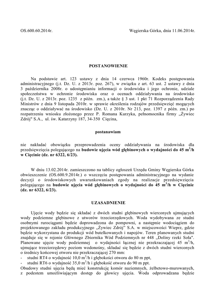 Węgierska Górka, dnia 11.06.2014r. OS.600.60.2014r. POSTANOWIENIE Na podstawie art. 123 ustawy z dnia 14 czerwca 1960r. Kodeks postępowania administracyjnego (j.t. Dz. U. z 2013r. poz. 267), w związku z art. 63 ust. 2 ustawy z dnia 3 października 2008r. o udostępnianiu informacji o środowisku i jego ochronie, udziale społeczeństwa w ochronie środowiska oraz o ocenach oddziaływania na środowisko (j.t. Dz. U. z 2013r. poz. 1235 z późn. zm.), a także § 3 ust. 1 pkt 71 Rozporządzenia Rady Ministrów z dnia 9 listopada 2010r. w sprawie określenia rodzajów przedsięwzięć mogących znacząc o oddziaływać na środowisko (Dz. U. z 2010r. Nr 213, poz. 1397 z późn. zm.) po rozpatrzeniu wniosku złożonego przez P. Romana Kurzyka, pełnomocnika firmy „Żywiec Zdrój" S.A., ul. św. Katarzyny 187, 34-350 Cięcina, postanawiam nie nakładać obowiązku przeprowadzenia oceny oddziaływania na środowiska dla przedsięwzięcia polegającego na budowie ujęcia wód głębinowych o wydajności do 45 m3/h w Cięcinie (dz. nr 6322, 6/23). W dniu 13.02.2014r. zamieszczono na tablicy ogłoszeń Urzędu Gminy Węgierska Górka obwieszczenie (OS.600.9.2014r.) o wszczęciu postępowania administracyjnego na wydanie decyzji o środowiskowych uwarunkowaniach zgody na realizacje przedsięwzięcia polegającego na budowie ujęcia wód głębinowych o wydajności do 45 m3/h w Cięcinie (dz. nr 6322, 6/23). UZASADNIENIE Ujęcie wody będzie się składać z dwóch studni głębinowych wierconych ujmujących wody podziemne głębinowe z utworów trzeciorzędowych. Woda wydobywana ze studni osobnymi rurociągami będzie doprowadzona do pompowni, a następnie wodociągiem do projektowanego zakładu produkcyjnego „Żywiec Zdrój” S.A. w miejscowości Wieprz, gdzie będzie wykorzystana do produkcji wód butelkowanych i napojów. Teren planowanych studni znajduje się w rejonie Głównego Zbiornika Wód Podziemnych nr 448 „Doliny rzeki Soła". Planowane ujęcie wody podziemnej o wydajności łącznej nie przekraczającej 45 m3/h, ujmujące trzeciorzędowy poziom wodonośny, składać się będzie z dwóch studni wierconych o średnicy końcowej otworu nie przekraczającej 270 mm: - studni RT4 o wydajność 10,0 m3/h i głębokości otworu do 80 m ppt, - studni RT6 o wydajność 35,0 m3/h i głębokość otworu do 90 m ppt. Obudowy studni ujęcia będą mieć konstrukcję komór naziemnych, żelbetowo-murowanych, z podestem umożliwiającym dostęp do głowicy ujęcia. Woda odprowadzana będzie ze studni do przepompowni rurami PE. Jak wynika z uzupełnienia karty informacyjnej przedsięwzięcia zasoby eksploatacyjne studni RT6 wynoszą Qe = 19,6 m3/h przy s = 0,6 m. Na podstawie analizy budowy geologicznej, warunków hydrogeologicznych w rejonie studni oraz pompowań pomiarowych wynika, że ze studni można uzyskać 35,0 m3/h. W celu udokumentowania zasobów eksploatacyjnych w tej wysokości przeprowadzone będą badania hydrogeologiczne. Zasoby eksploatacyjne studni RT4 nie zostały dotychczas udokumentowane. Próbne pompowania wykonane w otworze poszukiwawczym RT4 wykazały, że można z niego uzyskać wydajność 10,0 m3/h. Inwestor winien zatem wykonać dokumentację hydrogeologiczną, w oparciu o którą udokumentuje zasoby eksploatacyjne ujęcia i uzyskać decyzję o ich zatwierdzeniu. Eksploatacja studni winna odbywać się z wydajnością nieprzekraczająca zatwierdzonych zasobów eksploatacyjnych ujęcia. Budowa studni zabezpiecza przed przedostaniem się wód czwartorzędowego poziomu wodonośnego do eksploatowanego trzeciorzędowego poziomu wodonośnego przez wodoszczelne postawienie rur obsadowych w stropie utworów trzeciorzędowych. W trakcie eksploatacji ujęcia prowadzony będzie monitoring ujęcia polegający na: - prowadzeniu rejestru poboru wody, - prowadzeniu pomiarów położenia zwierciadła wody z częstotliwością l raz w tygodniu, - badaniu składu fizykochemicznego oraz bakteriologicznego wody z częstotliwością nie rzadziej niż dwa razy do roku, - wykonywaniu pomiarów położenia zwierciadła wody w studniach gospodarskich usytuowanych w zasięgu leja depresji, - prowadzeniu pomiarów głębokości zwierciadła wody w piezometrze zlokalizowanym w pobliżu studni RT6 ujmującym czwartorzędowy poziom wodonośny. Jak wynika z dokumentacji lej depresji studni RT4 i RT6 przy planowanej eksploatacji studni z wydajnością 45,0 m3/h, w postaci obniżonego ciśnienia piezometrycznego lustra wody wytworzony będzie w obrębie trzeciorzędowego poziomu wodonośnego. Nie przewiduje się wpływu eksploatacji studni RT4 i RT6 na okoliczne studnie gospodarskie, gdyż ujmują one czwartorzędowy poziom wodonośny. W trakcie badań hydrogeologicznych dla udokumentowania zasobów studni RT4 i RT6 prowadzone będą obserwacje głębokości zwierciadła wody w studniach gospodarskich usytuowanych w zasięgu leja depresji. Takie same obserwacje prowadzone będą również w trakcie eksploatacji ujęcia. W zasięgu przewidywanego oddziaływania studni RT4 i RT6 trzeciorzędowy poziom wodonośny przykryty jest czwartorzędowym poziomem wodonośnym, stąd zasilanie trzeciorzędowego poziomu wodonośnego odbywa się m.in. przez infiltrację wód z czwartorzędowego poziomu wodonośnego w miejscach występowania okien hydrogeologicznych umożliwiających przenikanie wód do warstwy wodonośnej. W związku z tym w przypadku występowania okien hydrogeologicznych w zasięgu oddziaływania studni, to trzeciorzędowy poziom wodonośny zasilany będzie z czwartorzędowego poziomu wodonośnego, a nie z wód powierzchniowych. Zważywszy na powyższe eksploatacja studni RT4 i RT6 nie będzie miała wpływu na wody powierzchniowe lub wpływ ten będzie minimalny (nieodczuwalny przy minimalnym przepływie wody w rzece Sole i potoku Cięcinka) w przypadku zasilania w tym rejonie czwartorzędowego poziomu wodonośnego przez wody powierzchniowe. Pobór wód z planowanych ujęć RT4 oraz RT6 mieśc
