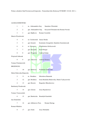 Wykaz członków Rad Powiatowych Kujawsko - Pomorskiej Izby Rolniczej WYBORY: 03-04- 2011 r. ALEKSANDROWSKI 1 1 m. Aleksandrów Kuj. Stanisław Włosiński 2 2 gm. Aleksandrów Kuj. Krzysztof Domanowski Roman Nowak 3 3 gm. Bądkowo Roman Ciesielski Marcin Wesołowski 4 4 m. Ciechocinek Janusz Iłenda 5 5 gm. Koneck Konstanty Grzegórski, Stanisław Kazimierczak 6 6 m. Nieszawa Włodzimierz Królczewski 7 7 gm. Raciążek Karol Berger 8 8 gm. Waganiec Andrzej Kulpa gm. Zakrzewo Andrzej Świercz gm. Bobrowo Waldemar Jankowski Wojciech Sobczak 9 9 Tomasz Pomianowski BRODNICKI 1 10 Maria Żukowska-Repeczko 2 11 m. Brodnica Mirosława Banasiak 3 12 gm. Brodnica Irena Barańska-Bukowska, Marek Tydryszewski 4 13 gm. Brzozie Bogusław Błaszkiewicz gm. Górzno Jerzy Rejentowicz Bartłomiej Wardowski 5 14 Tomasz Truszczyński 6 15 gm. Bartniczka Benedykt Kamiński 16 gm. Jabłonowo Pom. 17 gm. Osiek Jan Zielażiński 7 Roman Maciąg Roman Mikulicz 8 Jerzy Michalski Jan Sulecki 9 18 gm. Świedziebnia Józef Bartnicki Mariusz Klonowski 10 19 gm. Zbiczno Wioletta Falkowska Magdalena Drewka Jan Marcinkowski BYDGOSKI 1 20 m. Bydgoszcz 2 21 gm. Białe Błota Grzegorz Kosidło 3 22 gm. Dąbrowa Chełmińska Aleksandra Kirchner - Banach, Mieczysław Pałczyński 4 23 gm. Dobrcz Rafał Perlik, Krzysztof Szmudanowski 5 24 gm. Koronowo Regina Ostrowska 6 25 gm. Nowa Wieś Wielka 7 26 gm. Osielsko Ryszard Truś 8 27 gm. Sicienko Marzena Kuczkowska 28 gm. Solec Kujawski 1 29 m. Chełmno Tomasz Gnaciński 2 30 gm. Chełmno Alfons Peszka 31 gm. Kijewo Królewskie 32 gm. Lisewo Marian Wardyn brak kandydata Grzegorz Kozioł 9 Dariusz Chojnacki CHEŁMIŃSKI Jan Stefański 3 Mariusz Rembeza Jan Skrzeszewski 4 Mieczysław Radgowski Cecylia Tomaszewska 5 Paweł Banaszek 33 gm. Papowo Biskupie 6 34 gm. Stolno Stanisław Chmal, Ireneusz Ociński 7 35 gm. Unisław Kazimierz Buliński, Grzegorz Kowalski Zbigniew Dams GOLUB-DOBRZYŃ Jacek Błaszkiewicz, Krzysztof Jurkiewicz 1 36 gm. Ciechocin 2 37 m. Golub - Dobrzyń brak kandydata 3 38 gm. Golub - Dobrzyń Dariusz Górski gm. Kowalewo Pom. Zdzisław Oskroba Łukasz Mazurkiewicz 4 39 Ryszard Świętalski gm. Radomin Czesław Klimek 41 gm. Zbójno Rafał Burkwicz 1 42 m. Grudziądz Lucyna Przyborowska 2 43 gm. Grudziądz Grzegorz Szlitkus, Remigiusz Żaglewski 3 44 gm. Gruta Krzysztof Kowalczyk, Rusoń Błażej 4 45 gm. Łasin Marek Duszyński, Paweł Zakrzewski 5 46 gm. Radzyń Chełmiński Zbigniew Makuracki, Lucjan Poznański 6 47 gm. Rogóźno 7 48 gm. Świecie n/Osą Piotr Cybulski, Paweł Czaczkowski Józef Frontczak, Stefan Roszak 5 40 Wojciech Pietrzak 6 Marek Majewski GRUDZIĄDZKI Krzysztof Kowalewski, Piotr Zieliński INOWROCŁAWSKI 1 49 gm. Dąbrowa Biskupia 2 50 gm. Gniewkowo JulianBajerowski, Jan Kopeć 3 51 m. Inowrocław 4 52 gm. Inowrocław Jolanta Kubiak ,Jan Łuczak 5 53 gm. Janikowo Agata Biłoszewska, Edward Morawski 6 54 gm. Kruszwica Bartosz Głowacki, Andrzej Luber 7 55 gm. Pakość Zdzisław Partyka, Marek Pas 8 56 gm. Rojewo Paweł Barczak, Halina Krzewina 9 57 gm. Złotniki Kujawskie 58 gm. Bobrowniki Sławomir Sztuczka Anna Rolirad Mirosław Pawlik, Tadeusz Wojnarowski LIPNOWSKI 1 Maria Wolman 2 59 gm. Chrostkowo Cezary Grabowski , Paweł Szablewski 3 60 gm. Dobrzyń n/Wisłą 4 61 gm. Kikół Antoni Jabłoński, Leszek Wiwatowski 5 62 m. Lipno Kazimierz Jesionowski 6 63 gm. Lipno Bogdan Chojnacki, Jarosław Kryst 7 64 gm. Tłuchowo Małgorzata Janiszewska, Andrzej Pączkowski 8 65 gm. Skępe Tomasz Kępczyński, Andrzej Meller 9 66 gm. Wielgie Ludwik Bieńkowski, Jan Falgowski 1 67 gm. Dąbrowa Janusz Jakubowski, Mirosław Smaruj 2 68 gm. Jeziora Wielkie 3 69 gm. Mogilno Stanisław Borowiak, Jerzy Molenda 4 70 gm. Strzelno Tadeusz Majkut, Piotr Sienkiewicz 1 71 gm. Kcynia Ryszard Bagnerowski, Tomasz Szczepaniak 2 72 gm. Mrocza Henryk Kimber , Radosław Mrugowski 3 73 gm. Nakło n/Notecią 4 74 gm. Sadki Andrzej Cebula, Juliusz Młodecki 5 75 gm. Szubin Jerzy Trzebiatowski, Tomasz Wachowiak Sławomir Kowalewski, Paweł Szczepański MOGILNO Wojciech Skowron , Eligiusz Sławinowski NAKIELSKI Przemysław Leppert, Halina Minichowska RADZIEJOWSKI 1 76 gm. Bytoń brak kandydata 2 77 gm. Dobre Bożena Aleksandrzak, Leszek Łukaszewski 3 78 gm. Osięciny Jerzy Błaszczyk, Grażyna Mikołajewska 4 79 gm. Piotrków Kujawski 5 80 m. Radziejów Mariusz Umerle 6 81 gm. Radziejów Eugeniusz Pawlak 82 gm. Topólka Piotr Małecki, Anna Migdalska ,1 83 Piotr Siutkowski, Piotr Wichliński Marian Przychalski 7 RYPIŃSKI gm. Brzuze Mirosław Ozimkowski, Krzysztof Sulkowski 2 84 gm. Rogowo Renata Lewandowska, Iwona Rutkowska 3 85 m. Rypin Janusz Tyburski 4 86 gm. Rypin Ryszard Błaszkiewicz, Grzegorz Podszucki 5 87 gm. Skrwilno Emilia Jaskólska, Tomasz Medorowski 6 88 gm.Wąpielsk Franciszek Bzinkowski, Andrzej Murawski SĘPÓLNO 1 89 gm. Kamień Krajeński Stanisław Drogoś, Henryk Spirka 2 90 gm. Sępólno Krajeńskie 3 91 gm. Sośno Jacek Nowak, Witold Steckiewicz 4 92 gm. Więcbork Małgorzata Fifielska, Piotr Plutka Stanisław Strózyński, Piotr Wenda ŚWIECKI 1 Krzysztof Gwizdała, Zenon Michałowski 93 gm. Bukowiec 2 94 gm. Dragacz Tadeusz Ponikowski, Roman Wejdebach 3 95 gm. Drzycim Jarosław Chylewski, Stanisław Tankiewicz 4 96 gm. Jeżewo Maria Dulska-Kapuścińska, Roman Niedzielski 5 97 gm. Lniano Sebastian Nowiński, Piotr Ratkowski 6 98 gm. Nowe n/Wisłą 7 99 gm. Osie 8 100 gm. Pruszcz Pomorski Andrzej Grządka, Tomasz Sochacki 9 101 gm. Świecie n/Wisłą Marek Zielony, Piotr Wasielewicz 10 102 gm. Świekatowo Grzegorz Drewczyński, Piotr Kleina 11 103 gm. Warlubie Maciej Górski, Tomasz Lelas Mariola Antoszewska, Michał Recki Wojciech Szafryna, Michał Szafryna TORUŃSKI 1 104 m. Chełmża 2 105 gm. Chełmża 3 106 gm. Czernikowo Mirosław Gan, Tadeusz Ziółkowski 4 107 gm. Lubicz Radosław Wiśniewski, Karina Wroniecka 5 108 gm. Łubianka Jan Madej, Jacek Ziółkowski 6 109 gm. Łysomice Krzysztof Piotrowski, Błażej Zieliński 7 110 gm. Obro