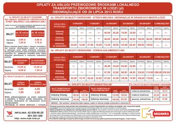 OP£ATY ZA US£UGI PRZEWOZOWE ŒRODKAMI LOKALNEGO TRANSPORTU ZBIOROWEGO W £ODZI (z³) OBOWI¥ZUJ¥CE OD 20 LIPCA 2013 ROKU Ia. OP£ATY ZA BILETY CZASOWE NA LINIACH DZIENNYCH I NOCNYCH DLA STREF: MIEJSKIEJ I AGLOMERACYJNEJ IIa. OP£ATY ZA BILETY OKRESOWE - STREFA MIEJSKA, OBOWI¥ZUJE W GRANICACH MIASTA £ODZI 3-DNIOWY 7-DNIOWY 14-DNIOWY 30-DNIOWY 90-DNIOWY 12-MIESIÊCZNY 900,00 450,00 WA¯NE TYLKO BILETY LOKALNEGO TRANSPORTU ZBIOROWEGO W £ODZI BILET UPRAWNIA DO PRZESIADEK CZAS PRZEZNACZONY NA PRZESIADANIE WLICZA SIÊ DO CZASU PODRÓ¯Y Normalny Ulgowy do 20 minut do 40 minut (wa¿ny do 40 minut) (wa¿ny do 60 minut) 2,60 z³ 1,30 z³ 3,40 z³ 1,70 z³ Mo¿na dowolnie ³¹czyæ bilety o ró¿nych nomina³ach, aby uzyskaæ obowi¹zuj¹c¹ op³atê za przejazd w wybranym przez siebie przedziale czasowym. W przypadku wnoszenia op³at za przejazd w przedziale czasowym 24 - godzinnym wszystkie bilety nale¿y skasowaæ jednoczeœnie w momencie rozpoczêcia podró¿y. Normalny Ulgowy 24-GODZINNY miejski 24-GODZINNY aglomeracyjny 12,00 z³ 6,00 z³ 14,40 z³ 7,20 z³ Ib. OP£ATY ZA BILETY JEDNOPRZEJAZDOWE STREFA MIEJSKA Normalny Ulgowy 3,80 1,90 imienny liniowy 40,40 20,20 70,00 35,00 imienny sieciowy 56,00 28,00 80,00 40,00 192,00 96,00 73,20 36,60 124,00 62,00 298,00 149,00 sieciowy na okaziciela Bilety jednoprzejazdowe s¹ wa¿ne wy³¹cznie w pojeŸdzie, w którym zosta³y skasowane, od momentu skasowania do zakoñczenia kursu danego pojazdu. Obowi¹zuj¹ na liniach dziennych i nocnych. INFOLINIA: 42 638-90-20 801-301-309 12,60 37,80 18,90 IIb. OP£ATY ZA BILETY OKRESOWE - STREFA AGLOMERACYJNA 3-DNIOWY 7-DNIOWY 14-DNIOWY 30-DNIOWY imienny liniowy 48,40 24,20 84,00 42,00 imienny sieciowy 67,20 33,60 96,00 48,00 87,80 43,90 148,00 74,00 sieciowy na okaziciela STREFA AGLOMERACYJNA 4,40 2,20 25,20 30,20 15,10 45,20 22,60 IIc. OP£ATY ZA BILETY SEMESTRALNE BILET SEMESTRALNY CZTEROMIESIÊCZNY Strefa miejska Strefa aglomeracyjna imienny liniowy 106,00 127,00 imienny sieciowy 150,00 180,00 BILET SEMESTRALNY PIÊCIOMIESIÊCZNY 90-DNIOWY 12-MIESIÊCZNY 230,00 115,00 1060,00 530,00 356,00 178,00 III. OP£ATY ZA BILETY RODZINNE I GRUPOWE Strefa miejska Strefa aglomeracyjna rodzinny jednodniowy 15,10 18,10 Strefa miejska Strefa aglomeracyjna imienny liniowy 133,00 159,00 rodzinny trzydniowy 25,30 30,30 imienny sieciowy 186,00 223,00 grupowy jednodniowy 31,50 37,80 UWAGA! - Dla uczniów i studentów tylko ulgowe, wa¿ne w okresie miêdzy wrzeœniem a czerwcem. Pierwsz¹ czynnoœci¹, jak¹ pasa¿er jest zobowi¹zany uczyniæ bezpoœrednio po wejœciu do pojazdu jest uiszczenie op³aty za przejazd. Uiszczenie op³aty mo¿e nast¹piæ poprzez skasowanie biletu lub za pomoc¹ telefonu komórkowego. Op³ata dodatkowa za przejazd bez wa¿nego biletu wynosi 200 z³. W przypadku wniesienia op³aty dodatkowej na miejscu b¹dŸ w terminie 7 dni jej wartoœæ obni¿a siê do kwoty 70 z³. Oprócz op³aty dodatkowej pasa¿er jest zobowi¹zany uiœciæ op³atê za podró¿ o wartoœci biletu jednoprzejazdowego. Anulowanie op³aty dodatkowej w terminie 7 dni w przypadku wa¿nego w czasie kontroli imiennego biletu okresowego oraz aktualnego w dniu kontroli dokumentu poœwiadczaj¹cego uprawnienie do przejazdu bezp³atnego lub ulgowego, wi¹¿e siê z koniecznoœci¹ uiszczenia op³aty w wysokoœci 10 z³. W œrodkach lokalnego transportu zbiorowego w £odzi nie wnosi siê op³at za przewóz zwierz¹t i baga¿u - w tym roweru.