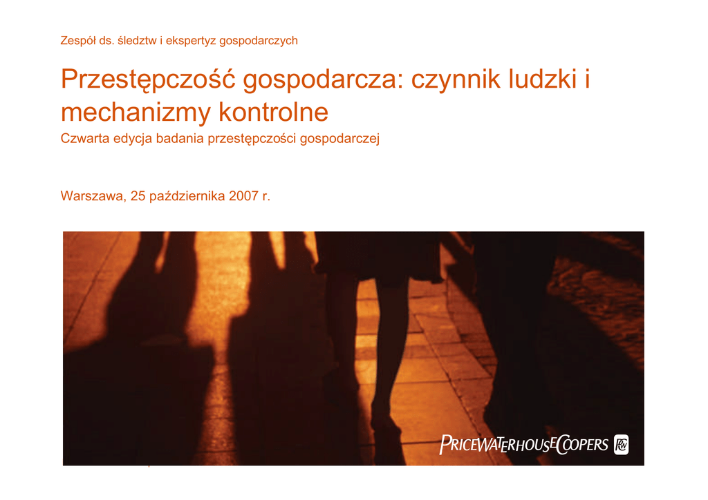 Zespół ds. ś ledztw i ekspertyz gospodarczych Przestępczoś ćgospodarcza: czynnik ludzki i mechanizmy kontrolne Czwarta edycja badania przestępczości gospodarczej Warszawa, 25 października 2007 r. PricewaterhouseCoopers LLP Plan prezentacji Metodologia badania Cel badania Kluczowe wyniki z Polski i ze świata Dyskusja i pytania PricewaterhouseCoopers LLP Metodologia badania Jednolita metodologia na cał ym świecie • • • • • Badanie przeprowadzane co dwa lata Przeprowadzono wywiady z czł onkami wyż szego kierownictwa 5.400 firm w 40 krajach, w tym ponad 100 wiodących przedsiębiorstw w Polsce Poprzez zastosowanie jednolitej metodologii badania umoż liwiliś my porównanie sytuacji w Polsce z innymi regionami na ś wiecie W celu zapewnienia cał kowitej anonimowoś ci respondentów, takż e i w tym roku wykonanie badania zleciliś my renomowanemu instytutowi badawczemu TNS Emnid Wspólna inicjatywa PricewaterhouseCoopers, wydział u prawa na Uniwersytecie im. Marcina Lutra (Halle-Wittenberg, Niemcy) oraz niezależ nego Centrum Badania Przestępczoś ci Gospodarczej (Economic Crime Research Survey) Badanie przestępczości gospodarczej 2007 PricewaterhouseCoopers Paź dziernik 2007 3 Cel badania Świadomośćzjawiska oraz kosztów związanych z przestępczościągospodarczą • Ustalenie, które przestępstwa gospodarcze popeł niane sąnajczęś ciej • Jakie koszty ponosząspół ki, w których dochodzi do przestępstw gospodarczych • Jak spół ki zabezpieczająsięprzed przestępczoś ciągospodarczą • Próba oceny czy przedsiębiorcy: - Sąś wiadomi jak duż ym zagroż eniem dla ich firmy może być przestępczoś ćgospodarcza, - Czy wiedząjak zachowaćsięw sytuacjach kryzysowych Badanie przestępczości gospodarczej 2007 PricewaterhouseCoopers Paź dziernik 2007 4 Kluczowe wyniki z Polski i ze świata Skala zjawiska Polska 57% 43% Europa Środkowa i Wschodnia 50% NIE • • 50% Świat 57% 43% TAK Liczba spół ek, które padł y ofiarami przestępczości gospodarczej spadł a o 11 p.p. w porównaniu z rokiem 2005 Występowanie przestępstw gospodarczych w polskich firmach zrównał o sięze średniąświatową Badanie przestępczości gospodarczej 2007 PricewaterhouseCoopers Paź dziernik 2007 5 Kluczowe wyniki z Polski i ze świata W Polsce istotnie wzrosł y straty z tytuł u przestępczości gospodarczej Średnia wysokośćstrat (mln USD ) Wielkośćstrat w spół kach (mln USD) 4 3.4 3 2.4 2 1.2 1 0 Polska • • • Europa Środkowa i Wschodnia Świat W Polsce średnie straty firmy będące efektem nadużycia wyniosł y ok. 1,2 mln USD – to prawie trzykrotnie więcej niżprzed dwoma laty W Europie Środkowej i Wschodniej średnia wartośćstrat związanych z nadużyciem wynosi średnio 3,4 mln USD a globalnie 2,4 mln USD 1/3 przedsiębiorstw poniosł a straty przekraczające 250 tys. USD Badanie przestępczości gospodarczej 2007 PricewaterhouseCoopers Paź dziernik 2007 6 Kluczowe wyniki z Polski i ze świata Sprzeniewierzenie aktywów wciążnajwiększąplagą Percepcja a faktyczne występowanie poszczególnych rodzajów przestępstw Sprzeniewierzenie aktywów Naruszenie wł asności intelektualnej Naduż ycia księgowe Korupcja Inne przestępstwa Pranie brudnych pieniędzy 0 5 10 występowanie • • 15 20 25 30 postrzeganie 35 % Sprzeniewierzenie aktywów wystąpił o u ponad 1/3 respondentów, przy czym 23% postrzegał o ten rodzaj naduż ycia jako najbardziej powszechny. Zaledwie 8% respondentów zgł osił o przypadki korupcji, jednakż e 27% badanych uważ a korupcjęza powszechną Badanie przestępczości gospodarczej 2007 PricewaterhouseCoopers Paź dziernik 2007 7 Kluczowe wyniki z Polski i ze świata Z 5 do 7 wzrosł a liczba mechanizmów kontrolnych w spół kach (1 z 2) Korporacyjne mechanizmy kontrolne zapobieganie • wykrywanie / zapobieganie wykrywanie W ciągu ostatnich 2 lat prawie 50% przedsiębiorstw wzmocnił o istniejące mechanizmy kontroli lub wprowadził o nowe rozwiązania Badanie przestępczości gospodarczej 2007 PricewaterhouseCoopers Paź dziernik 2007 8 Kluczowe wyniki z Polski i ze świata Z 5 do 7 wzrosł a liczba mechanizmów kontrolnych w spół kach (2 z 2) Kultura korporacyjna zapobieganie • • wykrywanie / zapobieganie wykrywanie Polskie przedsiębiorstwa wprowadzająwięcej metod zapobiegania niżwykrywania nadużyć Ciągle bardziej popularne jest wdrażanie korporacyjnych mechanizmów kontroli niż rozwój kultury korporacyjnej Badanie przestępczości gospodarczej 2007 PricewaterhouseCoopers Paź dziernik 2007 9 Kluczowe wyniki z Polski i ze świata Profil sprawcy najpoważniejszych nadużyć Profil przestępcy Wiek 31-40 lat (47%) Męż czyzna (80%) Pracownik organizacji do 2 lat (60%) Najwyższe kierownictwo firmy (41%) Badanie przestępczości gospodarczej 2007 PricewaterhouseCoopers Najczęstsze motywy Wystawny tryb życia Skł onnośćsprawcy do ulegania pokusom Przekonanie o braku konsekwencji finansowych Brak świadomości nt. wartości etycznych Zachęta materialna Paź dziernik 2007 10 Kluczowe wyniki z Polski i ze świata Odzyskiwanie strat Polska 15% Europa Środkowa i Wschodnia 21% 50% 35% nie odzyskano żadnych strat Świat 24% 63% 16% odzyskano 1% - 60% strat 58% 18% odzyskano 61% - 100% • Poł owie przedsiębiorstw nie udał o sięodzyskaćżadnych strat wynikł ych z popeł nionego nadużycia • 35% odzyskał o nie więcej niż60% utraconej wartości • W większości przypadków rekompensata pochodził a od organizacji lub osoby, która popeł nił a czyn Badanie przestępczości gospodarczej 2007 PricewaterhouseCoopers Paź dziernik 2007 11 Kluczowe wyniki z Polski i ze świata Wykrywanie przestępstw • Prawie poł owa przestępstw został a wykryta za pomocąwewnętrznych mechanizmów wprowadzonych w przedsiębiorstwie (w tym m.in. audyt wewnętrzny 22%, systemy zarządzania ryzykiem 7%, wewnętrzne systemy bezpieczeństwa 7%) • Istotne znaczenie miał y także informa