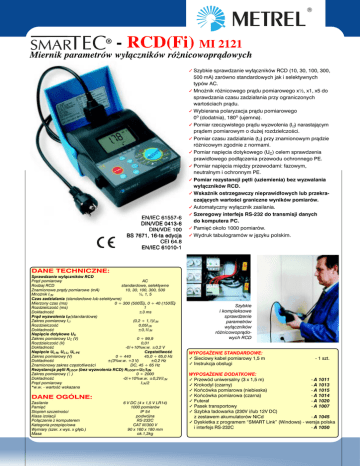 ® − RCD(Fi) MI 2121 Miernik parametrów wyłączników różnicowoprądowych EN/IEC 61557-6 DIN/VDE 0413-6 DIN/VDE 100 BS 7671, 16-ta edycja CEI 64.8 EN/IEC 61010-1 ✓ Szybkie sprawdzanie wy³¹czników RCD (10, 30, 100, 300, 500 mA) zarówno standardowych jak i selektywnych typów AC. ✓ Mno¿nik ró¿nicowego pr¹du pomiarowego x½, x1, x5 do sprawdzania czasu zadzia³ania przy ograniczonych wartoœciach pr¹du. ✓ Wybierana polaryzacja pr¹du pomiarowego 0o (dodatnia), 180o (ujemna). ✓ Pomiar rzeczywistego pr¹du wyzwolenia (I∆) narastaj¹cym pr¹dem pomiarowym o du¿ej rozdzielczoœci. ✓ Pomiar czasu zadzia³ania (t∆) przy znamionowym pr¹dzie ró¿nicowym zgodnie z normami. ✓ Pomiar napiêcia dotykowego (UC) celem sprawdzenia prawid³owego pod³¹czenia przewodu ochronnego PE. ✓ Pomiar napiêcia miêdzy przewodami: fazowym, neutralnym i ochronnym PE. ✓ Pomiar rezystancji pêtli (uziemienia) bez wyzwalania wy³¹czników RCD. ✓ WskaŸnik ostrzegawczy nieprawid³owych lub przekraczaj¹cych wartoœci graniczne wyników pomiarów. ✓ Automatyczny wy³¹cznik zasilania. ✓ Szeregowy interfejs RS-232 do transmisji danych do komputera PC. ✓ Pamiêæ oko³o 1000 pomiarów. ✓ Wydruk tabulogramów w jêzyku polskim. DANE TECHNICZNE: Sprawdzanie wy³¹czników RCD Pr¹d pomiarowy AC Rodzaj RCD standardowe, selektywne Znamionowe pr¹dy pomiarowe (mA) 10, 30, 100, 300, 500 ½, 1, 5 Mno¿nik I∆N Czas zadzia³ania (standardowe lub selektywne) Mierzony czas (ms) 0 ÷ 300 (500 S ), 0 ÷ 40 (150 S ) Rozdzielczoœæ (ms) 1 Dok³adnoœæ ±3 ms Pr¹d wyzwolenia I∆ (standardowe) (0,2 ÷ 1,1)I∆N Zakres pomiarowy I∆ Rozdzielczoœæ 0,05I∆N Dok³adnoœæ ±0,1I∆N Napiêcie dotykowe UC Zakres pomiarowy UC (V) 0 ÷ 99,9 Rozdzielczoœæ (V) 0,01 Dok³adnoœæ -0/+10%w.w. ±0,2 V Czêstotliwoœæ Napiêcie UL-N, UL-L, UL-PE Zakres pomiarowy (V) 0 ÷ 440 45,0 ÷ 65,0 Hz Dok³adnoœæ ±(3%w.w. +3 V) ±0,2 Hz Znamionowy zakres czêstotliwoœci DC, 45 ÷ 65 Hz Rezystancja pêtli RLOOP (bez wyzwolenia RCD) RLOOP=UC/I∆ N Zakres pomiarowy (Ω) 0 ÷ 2000 Dok³adnoœæ -0/+10%w.w. ±0,2V/I∆N Pr¹d pomiarowy I∆N/2 *w.w. - wartoœæ wskazana DANE OGÓLNE: Zasilanie Pamiêæ Stopieñ szczelnoœci Klasa izolacji Po³¹czenie z komputerem Kategoria przepiêciowa Wymiary (szer. x wys. x g³êb.) Masa 6 V DC (4 x 1,5 V LR14) 1000 pomiarów IP 54 podwójna RS-232C CAT III/300 V 90 x 160 x 180 mm ok.1,2kg Szybkie i kompleksowe sprawdzenie parametrów wy³¹czników ró¿nicowopr¹dowych RCD WYPOSA¯ENIE STANDARDOWE: ✓ Sieciowy kabel pomiarowy 1,5 m ✓ Instrukcja obs³ugi - 1 szt. WYPOSA¯ENIE DODATKOWE: ✓ Przewód uniwersalny (3 x 1,5 m) - A 1011 ✓ Krokodyl (czarny) - A 1013 ✓ Koñcówka pomiarowa (niebieska) - A 1015 ✓ Koñcówka pomiarowa (czarna) - A 1014 ✓ Futera³ - A 1020 ✓ Pasek transportowy - A 1007 ✓ Szybka ³adowarka (230V i/lub 12V DC) z zestawem akumulatorów NiCd - A 1045 ✓ Dyskietka z programem “SMART Link” (Windows) - wersja polska i interfejs RS-232C - A 1050