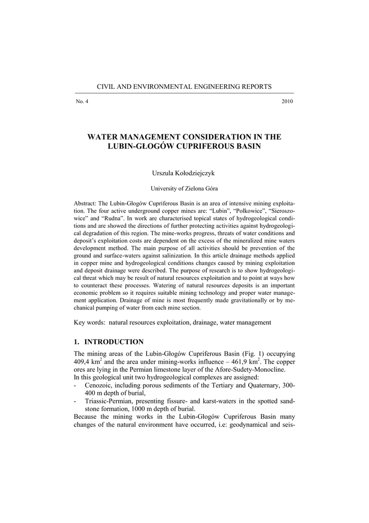 CIVIL AND ENVIRONMENTAL ENGINEERING REPORTS No. 4 2010 WATER MANAGEMENT CONSIDERATION IN THE LUBIN-GŁOGÓW CUPRIFEROUS BASIN Urszula Kołodziejczyk University of Zielona Góra Abstract: The Lubin-Głogów Cupriferous Basin is an area of intensive mining exploitation. The four active underground copper mines are: “Lubin”, “Polkowice”, “Sieroszowice” and “Rudna”. In work are characterised topical states of hydrogeological conditions and are showed the directions of further protecting activities against hydrogeological degradation of this region. The mine-works progress, threats of water conditions and deposit’s exploitation costs are dependent on the excess of the mineralized mine waters development method. The main purpose of all activities should be prevention of the ground and surface-waters against salinization. In this article drainage methods applied in copper mine and hydrogeological conditions changes caused by mining exploitation and deposit drainage were described. The purpose of research is to show hydrogeological threat which may be result of natural resources exploitation and to point at ways how to counteract these processes. Watering of natural resources deposits is an important economic problem so it requires suitable mining technology and proper water management application. Drainage of mine is most frequently made gravitationally or by mechanical pumping of water from each mine section. Key words: natural resources exploitation, drainage, water management 1. INTRODUCTION The mining areas of the Lubin-Głogów Cupriferous Basin (Fig. 1) occupying 409,4 km2 and the area under mining-works influence – 461,9 km2. The copper ores are lying in the Permian limestone layer of the Afore-Sudety-Monocline. In this geological unit two hydrogeological complexes are assigned: - Cenozoic, including porous sediments of the Tertiary and Quaternary, 300400 m depth of burial, - Triassic-Permian, presenting fissure- and karst-waters in the spotted sandstone formation, 1000 m depth of burial. Because the mining works in the Lubin-Głogów Cupriferous Basin many changes of the natural environment have occurred, i.e: geodynamical and seis- 112 Urszula KOŁODZIEJCZYK mic occurrences development, landscape changes, air- and soil-pollution, threats of sedateness of builder’s objects etc., the exploitation caused also the essential changes in the hydrogeological conditions. Commentary: 1. mine-areas border, 2. mine-shaft, 3. river-reception areas border, 4. afterflotation-wastes reservoir “Żelazny Most”, 5. after-flotation-wastes reservoir “Gilów”, 6. fillingsand open-pit, 7. reach of the water degradation around “Żelazny Most” reservoir, 8. reach of the water degradation around “Gilów” reservoir, 9. reach of the depression crater in the Permian limestone water layer, 10. reach of the depression crater in the Tertiary water layer, 11. troughs of the subsidences Fig. 1. Outline of the mine-areas of the Lubin-Głogów Cupriferous Basin 2. THE MINES INUNDATION The hydrogeological conditions of the exploitation [Bocheńska 1988, Kleczkowski A. et. al. 1990, Kołodziejczyk 2009] are mainly determined by the Permian water level (Permian limestone – P2), Triassic (spotted sandstone – Tp) and Tertiary (Oligocene – Tr) – Fig. 2. With respect of hydrogeological conditions, the Lubin-Głogów Cupriferous Basin was divided in a strong inundated southern part and weakly inundated northern part. The difference in the inundation between both parts is as 1:250. Considerable changes of the hydrogeological conditions are noted also in vertical section. The highest water bearing is con- WATER MANAGEMENT CONSIDERATION … 113 nected with the P2 layer – 500-600 m b.s.l. According to the deepness, the water mineralization and chemism are changing. The average water mineralization in the southern Lubin-Głogów Cupriferous Basin’s part is 4,1 g/dm3 and in the northern Lubin-Głogów Cupriferous Basin’s part is 150 g/dm3, what is connected with chlorides content increase. 3. THE HYDROGEOLOGICAL CONDITIONS CHANGES CAUSED BY MINING DRAINAGE The long-term mining drainage caused hydrogeological changes [Gurwin 1977; Gurwin Poprawski 1988; Markiewicz , Fiszer, Kalisz, Czmiel 2004). In the Permian limestone layer followed the reduction in the levels of water cavities (850-950 m deeper), depression crater radius achieved 55 km (Fig. 2) and drainage area achieved about 800 km2. The regional reduction in the levels of water cavities in the both layers: spotted sandstone and Tertiary layer achieved a maximal value 235 m, and drainage area was estimated about 1000 km2. In the other water bearing layers the drainage effects were considerable smaller. Commentary: 1. border of the water bearing complexes of the bed and overburden, 2. faults, 3. drillings, Q – Quaternary, Tr – Tertiary, Tp – Triassic period, P2 and P1 – Permian period Fig. 2. The geological section across the water bearing layers of the Afore-Sudety-Monocline At this time leaded piezometric observations are shown, that hydrodynamical relations in the drainage mines localities are not stable till yet. During the long- 114 Urszula KOŁODZIEJCZYK term mines drainage was carried away from the orogenic belt about 550-million m3 of water (Fig. 3). It is estimated, that till the end of mining exploitation will be carried away additionally about 1 billion m3 of water (Fig. 4). As the result of this activity will be observed the reduction in the piezometric water level in the all water bearing layers of the Afore-Sudety-Monocline, excluded Quaternary and top-Tertiary layers. Fig. 3. Pumped away water quantities from the Lubin-Głogów Cupriferous Basin mines in the following years (on the vertical axis: water inflows from the orogenic belt - million m3/year) Fig. 4. Forecasting sums of the water inflows from the orogenic belt [m3/min.] in the years 1991-2056 WATER MANAGEMENT CONSIDERATION … 115 It in relationship