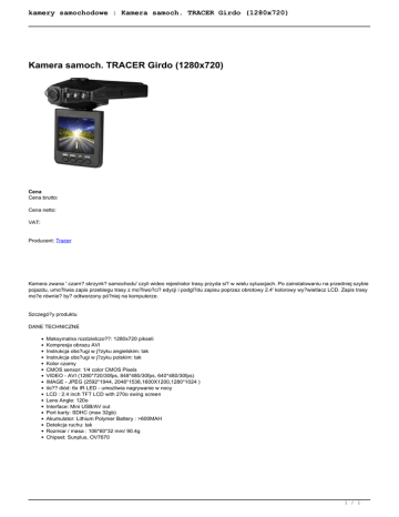 kamery samochodowe : Kamera samoch. TRACER Girdo (1280x720) Kamera samoch. TRACER Girdo (1280x720) Cena Cena brutto: Cena netto: VAT: Producent: Tracer Kamera zwana ' czarn? skrzynk? samochodu' czyli wideo rejestrator trasy przyda si? w wielu sytuacjach. Po zainstalowaniu na przedniej szybie pojazdu, umo?liwia zapis przebiegu trasy z mo?liwo?ci? edycji i podgl?du zapisu poprzez obrotowy 2.4' kolorowy wy?wietlacz LCD. Zapis trasy mo?e równie? by? odtworzony pó?niej na komputerze. Szczegó?y produktu DANE TECHNICZNE Maksymalna rozdzielczo??: 1280x720 pikseli Kompresja obrazu AVI Instrukcja obs?ugi w j?zyku angielskim: tak Instrukcja obs?ugi w j?zyku polskim: tak Kolor czarny CMOS sensor: 1/4 color CMOS Pixels VIDEO - AVI (1280*720/30fps, 848*480/30fps, 640*480/30fps) IMAGE - JPEG (2592*1944, 2048*1536,1600X1200,1280*1024 ) ilo?? diód: 6x IR LED - umozliwia nagrywanie w nocy LCD : 2.4 inch TFT LCD with 270o swing screen Lens Angle: 120o Interface: Mini USB/AV out Port karty: SDHC (max 32gb) Akumulator: Lithium Polymer Battery : >600MAH Detekcja ruchu: tak Rozmiar / masa : 106*60*32 mm/ 90.4g Chipset: Sunplus, OV7670 1 / 1 Powered by TCPDF (www.tcpdf.org)