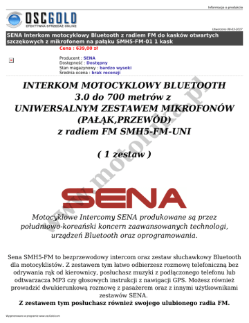Informacje o produkcie Utworzono 08-03-2017 SENA Interkom motocyklowy Bluetooth z radiem FM do kasków otwartych szczękowych z mikrofonem na pałąku SMH5-FM-01 1 kask Cena : 639,00 zł Producent : SENA Dostępność : Dostępny Stan magazynowy : bardzo wysoki Średnia ocena : brak recenzji ol uk a. pl INTERKOM MOTOCYKLOWY BLUETOOTH 3.0 do 700 metrów z UNIWERSALNYM ZESTAWEM MIKROFONÓW (PAŁĄK,PRZEWÓD) z radiem FM SMH5-FM-UNI w w .m ot ( 1 zestaw ) w Motocyklowe Intercomy SENA produkowane są przez południowo-koreański koncern zaawansowanych technologi, urządzeń Bluetooth oraz oprogramowania. Sena SMH5-FM to bezprzewodowy intercom oraz zestaw słuchawkowy Bluetooth dla motocyklistów. Z zestawem tym łatwo odbierzesz rozmowę telefoniczną bez odrywania rąk od kierownicy, posłuchasz muzyki z podłączonego telefonu lub odtwarzacza MP3 czy głosowych instrukcji z nawigacji GPS. Możesz również prowadzić dwukierunkową rozmowę z pasażerem oraz z innymi użytkownikami zestawów SENA. Z zestawem tym posłuchasz również swojego ulubionego radia FM. Wygenerowano w programie www.oscGold.com a. pl SENA SMH5-FM jest wyposażona w najnowszą technologię Bluetooth 3.0 zapewniającą bardzo szybki transfer dźwięku oraz pozwalającą obsługiwać wiele profili takich jak Headset Profile, Hands-Free Profile (HFP), Advanced Audio Distribution Profile (A2DP), Audio Video Remote Control Profile (AVRCP). Dzięki najnowszej technologii Bluetooth 3.0 i zaawansowanej technologii cyfrowego przetwarzania sygnału, SMH5-FM oferuje najlepszą jakość dźwięku zarówno dla przychodzącego jak i wychodzącego dźwięku w swojej klasie. Również łatwe i intuicyjne sterowanie urządzeniem sprawia, że SMH5 staje się idealnym i niezbędnym towarzyszem każdego motocyklisty. Najważniejsze cechy zestawu SMH5-FM : w w w .m ot ol uk bardzo szybki transfer dzięki technologii Bluetooth 3.0 bezprzewodowy zestaw głośnomówiący dla telefonów komórkowych, bezprzewodowy zestaw słuchawkowy stereo do urządzeń audio z możliwością zdalnego sterowania odtwarzaniem muzyki poprzez Bluetooth AVRCP: odtwarzanie, pauza, do przodu, do tyłu, bezprzewodowy zestaw słuchawkowy stereo do Nawigacji GPS, możliwość powiązania z dodatkowymi 3 intercomami SENA wraz z możliwością wyboru rozmówcy, możliwość powiązania wielu urządzeń Bluetooth na raz, np.: telefon, nawigacja, MP3, inny intercom, możliwość podłączenia 2 telefonów komórkowych na raz, indywidualna regulacja głośności dla każdego źródła dźwięku, łatwa, intuicyjna obsługa poprzez poręczny przycisk Jog Dial (Patent), głosowe komunikaty podczas ustawiania intercomu, krystalicznie czysty i naturalny dźwięk dzięki wzmacniaczowi sygnału dźwiękowego oraz automatycznej korekcji szumów, wodoszczelność, z powodzeniem można używać intercomów w czasie niepogody, zasięg intercomu do 700 metrów (760 stóp), do 7 godzin rozmowy, 6 dni czasu czuwania, bateria litowo-polimerowa, czas ładowania 2,5 godz., temperatura pracy od 10o C do + 55o C możliwość jednoczesnego używania intercomu oraz ładowania z gniazdka zapalniczki w czasie podróży, możliwość darmowego aktualizowania oprogramowania ze strony producenta, certyfikaty CE, FCC, TELEC, IC 2 lata gwarancji UWAGA: Poniższe punkty w większości przypadków odpowiadają punktom z pełnej instrukcji obsługi dostępnej na stronie www.senabluetooth.com w w w .m ot ol uk a. pl Informacje o produkcie Wygenerowano w programie www.oscGold.com
