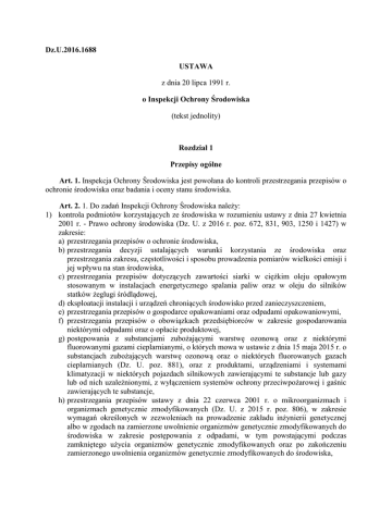 Dz.U.2016.1688 USTAWA z dnia 20 lipca 1991 r. o Inspekcji Ochrony Środowiska (tekst jednolity) Rozdział 1 Przepisy ogólne Art. 1. Inspekcja Ochrony Środowiska jest powołana do kontroli przestrzegania przepisów o ochronie środowiska oraz badania i oceny stanu środowiska. Art. 2. 1. Do zadań Inspekcji Ochrony Środowiska należy: 1) kontrola podmiotów korzystających ze środowiska w rozumieniu ustawy z dnia 27 kwietnia 2001 r. - Prawo ochrony środowiska (Dz. U. z 2016 r. poz. 672, 831, 903, 1250 i 1427) w zakresie: a) przestrzegania przepisów o ochronie środowiska, b) przestrzegania decyzji ustalających warunki korzystania ze środowiska oraz przestrzegania zakresu, częstotliwości i sposobu prowadzenia pomiarów wielkości emisji i jej wpływu na stan środowiska, c) przestrzegania przepisów dotyczących zawartości siarki w ciężkim oleju opałowym stosowanym w instalacjach energetycznego spalania paliw oraz w oleju do silników statków żeglugi śródlądowej, d) eksploatacji instalacji i urządzeń chroniących środowisko przed zanieczyszczeniem, e) przestrzegania przepisów o gospodarce opakowaniami oraz odpadami opakowaniowymi, f) przestrzegania przepisów o obowiązkach przedsiębiorców w zakresie gospodarowania niektórymi odpadami oraz o opłacie produktowej, g) postępowania z substancjami zubożającymi warstwę ozonową oraz z niektórymi fluorowanymi gazami cieplarnianymi, o których mowa w ustawie z dnia 15 maja 2015 r. o substancjach zubożających warstwę ozonową oraz o niektórych fluorowanych gazach cieplarnianych (Dz. U. poz. 881), oraz z produktami, urządzeniami i systemami klimatyzacji w niektórych pojazdach silnikowych zawierającymi te substancje lub gazy lub od nich uzależnionymi, z wyłączeniem systemów ochrony przeciwpożarowej i gaśnic zawierających te substancje, h) przestrzegania przepisów ustawy z dnia 22 czerwca 2001 r. o mikroorganizmach i organizmach genetycznie zmodyfikowanych (Dz. U. z 2015 r. poz. 806), w zakresie wymagań określonych w zezwoleniach na prowadzenie zakładu inżynierii genetycznej albo w zgodach na zamierzone uwolnienie organizmów genetycznie zmodyfikowanych do środowiska w zakresie postępowania z odpadami, w tym powstającymi podczas zamkniętego użycia organizmów genetycznie zmodyfikowanych oraz po zakończeniu zamierzonego uwolnienia organizmów genetycznie zmodyfikowanych do środowiska, 1a) 2) 3) 4) 5) 6) 7) 8) 9) 10) 11) 12) i) przestrzegania przepisów o recyklingu pojazdów wycofanych z eksploatacji, j) przestrzegania przepisów o zużytym sprzęcie elektrycznym i elektronicznym, z wyjątkiem przepisów art. 37 i art. 39 ustawy z dnia 11 września 2015 r. o zużytym sprzęcie elektrycznym i elektronicznym (Dz. U. poz. 1688), k) przestrzegania przepisów o bateriach i akumulatorach, z wyjątkiem przestrzegania przez sprzedawców detalicznych i sprzedawców hurtowych przepisów art. 8, art. 9, art. 10 ust. 1, art. 11, art. 31 ust. 3, art. 48-50, art. 53 oraz art. 54 ust. 1 i 2 ustawy z dnia 24 kwietnia 2009 r. o bateriach i akumulatorach (Dz. U. z 2015 r. poz. 687 i 1688); kontrola przestrzegania przepisów ustawy z dnia 13 września 1996 r. o utrzymaniu czystości i porządku w gminach (Dz. U. z 2016 r. poz. 250, 1020 i 1250); prowadzenie państwowego monitoringu środowiska, w szczególności: a) opracowywanie programów państwowego monitoringu środowiska, b) koordynacja realizacji zadań państwowego monitoringu środowiska, c) gromadzenie informacji o środowisku w zakresie ujętym w programach państwowego monitoringu środowiska, d) przetwarzanie zgromadzonych informacji o środowisku i dokonywanie ocen stanu środowiska, e) opracowywanie raportów o stanie środowiska, f) udział w międzynarodowej wymianie informacji o stanie środowiska, w tym koordynacja współpracy z Europejską Agencją Środowiska, o której mowa w rozporządzeniu Parlamentu Europejskiego i Rady (WE) nr 401/2009 z dnia 23 kwietnia 2009 r. w sprawie Europejskiej Agencji Środowiska oraz Europejskiej Sieci Informacji i Obserwacji Środowiska (Dz. Urz. UE L 126 z 21.05.2009, str. 13); podejmowanie decyzji wstrzymujących działalność prowadzoną z naruszeniem wymagań związanych z ochroną środowiska lub naruszeniem warunków korzystania ze środowiska; przeciwdziałanie poważnym awariom oraz sprawowanie nadzoru nad usuwaniem ich skutków; wykonywanie zadań związanych ze zbieraniem danych do Europejskiego Rejestru Uwalniania i Transferu Zanieczyszczeń oraz prowadzeniem Krajowego Rejestru Uwalniania i Transferu Zanieczyszczeń; wykonywanie zadań określonych w ustawie z dnia 3 października 2008 r. o udostępnianiu informacji o środowisku i jego ochronie, udziale społeczeństwa w ochronie środowiska oraz o ocenach oddziaływania na środowisko (Dz. U. z 2016 r. poz. 353, 831, 961 i 1250); udział w przekazywaniu do użytkowania obiektów lub instalacji realizowanych jako przedsięwzięcia mogące zawsze znacząco lub potencjalnie znacząco oddziaływać na środowisko; wykonywanie zadań w zakresie zapobiegania szkodom w środowisku i ich naprawy; wykonywanie zadań określonych w przepisach o międzynarodowym przemieszczaniu odpadów; wykonywanie zadań określonych w ustawie z dnia 10 lipca 2008 r. o odpadach wydobywczych (Dz. U. z 2013 r. poz. 1136 oraz z 2014 r. poz. 1101); kontrola wyrobów wprowadzonych do obrotu lub oddanych do użytku, podlegających ocenie zgodności w zakresie spełniania przez nie zasadniczych lub innych wymagań dotyczących ochrony środowiska; wykonywanie zadań z zakresu: a) ustawy z dnia 25 lutego 2011 r. o substancjach chemicznych i ich mieszaninach (Dz. U. z 2015 r. poz. 1203), b) rozporządzenia (WE) nr 1907/2006 Parlamentu Europejskiego i Rady z dnia 18 grudnia 2006 r. w sprawie rejestracji, oceny, udzielania zezwoleń i stosowanych ograniczeń w zakresie chemikaliów (REACH) i utworzenia Europejskiej Agencji Chemikaliów, zmieniającego dyrektywę 1999/45/WE oraz uchyl