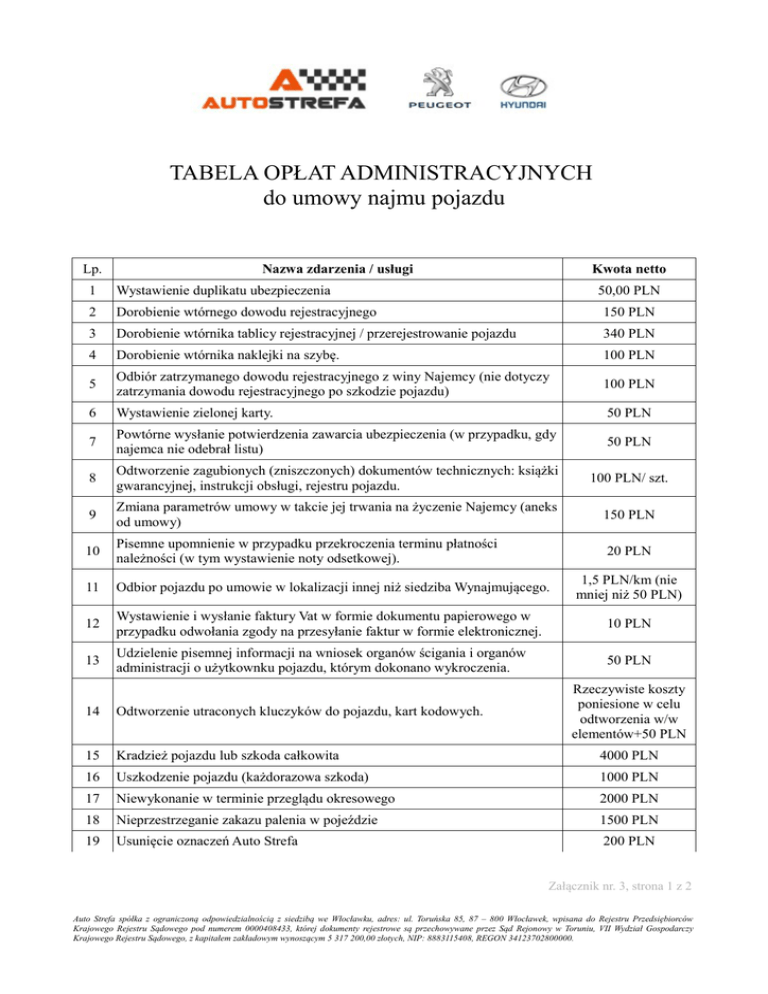 TABELA OPŁAT ADMINISTRACYJNYCH do umowy najmu pojazdu Lp. Nazwa zdarzenia / usługi Kwota netto 1 Wystawienie duplikatu ubezpieczenia 50,00 PLN 2 Dorobienie wtórnego dowodu rejestracyjnego 150 PLN 3 Dorobienie wtórnika tablicy rejestracyjnej / przerejestrowanie pojazdu 340 PLN 4 Dorobienie wtórnika naklejki na szybę. 100 PLN 5 Odbiór zatrzymanego dowodu rejestracyjnego z winy Najemcy (nie dotyczy zatrzymania dowodu rejestracyjnego po szkodzie pojazdu) 100 PLN 6 Wystawienie zielonej karty. 50 PLN 7 Powtórne wysłanie potwierdzenia zawarcia ubezpieczenia (w przypadku, gdy najemca nie odebrał listu) 50 PLN 8 Odtworzenie zagubionych (zniszczonych) dokumentów technicznych: książki gwarancyjnej, instrukcji obsługi, rejestru pojazdu. 100 PLN/ szt. 9 Zmiana parametrów umowy w takcie jej trwania na życzenie Najemcy (aneks od umowy) 150 PLN 10 Pisemne upomnienie w przypadku przekroczenia terminu płatności należności (w tym wystawienie noty odsetkowej). 20 PLN 11 Odbior pojazdu po umowie w lokalizacji innej niż siedziba Wynajmującego. 1,5 PLN/km (nie mniej niż 50 PLN) 12 Wystawienie i wysłanie faktury Vat w formie dokumentu papierowego w przypadku odwołania zgody na przesyłanie faktur w formie elektronicznej. 10 PLN 13 Udzielenie pisemnej informacji na wniosek organów ścigania i organów administracji o użytkownku pojazdu, którym dokonano wykroczenia. 50 PLN Rzeczywiste koszty poniesione w celu odtworzenia w/w elementów+50 PLN 14 Odtworzenie utraconych kluczyków do pojazdu, kart kodowych. 15 Kradzież pojazdu lub szkoda całkowita 4000 PLN 16 Uszkodzenie pojazdu (każdorazowa szkoda) 1000 PLN 17 Niewykonanie w terminie przeglądu okresowego 2000 PLN 18 Nieprzestrzeganie zakazu palenia w pojeździe 1500 PLN 19 Usunięcie oznaczeń Auto Strefa 200 PLN Załącznik nr. 3, strona 1 z 2 Auto Strefa spółka z ograniczoną odpowiedzialnością z siedzibą we Włocławku, adres: ul. Toruńska 85, 87 – 800 Włocławek, wpisana do Rejestru Przedsiębiorców Krajowego Rejestru Sądowego pod numerem 0000408433, której dokumenty rejestrowe są przechowywane przez Sąd Rejonowy w Toruniu, VII Wydział Gospodarczy Krajowego Rejestru Sądowego, z kapitałem zakładowym wynoszącym 5 317 200,00 złotych, NIP: 8883115408, REGON 34123702800000. 20 Zwrot pojazdu z zabrudzonym wnętrzem – konieczność prania tapicerki. 250 PLN 21 Zwrot nieumytego pojazdu. 60 PLN 22 Stawka za każdy dodatkowy przejechany kilometr ponad miesięczny limit 0,60 PL Podane ceny są kwotami netto – należy do nich doliczyć obowiązującą stawkę vat Oświadczam, że zapoznałem się z treścią niniejszego załącznika i zobowiazuję się do użytkowania pojazdu zgodnie z jego przeznaczeniem i w sposób należyty. ................................................ data i podpis Najemcy Załącznik nr. 3, strona 2 z 2 Auto Strefa spółka z ograniczoną odpowiedzialnością z siedzibą we Włocławku, adres: ul. Toruńska 85, 87 – 800 Włocławek, wpisana do Rejestru Przedsiębiorców Krajowego Rejestru Sądowego pod numerem 0000408433, której dokumenty rejestrowe są przechowywane przez Sąd Rejonowy w Toruniu, VII Wydział Gospodarczy Krajowego Rejestru Sądowego, z kapitałem zakładowym wynoszącym 5 317 200,00 złotych, NIP: 8883115408, REGON 34123702800000.