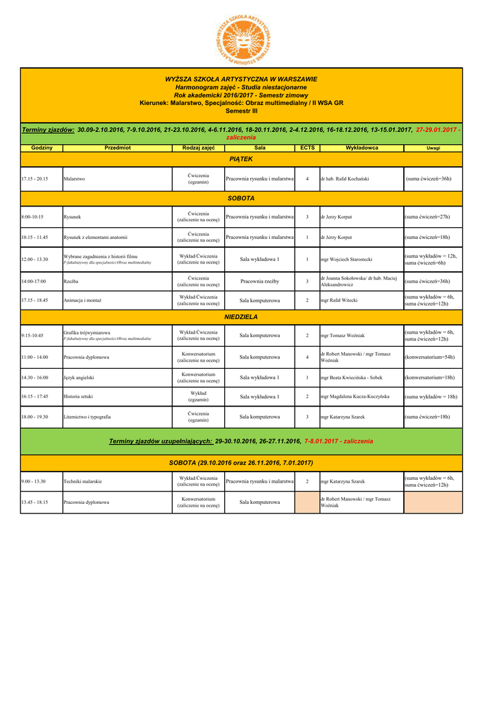 WYŻSZA SZKOŁA ARTYSTYCZNA W WARSZAWIE Harmonogram zajęć - Studia niestacjonarne Rok akademicki 2016/2017 - Semestr zimowy Kierunek: Malarstwo, Specjalność: Obraz multimedialny / II WSA GR Semestr III Terminy zjazdów: 30.09-2.10.2016, 7-9.10.2016, 21-23.10.2016, 4-6.11.2016, 18-20.11.2016, 2-4.12.2016, 16-18.12.2016, 13-15.01.2017, 27-29.01.2017 zaliczenia Godziny Przedmiot Rodzaj zajęć Sala ECTS Wykładowca Pracownia rysunku i malarstwa 4 dr hab. Rafał Kochański (suma ćwiczeń=36h) Uwagi PIĄTEK 17.15 - 20.15 Ćwiczenia (egzamin) Malarstwo SOBOTA 8:00-10:15 Rysunek Ćwiczenia (zaliczenie na ocenę) Pracownia rysunku i malarstwa 3 dr Jerzy Korput (suma ćwiczeń=27h) 10.15 - 11.45 Rysunek z elementami anatomii Ćwiczenia (zaliczenie na ocenę) Pracownia rysunku i malarstwa 1 dr Jerzy Korput (suma ćwiczeń=18h) Wykład/Ćwiczenia (zaliczenie na ocenę) Sala wykładowa 1 1 mgr Wojciech Starostecki (suma wykładów = 12h, suma ćwiczeń=6h) 12.00 - 13.30 Wybrane zagadnienia z historii filmu F-fakultatywny dla specjalności Obraz multimedialny 14:00-17:00 Rzeźba Ćwiczenia (zaliczenie na ocenę) Pracownia rzeźby 3 dr Joanna Sokołowska/ dr hab. Maciej Aleksandrowicz (suma ćwiczeń=36h) 17.15 - 18.45 Animacja i montaż Wykład/Ćwiczenia (zaliczenie na ocenę) Sala komputerowa 2 mgr Rafał Witecki (suma wykładów = 6h, suma ćwiczeń=12h) NIEDZIELA 9:15-10:45 Grafika trójwymiarowa F-fakultatywny dla specjalności Obraz multimedialny Wykład/Ćwiczenia (zaliczenie na ocenę) Sala komputerowa 2 mgr Tomasz Woźniak (suma wykładów = 6h, suma ćwiczeń=12h) 11.00 - 14.00 Pracownia dyplomowa Konwersatorium (zaliczenie na ocenę) Sala komputerowa 4 dr Robert Manowski / mgr Tomasz Woźniak (konwersatorium=54h) 14.30 - 16:00 Język angielski Konwersatorium (zaliczenie na ocenę) Sala wykładowa 1 1 mgr Beata Kwiecińska - Sobek (konwersatorium=18h) 16:15 - 17:45 Historia sztuki Wykład (egzamin) Sala wykładowa 1 2 mgr Magdalena Kucza-Kuczyńska (suma wykładów = 18h) 18.00 - 19.30 Liternictwo i typografia Ćwiczenia (egzamin) Sala komputerowa 3 mgr Katarzyna Szarek (suma ćwiczeń=18h) Terminy zjazdów uzupełniających: 29-30.10.2016, 26-27.11.2016, 7-8.01.2017 - zaliczenia SOBOTA (29.10.2016 oraz 26.11.2016, 7.01.2017) 9.00 - 13.30 Techniki malarskie Wykład/Ćwiczenia (zaliczenie na ocenę) Pracownia rysunku i malarstwa 13.45 - 18.15 Pracownia dyplomowa Konwersatorium (zaliczenie na ocenę) Sala komputerowa 2 mgr Katarzyna Szarek dr Robert Manowski / mgr Tomasz Woźniak (suma wykładów = 6h, suma ćwiczeń=12h)