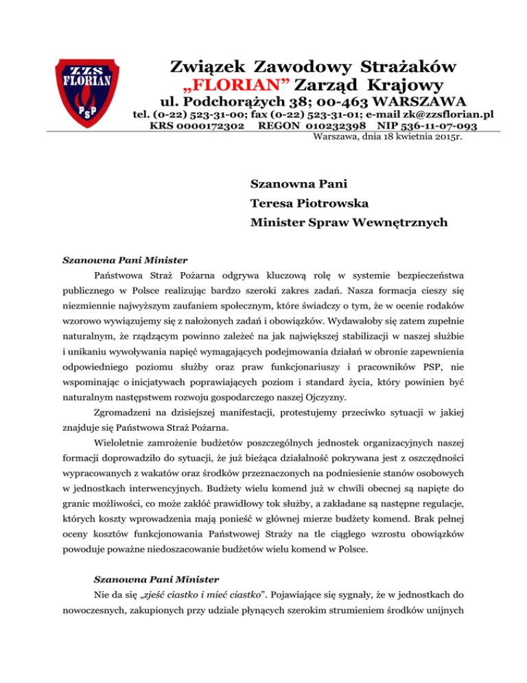 Związek Zawodowy Strażaków „FLORIAN” Zarząd Krajowy ul. Podchorążych 38; 00-463 WARSZAWA tel. (0-22) 523-31-00; fax (0-22) 523-31-01; e-mail [email protected] KRS 0000172302 REGON 010232398 NIP 536-11-07-093 Warszawa, dnia 18 kwietnia 2015r. Szanowna Pani Teresa Piotrowska Minister Spraw Wewnętrznych Szanowna Pani Minister Państwowa Straż Pożarna odgrywa kluczową rolę w systemie bezpieczeństwa publicznego w Polsce realizując bardzo szeroki zakres zadań. Nasza formacja cieszy się niezmiennie najwyższym zaufaniem społecznym, które świadczy o tym, że w ocenie rodaków wzorowo wywiązujemy się z nałożonych zadań i obowiązków. Wydawałoby się zatem zupełnie naturalnym, że rządzącym powinno zależeć na jak największej stabilizacji w naszej służbie i unikaniu wywoływania napięć wymagających podejmowania działań w obronie zapewnienia odpowiedniego poziomu służby oraz praw funkcjonariuszy i pracowników PSP, nie wspominając o inicjatywach poprawiających poziom i standard życia, który powinien być naturalnym następstwem rozwoju gospodarczego naszej Ojczyzny. Zgromadzeni na dzisiejszej manifestacji, protestujemy przeciwko sytuacji w jakiej znajduje się Państwowa Straż Pożarna. Wieloletnie zamrożenie budżetów poszczególnych jednostek organizacyjnych naszej formacji doprowadziło do sytuacji, że już bieżąca działalność pokrywana jest z oszczędności wypracowanych z wakatów oraz środków przeznaczonych na podniesienie stanów osobowych w jednostkach interwencyjnych. Budżety wielu komend już w chwili obecnej są napięte do granic możliwości, co może zakłóć prawidłowy tok służby, a zakładane są następne regulacje, których koszty wprowadzenia mają ponieść w głównej mierze budżety komend. Brak pełnej oceny kosztów funkcjonowania Państwowej Straży na tle ciągłego wzrostu obowiązków powoduje poważne niedoszacowanie budżetów wielu komend w Polsce. Szanowna Pani Minister Nie da się „zjeść ciastko i mieć ciastko”. Pojawiające się sygnały, że w jednostkach do nowoczesnych, zakupionych przy udziale płynących szerokim strumieniem środków unijnych samochodów brakuje pieniędzy, żeby zakupić paliwo musi budzić nasze najwyższe niezadowolenie i sprzeciw. Z najbliższych perspektyw nie wynika, aby ta sytuacja miała się poprawić. Czy to może dawać stabilizację w naszej i tak trudnej, wymagającej wielu poświęceń służbie? . Wynagrodzenia strażaków nie wzrosły od szeregu lat nawet o wysokość inflacji. Brak podwyżek w sytuacji gdy siła nabywcza pieniądza maleje powoduje, że realny standard życia funkcjonariuszy, pracowników PSP, a także ich rodzin zamiast pozostawać na stałym poziomie stale maleje - wywołuje to niezadowolenie i frustracje w naszych szeregach. Na domiar wszystkiego obserwujemy w naszej formacji w ostatnim okresie czasu brak rzeczywistego dialogu ze strona społeczną. Lepsze zawsze będzie wrogiem dobrego. Dialog, rozmowy, negocjacje leżą u podstaw demokratycznego państwa prawa, w którym żyjemy o które również związki zawodowe walczyły. Bierność rządzących w rozwiązywaniu naszych problemów, rodzi niepewność i poczucie niestabilności w naszym strażackim środowisku! Szanowna Pani Minister W związku z tym, że wszystkie z problemowych spraw, które wielokrotnie sygnowaliśmy, pozostają w gestii kierowanego przez Panią resortu. Oczekujemy! 1. Wzrostu uposażeń funkcjonariuszy Państwowej Straży Pożarnej. Oczekujemy zapewnienia realnego wzrostu uposażeń. W pierwszej kolejności waloryzacji uposażeń oraz zrekompensowania w przyszłym roku wysokości tych uposażeń o wskaźnik tzw. "skumulowanej inflacji" wyliczony za lata 2009 - 2014. 2. Opracowania i wdrożenia ustawy modernizacyjnej obejmującej w swoim zakresie wzrost nakładów na wydatki osobowe, poprawę warunków bezpieczeństwa i higieny pracy w służbie. Domagamy się opracowania i wdrożenia ustawy modernizacyjnej, która pozwoli strażakom godnie żyć, bezpiecznie i skutecznie służyć interesom naszej ojczyzny niosąc pomoc jej obywatelom. Pozwoli to długofalowo i systemowo rozwiązać problemy finansowe w naszej formacji ze szczególnym uwzględnieniem wzrostu nakładów na wydatki osobowe jak również poprawę warunków bezpieczeństwa i higieny pracy w Państwowej Straży Pożarnej. 3. Urealnienia budżetów komend. W chwili obecnej między innymi ze względu na: - wieloletnie zamrożenie wydatków budżetowych w jednostkach organizacyjnych, - wzrost cen towarów i usług, - ciągłe nakładanie dodatkowych obowiązków na Państwową Straż Pożarną, a za tym idący wzrost kosztów funkcjonowania, komendy miejskie/powiatowe borykają się z bardzo poważnymi trudnościami w płynnym regulowaniu zobowiązań. Powszechne jest „łatanie” braków na bieżące wydatki ze środków finansowych zaoszczędzonych z utrzymywanych wakatów oraz środków przeznaczonych pierwotnie wyłącznie na podniesienie dobowych stanów osobowych w jednostkach interwencyjnych. Budżety napięte są wielokrotnie do granic możliwości. Taki stan w służbie nie może mieć miejsca! 4. Wprowadzenia 100 % płatnych nadgodzin. W żadnym kraju europejskim strażak za swoją służbę w ponadnormatywnym czasie pracy nie dostaje jedynie 60 % uśrednionej dla wszystkich funkcjonariuszy stawki godzinowej. Coraz powszechniejszym zjawiskiem w kraju jest brak możliwości zapłacenia strażakom za wypracowane nadgodziny przy jednoczesnym braku możliwości odbioru tych godzin. Sytuacja taka dotyka najbardziej średnie i małe jednostki. 5. Podjęcia Inicjatywy Ustawodawczej Oczekujemy opracowania przez Ministerstwo Spraw Wewnętrznych inicjatywy legislacyjnej zmierzającej do zmiany ustaw pragmatycznych służb mundurowych w zakresie wprowadzenia 90 - dniowego okresu przejściowego w ustawie o "L4" 6. Ujednolicenia zasad emerytalnych dla funkcjonariuszy przyjętych do służby po 1 stycznia 