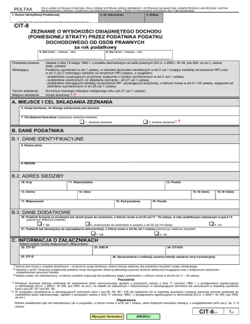 POLTAX POLA JASNE WYPEŁNIA PODATNIK, POLA CIEMNE WYPEŁNIA URZĄD SKARBOWY. WYPEŁNIAĆ NA MASZYNIE, KOMPUTEROWO LUB RĘCZNIE, DUŻYMI, DRUKOWANYMI LITERAMI, CZARNYM LUB NIEBIESKIM KOLOREM. PRZED WYPEŁNIENIEM ZAPOZNAĆ SIĘ Z OBJAŚNIENIAMI. 1. Numer Identyfikacji Podatkowej 2. Nr dokumentu 3. Status CIT-8 ZEZNANIE O WYSOKOŚCI OSIĄGNIĘTEGO DOCHODU (PONIESIONEJ STRATY) PRZEZ PODATNIKA PODATKU DOCHODOWEGO OD OSÓB PRAWNYCH za rok podatkowy 4. Od (dzień - miesiąc - rok) Podstawa prawna: 5. Do (dzień - miesiąc - rok) Ustawa z dnia 15 lutego 1992 r. o podatku dochodowym od osób prawnych (Dz.U. z 2000 r. Nr 54, poz.654, ze zm.), zwana dalej „ustawą”. Podatnicy wymienieni w art.1 ustawy, w zakresie dochodów określonych w art.3 ust.1 (mający siedzibę na terytorium RP) oraz w art.3 ust.2 (niemający siedziby na terytorium RP) ustawy, z wyjątkiem: - podatników uzyskujących przychody wyłącznie z tytułów wymienionych w art.2 ust.1 ustawy, - podatników zwolnionych od składania zeznania - art.27 ust.1 ustawy, - podatników niemających siedziby na terytorium RP, uzyskujących przychody, o których mowa w art.21 i 22 ustawy, wyłącznie od płatników wymienionych w art.26 ust.1 ustawy. Do końca trzeciego miesiąca następnego roku (art.27 ust.1 ustawy). Urząd skarbowy 1). ? Składający: Termin składania: Miejsce składania: A. MIEJSCE I CEL SKŁADANIA ZEZNANIA 6. Urząd skarbowy, do którego adresowane jest zeznanie 7. Cel złożenia formularza (zaznaczyć właściwy kwadrat): 2. korekta zeznania 2) ? 1. złożenie zeznania B. DANE PODATNIKA B.1. DANE IDENTYFIKACYJNE 8. Nazwa pełna 9. REGON B.2. ADRES SIEDZIBY 10. Kraj 11. Województwo 13. Gmina 12. Powiat 14. Ulica 15. Nr domu 17. Miejscowość 18. Kod pocztowy 16. Nr lokalu 19. Poczta B.3. DANE DODATKOWE 20. Podatnik korzysta ze zwolnienia lub utracił prawo do zwolnienia, o którym mowa w art.25 ust.11 - 16 ustawy, w roku podatkowym wykazanym w poz.4 i 5 (zaznaczyć właściwy kwadrat): 1. tak 2. utracił prawo do zwolnienia w związku z art.25 ust.14 ustawy 3. nie 21. Podatnik był obowiązany do sporządzenia dokumentacji, o której mowa w art.9a ust.1 ustawy (zaznaczyć właściwy kwadrat): 1. tak 2. nie C. INFORMACJA O ZAŁĄCZNIKACH Należy podać liczbę dołączonych załączników. 22. CIT-ST 25. CIT-D 23. SSE-R 24. CIT-8/O 26. Sprawozdanie o realizacji uznanej metody ustalania ceny transakcyjnej 1) Ilekroć jest mowa o urzędzie skarbowym - oznacza to urząd skarbowy, którym kieruje właściwy dla podatnika naczelnik urzędu skarbowego. 2) Zgodnie z art.81 Ordynacji podatkowej podatnik może skorygować złożoną deklarację poprzez złożenie deklaracji korygującej wraz z dołączonym pisemnym uzasadnieniem przyczyn korekty. 3) Należy podać rok kalendarzowy, w którym podatnik rozpoczął rok podatkowy objęty zwolnieniem, o którym mowa w art.25 ust.11 - 16 ustawy. Pouczenie *) Niniejsze zeznanie stanowi podstawę do wystawienia tytułu wykonawczego zgodnie z przepisami ustawy z dnia 17 czerwca 1966 r. o postępowaniu egzekucyjnym w administracji (Dz.U. z 2005 r. Nr 229, poz.1954, ze zm.), na odsetki od wykazanych i nieuiszczonych w obowiązujących terminach lub uiszczonych w niepełnej wysokości kwot z poz.59 - 81 i poz.83 - 90. **) W przypadku niewpłacenia w obowiązujących terminach kwot z poz.95, 98, 99 i 100 lub wpłacenia ich w niepełnej wysokości niniejsze zeznanie stanowi podstawę do wystawienia tytułu wykonawczego, zgodnie z przepisami ustawy z dnia 17 czerwca 1966 r. o postępowaniu egzekucyjnym w administracji (Dz.U. z 2005 r. Nr 229, poz.1954, ze zm.). Objaśnienia Rokiem podatkowym jest rok kalendarzowy lub w przypadku, o którym mowa w art.8 ust.1 ustawy, okres kolejnych dwunastu miesięcy, z uwzględnieniem art.8 ust.2, 2a, 3 i 6 ustawy. Wyczyść formularz DRUKUJ CIT-8 (21) 1/4 POLTAX POLA JASNE WYPEŁNIA PODATNIK, POLA CIEMNE WYPEŁNIA URZĄD SKARBOWY. WYPEŁNIAĆ NA MASZYNIE, KOMPUTEROWO LUB RĘCZNIE, DUŻYMI, DRUKOWANYMI LITERAMI, CZARNYM LUB NIEBIESKIM KOLOREM. PRZED WYPEŁNIENIEM ZAPOZNAĆ SIĘ Z OBJAŚNIENIAMI. D. USTALENIE DOCHODU / STRATY zł, gr D.1. PRZYCHODY 27. Przychody ze źródeł przychodów położonych na terytorium RP Bez przychodów, o których mowa w art.2 ust.1, art.21 i 22 ustawy, z zastrzeżeniem art.7 ust.3 ustawy. Przychody ze źródeł przychodów położonych poza terytorium RP Przychody równorzędne do kategorii przychodów wymienionych w art.21 ust.1 ustawy oraz przychody z dywidend i inne przychody z udziałów w zyskach osób prawnych niemających siedziby na terytorium RP. Przychody ze źródeł przychodów położonych poza terytorium RP – inne niż wymienione w poz.28 , 28. , 29. , 30. Razem przychody , Suma kwot z poz.27, 28 i 29 0,00 D.2. KOSZTY UZYSKANIA PRZYCHODÓW Koszty uzyskania przychodów wymienionych w poz.27 31. Koszty uzyskania przychodów wymienionych w poz.28 32. Koszty uzyskania przychodów wymienionych w poz.29 33. , , , 34. Razem koszty uzyskania przychodów , Suma kwot z poz.31, 32 i 33 0,00 34. D.3. DOCHÓD / STRATA , Dochód (art.7 ust.2 ustawy) 35. Od kwoty z poz.30 należy odjąć kwotę z poz.34. Jeżeli różnica jest liczbą ujemną, należy wpisać 0. Strata (art.7 ust.2 ustawy) 36. Od kwoty z poz.34 należy odjąć kwotę z poz.30. Jeżeli różnica jest liczbą ujemną, należy wpisać 0. Strata w związku z postanowieniami art.7 ust.3-4a ustawy oraz strata ze źródeł przychodów wykazanych w poz.29, podlegająca za granicą odliczeniu od dochodu do opodatkowania Dochód Jeżeli w poz.36 wpisano 0, do kwoty z poz.35 należy dodać kwotę z poz.37. Jeżeli kwota z poz.36 jest większa od 0, a kwota z poz.37 jest większa od kwoty z poz.36, od kwoty z poz.37 należy odjąć kwotę z poz.36. W pozostałych przypadkach należy wpisać 0. Strata Jeżeli kwota z poz.36 jest większa od 0 i większa od kwoty z poz.37, od kwoty z poz.36 należy odjąć kwotę z poz.37. W pozostałych przypadkach należy wpisać 0. , 0