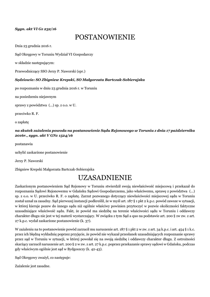 Sygn. akt VI Gz 232/16 POSTANOWIENIE Dnia 23 grudnia 2016 r. Sąd Okręgowy w Toruniu Wydział VI Gospodarczy w składzie następującym: Przewodniczący SSO Jerzy P. Naworski (spr.) Sędziowie: SO Zbigniew Krepski, SO Małgorzata Bartczak-Sobierajska po rozpoznaniu w dniu 23 grudnia 2016 r. w Toruniu na posiedzeniu niejawnym sprawy z powództwa (...) sp. z o.o. w U. przeciwko R. F. o zapłatę na skutek zażalenia powoda na postanowienie Sądu Rejonowego w Toruniu z dnia 17 października 2016r., sygn. akt V GNc 1524/16 postanawia uchylić zaskarżone postanowienie Jerzy P. Naworski Zbigniew Krepski Małgorzata Bartczak-Sobierajska UZASADNIENIE Zaskarżonym postanowieniem Sąd Rejonowy w Toruniu stwierdził swoją niewłaściwość miejscową i przekazał do rozpoznania Sądowi Rejonowemu w Gdańsku Sądowi Gospodarczemu, jako właściwemu, sprawę z powództwa (...) sp. z o.o. w U. przeciwko R. F. o zapłatę. Zarzut pozwanego dotyczący niewłaściwości miejscowej sądu w Toruniu został uznał za zasadny. Sąd pierwszej instancji podkreślił, że w myśl art. 187 § 1 pkt 2 k.p.c. powód zawsze w sytuacji, w której kieruje pozew do innego sądu niż ogólnie właściwy powinien przytoczyć w pozwie okoliczności faktyczne uzasadniające właściwość sądu. Fakt, że powód ma siedzibę na terenie właściwości sądu w Toruniu i oddawczy charakter długu nie jest w tej materii wystarczający. W związku z tym Sąd a quo na podstawie art. 200 § 1w zw. z art. 27 k.p.c. wydał zaskarżone postanowienie (k. 37). W zażaleniu na to postanowienie powód zarzucił mu naruszenie art. 187 § 1 pkt 2 w zw. z art. 34 k.p.c. i art. 454 § 1 k.c. przez ich błędną wykładnię poprzez przyjęcie, że powód nie wykazał przesłanek uzasadniających rozpoznanie sprawy przez sąd w Toruniu w sytuacji, w której powołał się na swoją siedzibę i oddawczy charakter długu. Z ostrożności skarżący zarzucił naruszenie art. 200 § 2 w zw. z art. 27 k.p.c. poprzez przekazanie sprawy sądowi w Gdańsku, podczas gdy właściwym ogólnie jest sąd w Bydgoszczy (k. 42-43). Sąd Okręgowy zważył, co następuje: Zażalenie jest zasadne. W pozwie powód powołał się na właściwość przemienną wynikającą z art. 34 k.p.c. w zw. z art. 454 k.c. wskazując, że jego siedzibą jest U., a dług ma charakter oddawczy (k. 4). Wbrew stanowisku Sądu pierwszej instancji, w świetle art. 187 § 1 pkt 2 k.p.c., wskazane okoliczności faktyczne są wystarczające do uzasadnienia właściwości przemiennej sądu w Toruniu, o której mowa w art. 34 k.p.c. Zgodnie z art. 34 k.p.c., powództwo o wykonanie umowy można wytoczyć przed sąd miejsca jej wykonania. Miejsce wykonania umowy, w braku wyraźnego oznaczenia go przez strony lub z uwagi na właściwość zobowiązania, określają reguły wyrażone w art. 454 k.c., wedle którego dług pieniężny ma charakter oddawczy, a zatem o miejscu jego spełnienia decyduje siedziba wierzyciela, a jeżeli zobowiązanie ma związek z przedsiębiorstwem wierzyciela – siedziba jego przedsiębiorstwa w chwili spełnienia świadczenia. Ponieważ siedzibą powoda i siedzibą jego przedsiębiorstwa jest U., a wiec miejscowość objęta właściwością Sądu Rejonowego w Toruniu - Sądu Gospodarczego, powód, korzystając z właściwości przemiennej, wytoczył powództwa przed sąd właściwy miejscowo. Zaskarżone postanowienie zapadło zatem z naruszeniem wymienionych unormowań, a zatem należało je uchylić (art. 386 § 1 w zw. z art. 397 § 1 i 2 zd. 1 k.p.c.). O kosztach postępowania zażaleniowego rozstrzygnie Sąd Rejonowy w orzeczeniu kończącym sprawę (art. 108 § 1 zd. 1 k.p.c.). Jerzy P. Naworski Zbigniew Krepski Małgorzata Bartczak-Sobierajska Zażalenie nie służy (...). (...) (...) (...) (...) (...) (...) (...) (...) (...) (...) (...)