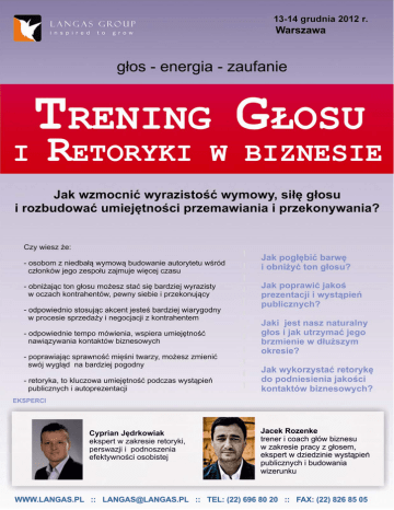 TRENING GŁOSU I RETORYKI W BIZNESIE Jak wzmocnić wyrazistość wymowy, siłę głosu i rozbudować umiejętności przemawiania i przekonywania? „Stanfordzkie badania dowodzą, że sposób mówienia wraz z mową ciała decydują w 93% o skuteczność w prezentowaniu swojego stanowiska i przekonaniu innych do swoich racji.” Jakość głosu znacząco determinuje sukces. Stanowi silny element kreowania osobistego i zawodowego wizerunku, wpływając tym samym na efektywność w kontaktach biznesowych. Dobra dykcja, swoboda wypowiedzi, pewny siebie głos mogą sprawić, że przekonasz innych do swoich racji, zmotywujesz zespół do pracy, domkniesz ważny kontrakt z klientem. Skuteczne przemawianie i zarządzanie własnym głosem wymaga dużej zręczności, którą należy stale pielęgnować, aby przynosiła określone wyniki. Jeżeli zależy Tobie na zdobyciu konkretnych narzędzi służących poprawie jakości dysponowania głosem i operowania słowem, tak aby nie tylko mówić dłużej i bez obciążeń, ale żeby również przygotować siebie do tworzenia argumentacji i obrony własnego stanowiska zapraszamy do udziału w szkoleniu. Opinie uczestników wcześniejszych edycji szkolenia: „Profesjonalne, ciekawe i praktyczne ćwiczenia” – Tomasz Fronczak, TFI PZU SA „Bardzo ciekawe szkolenie bez sztywnej formuły. Wzbudzające zainteresowanie.” – opinia anonimowa „Szkolenie było naprawdę na bardzo wysokim poziomie” – Katarzyna Czopor, Espol „Absolutnie fantastyczne. Bardzo wzbogaciło moją osobowość.” – Anna Dudzińska, PKP PLK „Serdecznie dziękuję – było super, bardzo interesujące szkolenie” – Kazimierz Peryt, PKP PLK Podczas szkolenia: − Rozwiniesz umiejętności wykorzystania pełnego spektrum swojego głosu − Poczujesz swobodę w posługiwaniu się głosem − Wzmocnisz jakość i przejrzystość swoich wypowiedzi − Poznasz technik rozluźniające napięcie związane z emisją głosu − Poznasz, w jaki sposób konstruować i wykorzystywać techniki argumentacji − Zdobędziesz umiejętności obrony własnego stanowiska przy wykorzystaniu zasad retoryki Pamiętaj, że inwestując swój czas i pieniądze w szkolenia organizowane przez Langas Group, możesz zawsze spodziewać się zwrotu z inwestycji! Stawiamy na Twoje maksymalne zadowolenie! Barbara Zielińska Kierownik Projektu [email protected] Szkolenie skierowane do: − Kadry menedżerskiej wyższego i średniego szczebla − Menedżerów zespołów, kierowników projektów − Dyrektorów handlowych − Trenerów − Osób, które reprezentują organizację, mają częsty kontakt z dużym audytorium Metodologia: Szkolenie ma charakter warsztatowy. Zajęcia prowadzone są metodami aktywnymi, z wykorzystaniem ćwiczeń indywidualnych i grupowych. Uczestnicy przechodzić będą ćwiczenia budujące kolejne umiejętności związane pracą nad rozwojem swoich możliwości głosowych oraz tych związanych z wypowiadaniem się. Langas Group ul. Krakowskie Przedmieście 79, 00-079 Warszawa www.langas.pl | [email protected] Tel: (22) 696 80 20 | Fax: (22) 826 85 05 Jak wzmocnić wyrazistość wymowy, siłę głosu i rozbudować umiejętności przemawiania i przekonywania? TRENING GŁOSU I RETORYKI W BIZNESIE JACEK ROZENEK AGENDA SZKOLENIA: DZIEŃ I 09.00 – 09.30 rejestracja uczestników 09.30 – 11.00 sesja I 11.00 – 11.15 przerwa 11.15 – 13.00 sesja II 13.00 – 13.45 obiad 13.45 – 15.15 sesja III 15.15 – 15.30 przerwa 15.30 – 17.00 sesja IV DZIEŃ II 08.30 – 09.00 rejestracja uczestników 09.00 – 10.30 sesja I 10.30 – 10.45 przerwa 10.45 – 12.45 sesja II 12.45 – 13.30 obiad 13.30 – 15.00 sesja III 15.00 – 15.15 przerwa 15.15 – 16.30 sesja IV Specjalista w dziedzinie komunikacji, zarządzania wrażeniem w biznesie, sprzedazy, zarządzania, kontaktów z trudnym Klientem. Prowadzi szkolenia oraz coaching z zakresu zaawansowanych technik zarządzania wrażeniem w relacjach biznesowych, technik wpływu, technik antymanipulacyjnych. Wykłada w Wyższej Szkole Przedsiębiorczości i Zarządzania im. Leona Koźmińskiego. Stworzył program szkolenia i coachingu „Technika Wpływu” dla polityków. W swojej karierze przeszedł wszystkie szczeble zarządzania – od specjalisty do dyrektora generalnego. Szkolił dla takich firm jak: Price Waterhouse Coopers, Ernst & Young, ISS Poland, Organon Poland, NBP, Nepentes, P.P.H.U. Rowitex Sp. z o.o., Sano Sp. z o.o., BRE Bank SA., EKO-PARK SA., Polskia Organizaca Pracodawców Osób Niepełnosprawnych, Hertz System Ltd. Sp. z o.o., METLIFE Towarzystwo ubezpieczeń na życie SA., Assesco Poland SA., Sodexho. CYPRIAN JĘDRKOWIAK Ekspert w zakresie retoryki,perswazji i podnoszenia efektywności osobistej. Z wykształcenia ekonomista o specjalności marketing. Ze szkoleniami związany od 1999 roku, kiedy to w firmie liczącej 800 pracowników stworzył i wprowadził program szkoleń z zakresu technik sprzedażowych i obsługi klienta. W tym czasie kierował zespołem marketingu, co wzmocniło jego zainteresowanie zachowaniami ludzi i szacowaniem skuteczności komunikacji, jak również wzbogaciło spojrzenie na marketing i zarządzanie w ujęciu psychologicznym. W pracy trenera dzieli się wiedzą, umiejętnościami, a także doświadczeniem, gdyż to, co przekazuje najpierw sprawdza w praktyce poprzez ciągłe doświadczanie. Prowadzi szkolenia związane z bezpośrednią obsługą klienta, kontrolą należności, sprzedażą indywidualną i biznesową. Realizował projekty m.in. dla: NOWA ERA Sp. z o.o., Volkswagen Polska Sp. z o.o., Zechik Sp. z o.o, Mercedes Benz Polska Sp. z o.o., Karlik - (Honda, Jaguar), VOLVO Polska, QuadWinkowski Sp. z o.o., Kompania Piwowarska Sp. z o.o., PHP Mercus Sp. z o.o., Sanitec Koło Sp. z o.o., CIECH SA, Franc Gardiner Sp. z o.o., Pharma Nord Sp. z o.o., Techko Sp. z o.o. Deichmann Obuwie Sp. z o.o., Schiever Polska (Auchan), THULE Polska Sp. z o.o., GRAPIL, CK ZETO Łódź, Omnicom Media Grou