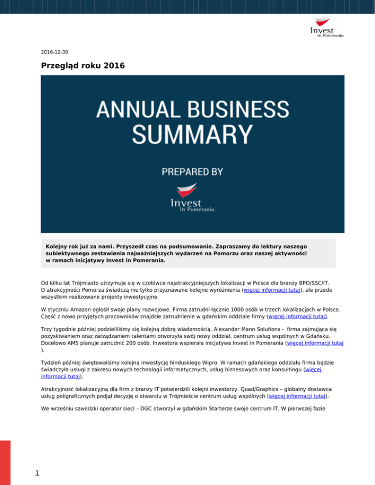 2016-12-30 Przegląd roku 2016 Kolejny rok już za nami. Przyszedł czas na podsumowanie. Zapraszamy do lektury naszego subiektywnego zestawienia najważniejszych wydarzeń na Pomorzu oraz naszej aktywności w ramach inicjatywy Invest in Pomerania. Od kilku lat Trójmiasto utrzymuje się w czołówce najatrakcyjniejszych lokalizacji w Polsce dla branży BPO/SSC/IT. O atrakcyjności Pomorza świadczą nie tylko przyznawane kolejne wyróżnienia (więcej informacji tutaj), ale przede wszystkim realizowane projekty inwestycyjne. W styczniu Amazon ogłosił swoje plany rozwojowe. Firma zatrudni łącznie 1000 osób w trzech lokalizacjach w Polsce. Część z nowo przyjętych pracowników znajdzie zatrudnienie w gdańskim oddziale firmy (więcej informacji tutaj). Trzy tygodnie później podzieliliśmy się kolejną dobrą wiadomością. Alexander Mann Solutions - firma zajmująca się pozyskiwaniem oraz zarządzaniem talentami otworzyła swój nowy oddział, centrum usług wspólnych w Gdańsku. Docelowo AMS planuje zatrudnić 200 osób. Inwestora wspierała inicjatywa Invest in Pomerania (więcej informacji tutaj ). Tydzień później świętowaliśmy kolejną inwestycję hinduskiego Wipro. W ramach gdańskiego oddziału firma będzie świadczyła usługi z zakresu nowych technologii informatycznych, usług biznesowych oraz konsultingu (więcej informacji tutaj). Atrakcyjność lokalizacyjną dla firm z branży IT potwierdzili kolejni inwestorzy. Quad/Graphics – globalny dostawca usług poligraficznych podjął decyzję o otwarciu w Trójmieście centrum usług wspólnych (więcej informacji tutaj). We wrześniu szwedzki operator sieci – DGC otworzył w gdańskim Starterze swoje centrum IT. W pierwszej fazie 1 projektu firma planuje zatrudnić 30 informatyków (więcej informacji tutaj), a miesiąc później Nordea ogłosiła swoje plany rozwojowe. Gdyński oddział powiększy się o kolejnych 100 specjalistów z zakresu IT a firma przeniesie się do nowej siedziby (więcej informacji tutaj). W ramach sektora nowoczesnych usług dla biznesu, w minionym roku zrealizowano także projekty spoza branży IT. Trójmiejskie centra usług dla biznesu nie tylko rozwijały się w ramach już prowadzonej działalności, ale także wprowadzały nowe procesy. Norweskie towarzystwo klasyfikacyjne - firma DNV GL podjęła decyzję o rozbudowie gdyńskiego oddziału spółki. W Trójmieście będą obsługiwane procesy biznesowe w zakresie finansów, księgowości operacyjnej, zarządzania zasobami ludzkimi, zamówień, oraz zarządzania nieruchomościami (więcej informacji tutaj). Amerykański Staples z kolei podjął decyzję o rozbudowie Globalnego Centrum Kompetencji w Gdańsku o Business Advantage - dywizji zajmującej się relacjami z biznesem (więcej informacji tutaj). Intel – największy pomorski inwestor z sektora IT rozbudowuje centrum HR o nowe funkcje. Z gdańskiego oddziału firmy będą prowadzone rekrutacje na stanowiska w filiach Intela znajdujących się w 38 krajach (więcej informacji tutaj ). W marcu informowaliśmy o inwestycji EY, który jako ostatni doradca z wielkiej czwórki otworzył swoje biuro w Gdańsku. W trójmiejskim oddziale firmy zatrudnienie znaleźli audytorzy oraz doradcy podatkowi (więcej informacji tutaj). W czerwcu szwedzki dostawca usług technicznych dla operatorów energetycznych, telekomunikacyjnych i komunalnych przy wsparciu inicjatywy Invest in Pomerania otworzył swoje biuro w Gdańsku. Firma planuje zatrudnić 80 specjalistów w zakresie finansów, zasobów ludzkich oraz wsparcia zakupów (więcej informacji tutaj). We wrześniu japoński producent z zakresu technologii optycznych oraz fotograficznych wykorzystywanych m.in. w branży medycznej podjął decyzję o otwarciu w Gdańsku europejskiego centrum usług wspólnych. W gdańskim oddziale będą obsługiwane procesy w obszarze finansów, zaopatrzenia i zasobów ludzkich (więcej informacji tutaj). W 2016 roku wiele również się działo w sektorze produkcyjnym. W styczniu informowaliśmy o inwestycji chińskiej firmy Chunxing. Chunxing Group to jeden z wiodących producentów komponentów aluminiowych na świecie. W Gdańsku otworzył prototypownię, a w ciągu najbliższych 3-4 lat planuje wybudować także duży zakład produkcyjny (więcej informacji tutaj). W kwietniu informowaliśmy o kolejnej inwestycji. Polski producent wciągarek, przeciągarek, wciągników oraz suwnic – firma Fama wybudowała nowy park maszynowy oraz centrum R&D w Gniewie. Łączny koszt inwestycji to ponad 40 mln PLN (więcej informacji tutaj). W Lęborku na terenach objętych Słupską SSE pojawili się pierwsi inwestorzy - AMG Sp. z o.o. oraz GRUPA SPORTEX S.C. reprezentujący branżę metalową, a także AJ FOOD Sp. z o.o. – firma świadcząca usługi logistyczne. Przedsiębiorcy zadeklarowali zatrudnienie na terenie Strefy łącznie ok. 230 osób (więcej informacji tutaj). W Słupsku z kolei producent pojemników plastikowych dla gospodarstw domowych – firma BranQ Sp. z o.o. podjęła decyzję o rozbudowie zakładu o dodatkową powierzchnię produkcyjną oraz magazyn. W słupskim Redzikowie zainwestowali także Laminopol Sp. z o.o (przetwórstwo żywic syntetycznych) oaz firma JAS-FBG (polski operator logistyczny). Laminopol wybuduje nowoczesny zakład produkcyjno-magazynowy z laboratorium, zapleczem socjalnym i biurowym. W ramach realizowanego projektu spółka JAS-FBG wybuduje magazyn spedycyjno-logistyczny przeznaczony dla obsługi spedycji krajowej (więcej informacji tutaj). Niewątpliwie najważniejszym projektem zrealizowanym w 2016 r. była budowa DCT2- drugiego głębokowodnego terminalu kontenerowego. DCT Gdańsk jest największym i najszybciej rozwijającym się polskim terminalem kontenerowym. Wraz z zawinięciem pierwszych statków z Dalekiego Wschodu obsługiwanych przez linię Maersk, Gdańsk zaczął przejmować rolę portu hubu dla krajów bałtyckich oraz Europy Środowo-Wschodniej. Inwe