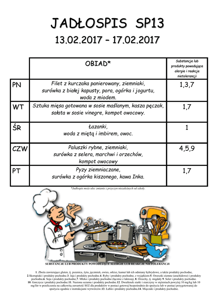 JADŁOSPIS SP13 13.02.2017 – 17.02.2017 OBIAD* Substancje lub produkty powodujące alergie i reakcje nietolerancji PN Filet z kurczaka panierowany, ziemniaki, surówka z białej kapusty, pora, ogórka i jogurtu, woda z miodem. 1,3,7 WT Sztuka mięsa gotowana w sosie maślanym, kasza pęczak, sałata w sosie vinegre, kompot owocowy. 1,7 ŚR Łazanki, woda z miętą i imbirem, owoc. 1 Paluszki rybne, ziemniaki, surówka z selera, marchwi i orzechów, kompot owocowy 4,5,9 Pyzy ziemniaczane, surówka z ogórka kiszonego, kawa Inka. 1,7 CZW PT *Jadłospis może ulec zmianie z przyczyn niezależnych od szkoły. SUBSTANCJE LUB PRODUKTY POWODUJĄCE ALERGIE LUB REAKCJE NIETOLERANCJI 1. Zboża zawierające gluten, tj. pszenica, żyto, jęczmień, owies, orkisz, kamut lub ich odmiany hybrydowe, a także produkty pochodne, 2.Skorupiaki i produkty pochodne.3. Jaja i produkty pochodne.4. Ryby i produkty pochodne, z wyjątkiem:5. Orzeszki ziemne (arachidowe) i produkty pochodne.6. Soja i produkty pochodne,7. Mleko i produkty pochodne (łącznie z laktozą), 8. Orzechy, tj. migdały 9. Seler i produkty pochodne. 10. Gorczyca i produkty pochodne.11. Nasiona sezamu i produkty pochodne.12. Dwutlenek siarki i siarczyny w stężeniach powyżej 10 mg/kg lub 10 mg/litr w przeliczeniu na całkowitą zawartość SO2 dla produktów w postaci gotowej bezpośrednio do spożycia lub w postaci przygotowanej do spożycia zgodnie z instrukcjami wytwórców.13. Łubin i produkty pochodne.14. Mięczaki i produkty pochodne.
