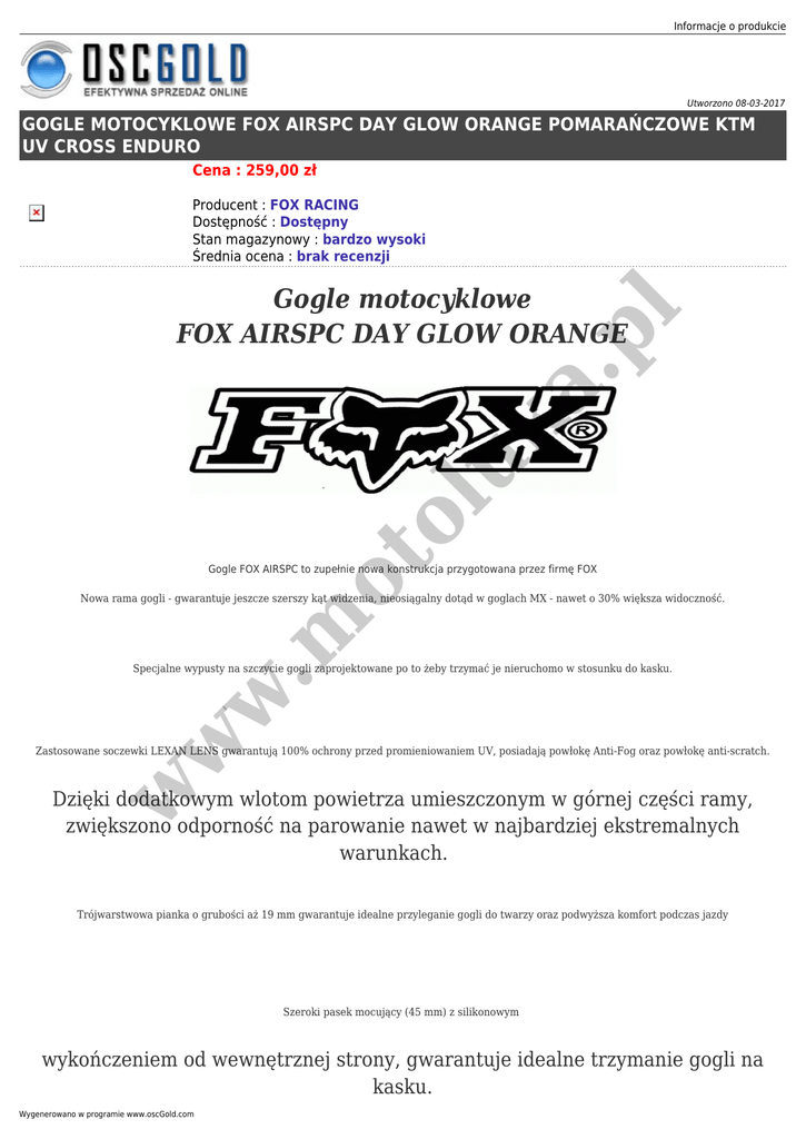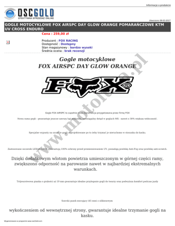 Informacje o produkcie Utworzono 08-03-2017 GOGLE MOTOCYKLOWE FOX AIRSPC DAY GLOW ORANGE POMARAŃCZOWE KTM UV CROSS ENDURO Cena : 259,00 zł Producent : FOX RACING Dostępność : Dostępny Stan magazynowy : bardzo wysoki Średnia ocena : brak recenzji ot ol uk a. pl Gogle motocyklowe FOX AIRSPC DAY GLOW ORANGE Gogle FOX AIRSPC to zupełnie nowa konstrukcja przygotowana przez firmę FOX .m Nowa rama gogli - gwarantuje jeszcze szerszy kąt widzenia, nieosiągalny dotąd w goglach MX - nawet o 30% większa widoczność. w w Specjalne wypusty na szczycie gogli zaprojektowane po to żeby trzymać je nieruchomo w stosunku do kasku. w Zastosowane soczewki LEXAN LENS gwarantują 100% ochrony przed promieniowaniem UV, posiadają powłokę Anti-Fog oraz powłokę anti-scratch. Dzięki dodatkowym wlotom powietrza umieszczonym w górnej części ramy, zwiększono odporność na parowanie nawet w najbardziej ekstremalnych warunkach. Trójwarstwowa pianka o grubości aż 19 mm gwarantuje idealne przyleganie gogli do twarzy oraz podwyższa komfort podczas jazdy Szeroki pasek mocujący (45 mm) z silikonowym wykończeniem od wewnętrznej strony, gwarantuje idealne trzymanie gogli na kasku. Wygenerowano w programie www.oscGold.com Cechy produktu: w w w .m ot ol uk a. pl - wypinany ochronny nosek w zestawie - piny na zrywki - jasna szybka - w zestawie pokrowiec na gogle - roll-off wraz szybką do kupienia akcesoryjnie