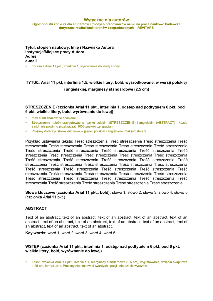 Wytyczne dla autorów Ogólnopolski konkurs dla studentów i młodych pracowników nauki na prace naukowo badawcze dotyczące rewitalizacji terenów zdegradowanych – REVITARE Tytuł, stopień naukowy, Imię i Nazwisko Autora Instytucja/Miejsce pracy Autora Adres e-mail czcionka Arial 11 pkt., interlinia 1, wyrównanie do lewej strony TYTUŁ: Arial 11 pkt, interlinia 1.5, wielkie litery, bold, wyśrodkowane, w wersji polskiej i angielskiej, marginesy standardowe (2,5 cm) STRESZCZENIE (czcionka Arial 11 pkt., interlinia 1, odstęp nad podtytułem 6 pkt, pod 6 pkt, wielkie litery, bold, wyrównanie do lewej) max 1000 znaków ze spacjami Streszczenie należy przygotować w języku polskim (STRESZCZENIE) i angielskim (ABSTRACT) i każde z nich nie powinno przekraczać 1000 znaków ze spacjami Prosimy dołączyć słowa kluczowe w języku polskim i angielskim, maksymalnie 5 Przykład ustawienia tekstu: Treść streszczenia Treść streszczenia Treść streszczenia Treść streszczenia Treść streszczenia Treść streszczenia Treść streszczenia Treść streszczenia Treść streszczenia Treść streszczenia Treść streszczenia Treść streszczenia Treść streszczenia Treść streszczenia Treść streszczenia Treść streszczenia Treść streszczenia Treść streszczenia Treść streszczenia Treść streszczenia Treść streszczenia Treść streszczenia Treść streszczenia Treść streszczenia Treść streszczenia Treść streszczenia Treść streszczenia Treść streszczenia Treść streszczenia Treść streszczenia Treść streszczenia Treść streszczenia Treść streszczenia Treść streszczenia Treść streszczenia Treść streszczenia Treść streszczenia Treść streszczenia Treść streszczenia Treść streszczenia Treść streszczenia Treść streszczenia Treść streszczenia Treść streszczenia Słowa kluczowe (czcionka Arial 11 pkt., bold): słowo 1, słowo 2, słowo 3, słowo 4, słowo 5 (czcionka Arial 11 pkt.) ABSTRACT Text of an abstract, text of an abstract, text of an abstract, text of an abstract, text of an abstract, text of an abstract, text of an abstract, text of an abstract, text of an abstract, text of an abstract, text of an abstract, text of an abstract. Key words: word 1, word 2, word 3, word 4, word 5 WSTĘP (czcionka Arial 11 pkt., interlinia 1, odstęp nad podtytułem 6 pkt, pod 6 pkt, wielkie litery, bold, wyrównanie do lewej) Tekst: czcionka Arial 11 pkt., interlinia 1, marginesy standardowe (2,5 cm), wyjustowanie, wcięcia akapitowe 1,25 cm, format .doc. Prosimy nie stosować twardych spacji i nie dzielić wyrazów. Przykład ustawienia tekstu: Treść referatu Treść referatu Treść referatu Treść referatu Treść referatu Treść referatu Treść referatu Treść referatu Treść referatu Treść referatu Treść referatu Treść referatu Treść referatu Treść referatu Treść referatu Treść referatu Treść referatu Treść referatu Treść referatu Treść referatu Treść referatu Treść referatu Treść referatu Treść referatu Treść referatu Treść streszczenia Treść streszczenia Treść streszczenia Treść streszczenia Treść streszczenia Treść streszczenia Treść streszczenia Treść streszczenia Treść streszczenia Treść streszczenia Treść streszczenia Treść streszczenia Treść streszczenia Treść streszczenia Treść streszczenia Treść streszczenia Treść streszczenia Treść streszczenia 1 ROZDZIAŁ (czcionka Arial 11 pkt., interlinia 1, odstęp nad podtytułem 6 pkt, pod 6 pkt., wielkie litery, bold, wyrównanie do lewej, wcięcie 0,5 cm, numerować cyframi arabskimi, w systemie dziesiętnym) 1.1. Podrozdział (czcionka Arial 11 pkt., interlinia 1, odstęp nad podtytułem 6 pkt., pod 6 pkt., bold, wyrównanie do lewej, wcięcie 0,75 cm) 1.1.1. Podrozdział (czcionka Arial 11 pkt., interlinia 1, odstęp nad podtytułem 6 pkt., pod 6 pkt., wyrównanie do lewej, wcięcie 1 cm) Odwołanie do literatury w nawiasie kwadratowym [1]. Ustawienie zgodnie z powołaniem na źródło, nie alfabetycznie. Odniesienie do elementów graficznych w tekście pisane z małej litery, np. (rys.1), (tab. 1), (fot.1) Przypisy: odwołania do przypisów w tekście głównym w formie liczb umieszczonych w górnym indeksie tak jak 1 na końcu tego zdania. Wypunktowanie: – półpauza jako znak wypunktowania, ustawienia jak w tekście ciągłym, czyli bez żadnych specjalnych ustawień, na końcu każdego punktu przecinek, ostatniego – kropka). Wzory (czcionka 11 ptk., 1,5 wiersza interlinii, wyśrodkowane, tabulator do prawej, gdyby nachodził na tekst powyżej zadać 6 pkt odstępu nad wzorem): kh gdzie: kh – ki hi – – ki hi hi (1) współczynnik filtracji równoległej (po „gdzie”, kh i półpauzie proszę wstawić tabulatory, nie dawać zbędnych spacji), współczynnik filtracji pojedynczej warstwy osadów, miąższość warstwy osadów. Elementy graficzne (po tytule, proszę podać źródło) Tabela 1. Tytuł tabeli: czcionka Arial 9 pkt., interlinia dokładnie 12 pkt., wyjustowane, z 6 pkt. odstępu pod tytułem, 1 wiersz odstępu nad tytułem tabeli oraz pod tabelą; czcionka w tabeli 8 pkt. z odstępem 1 pkt. nad i pod tekstem; wyśrodkowanie w komórkach danych liczbowych i nagłówków kolumn, wyrównanie do lewej tekstu. W przypadku tabeli, źródło proszę podać pod tabelą; przykład poniżej nazwa 1 nazwa nazwa nazwa nazwa aaaaaa bbbbbb 372,5 393,7 0,0 21,2 57264 68234 0 19 cccccc 461,5 89,0 81786 43 Przykładowy przypis Arial 8 pkt. dddddd 513,3 140,8 84857 48 Źródło: Opracowanie własne (Arial 9 pkt, 6 pkt odstępu nad i pod tytułem, wyrównane do lewej krawędzi tabeli) 160 158.10 153.86 150.91 147.57 144.60 140.90 137.78 134.32 150 140 130 Objętość maksymalnej retencji chwilowej [mln m3] 126.85 120 119.17 114.39 110.21 106.83 103.05 110 100 99.31 95.07 90 90.10 86.38 82.83 80 79.22 74.27 70 67.17 60 59.86 53.89 50 46.80 40 40.13 35.19 30 26.21 20 18.71 13.91 10 0 0.31 370 1.69 3.73 375 6.33 9.11 38