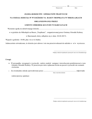 …………………………….., dn. ………………………….. Miejscowość Data ZGODA RODZICÓW / OPIEKUNÓW PRAWNYCH/ NA UDZIAŁ DZIECKA W WYJEŹDZIE NA BASEN TROPIKANA W MIKOŁAJKACH ORGANIZOWANEJ PRZEZ GMINNY OŚRODEK KULTURY W BARCIANACH Wyrażam zgodę na udział mojego dziecka ............................................................... ................................. w wyjeździe do Mikołajek na Basen „Tropikana”, zorganizowanej przez Gminny Ośrodek Kultury w Barcianach, który odbędzie się w dniu 02.02.2017r. Wyjazd o godzinie 10:00, plac vis-a-vis banku. Jednocześnie oświadczam, że dziecko jest zdrowe i nie ma przeciwwskazań do udziału w w/w wycieczce. ...................................................................... Podpisy rodziców/opiekunów prawnych/ oraz nr tel. Kontaktowego Uwagi: W przypadku rezygnacji z wycieczki, należy znaleźć zastępcę i niezwłocznie poinformować o tym Gminny Ośrodek Kultury. W przeciwnym razie wpłacona kwota na poczet wycieczki nie zostanie zwrócona. Za ewentualne szkody spowodowane przez ...................................................................... odpowiada Imię i nazwisko dziecka rodzic/prawny opiekun/. ...................................................................... Podpisy rodziców/opiekunów prawnych/ oraz nr tel. kontaktowego