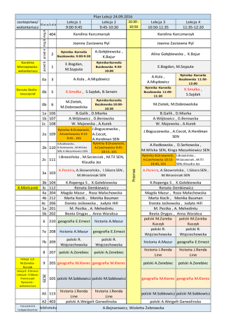Karolina Mierzejewskawolontariusz Danuta Dadia nauczyciel przed B przed A Ang B Ang A zastepstwa/ klasa/sala wolontariusz 404 Lekcja 1 9:00-9:45 Joanna Zastawna Ryl Joanna Zastawna Ryl Rytmika -Kornelia A.Gołębiewska , K.Bajur Alina Gołębiewska , K.Bajur E.Bogdan, M.Szyputa Rytmika-Kornelia Buczkowska 9:3010:00 E.Bogdan, M.Szyputa 0a 3 A.Kula , A.Miądowicz A.Kula , A.Miądowicz Rytmika- Kornelia Buczkowska 11:3012:00 0b 5 K.Smułka , S.Sajdak, B.Serwin Rytmika -Kornelia Buczkowska 11:0011:30 K.Smułka , S.Sajdak 0b 6 M.Zietek, M.Dobrowolska Rytmika-Kornelia Buczkowska 10:0010:30 M.Zietek, M.Dobrowolska B.Galik , D.Miarka A.Wójtowicz , D.Berowska W. Majewska , A.Kurek Rytmika B.Drzewiecki, J.Boguszewska , 2a 109 A.Czechowska 9:15- A.Cecot, 9:45 , 101 A.Herdman SEN 2b 110 A.Radkowska , D.Serkowska , M.Wilska SEN, K.Mazurkiewicz SEN J.Boguszewska , A.Cecot, A.Herdman SEN Rytmika B.Drzewiecki, A.Czechowska 9:4510:15, 101 A.Radkowska , D.Serkowska , M.Wilska SEN, Kinga Mazurkiewicz SEN Rytmika B.Drzewiecki, I.Brzezińska , A.Czechowska 10:15- M.Szczesiak , M.Til 10:45, 101 SEN, Klaudia Jez 3a 103 A.Pereira, A.Skowrońska , I.Sikora SEN , M.Wrześniak SEN A.Pereira, A.Skowrońska , I.Sikora SEN , M.Wrześniak SEN 104 112 204 212 206 201 202 K.Ropenga S , K.Golebiewska Renata Demkiewicz Magda Mazur , Roza Małachowska Marta Kocik , Monika Bauman Dorota Jaśkowska , Judyta Hill M. Pestka , A. Mehedintu Beata Drygas , Anna Waraksa 7a 208 historia A.Mazur 7b 209 polski R. Wojciechowska 8 207 polski A.Zerebiec historia A.Mazur geografia E.Ernest historia A.Mazur geografia E.Ernest polski A.Zerebiec historia J.Renda Line historia J.Renda Line polski A.Zerebiec polski A.Zerebiec GCSE 105 polski M.Sobkowicz polski M.Sobkowicz A2 403 biblioteka K.Ropenga S , K.Golebiewska Renata Demkiewicz Magda Mazur , Roza Małachowska Marta Kocik , Monika Bauman Dorota Jaśkowska , Judyta Hill M. Pestka , A. Mehedintu Beata Drygas , Anna Waraksa polski M.Zareba polski M.Zareba Kuszyk Kuszyk polski R. polski R. Wojciechowska Wojciechowska polski R. Wojciechowska 9 205 geografia M.Kieres geografia M.Kieres AS 113 Przerwa I.Brzezińska , M.Szczesiak , M.Til SEN, Klaudia Jez 6 210 geografia E.Ernest na ucza ni e i ndywi dua l ne B.Galik , D.Miarka A.Wójtowicz , D.Berowska W. Majewska , A.Kurek 2c 111 3b K.Mielcarek 3c 4a 4b 4c 5a 5b lekcja3 - E.Ernest Lekcja4 - E.Mazur Franiciszek Rymarski wolontariusz Lekcja 4 11:35-12:20 Karolina Karczmarzyk 1a 106 1b 107 1c 108 l ekcja 1,2M.Za reba Kus zyk Lekcja 3 10:50-11:35 Karolina Karczmarzyk 2 Buczkowska 9:00-9:30 1 Plan Lekcji 24.09.2016 10:30 Lekcja 2 10:50 9:45-10:30 historia J.Renda historia J.Renda Line Line polski A.Weigelt Garwolinska geografia M.Kieres geografia M.Kieres polski M.Sobkowicz polski M.Sobkowicz polski A.Weigelt Garwolinska A.Bejnarowicz, Wioletta Żebrowska